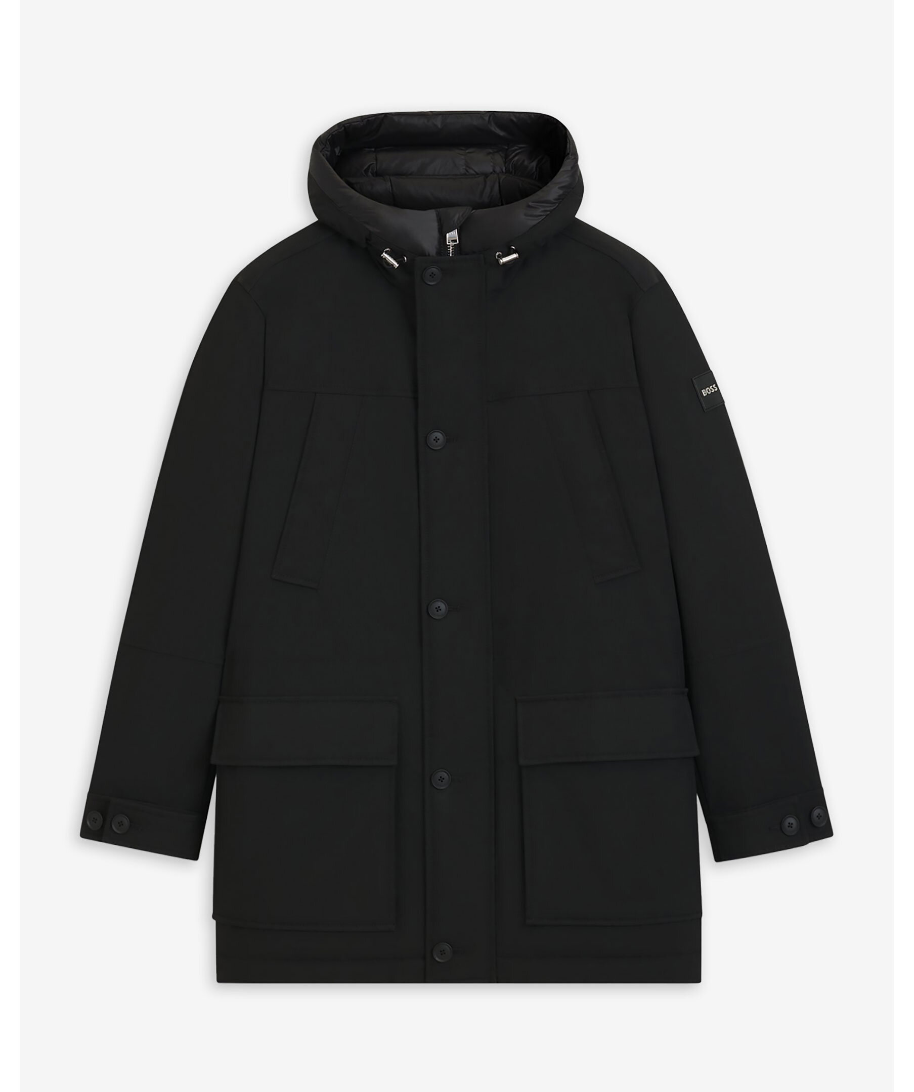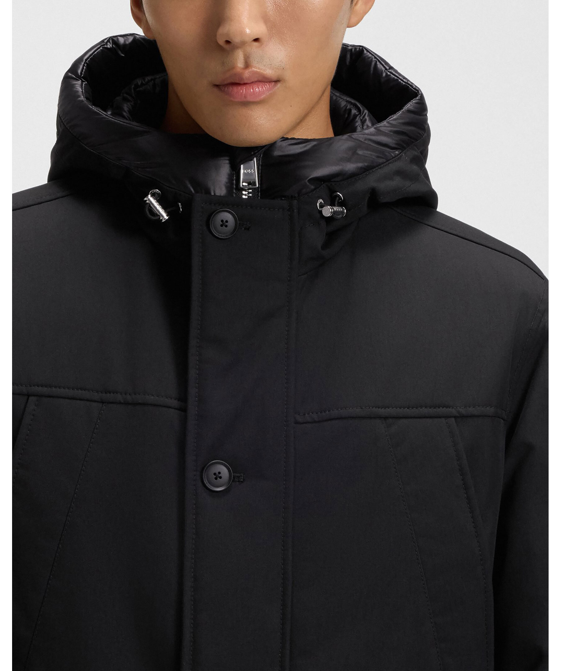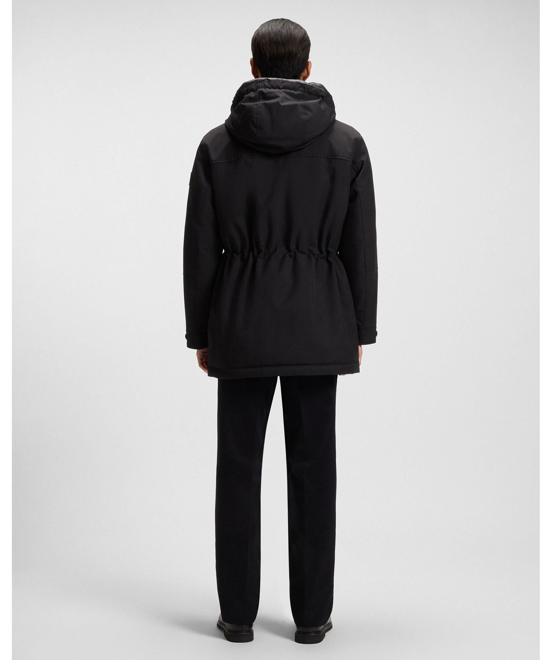 Svart dunjacka från BOSS med justerbar huva, certifierad ankdun och fyllning samt vattenavstötande egenskaper. Flera fickor fram, dragsko i midjan samt logga på vänster ärm.