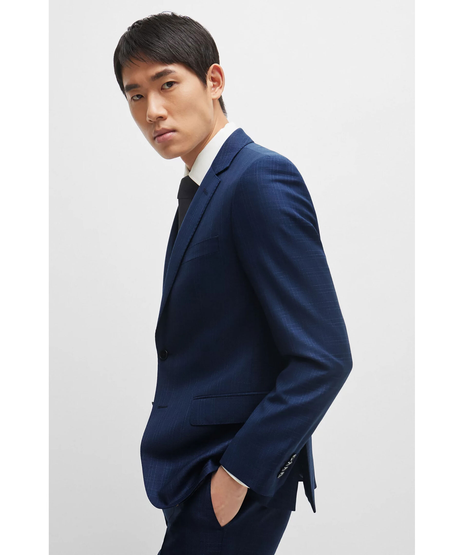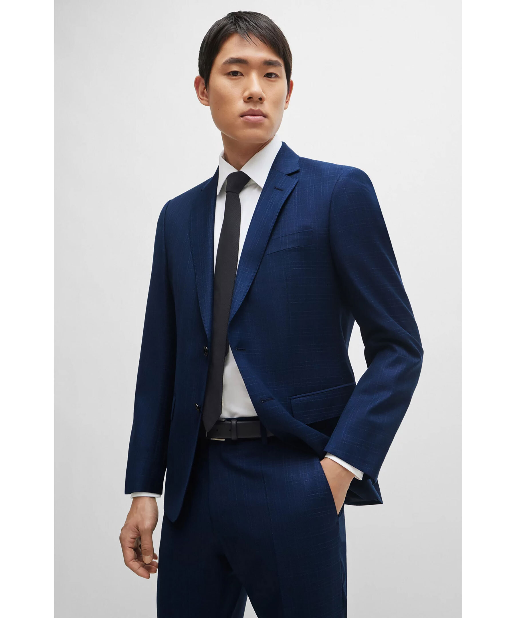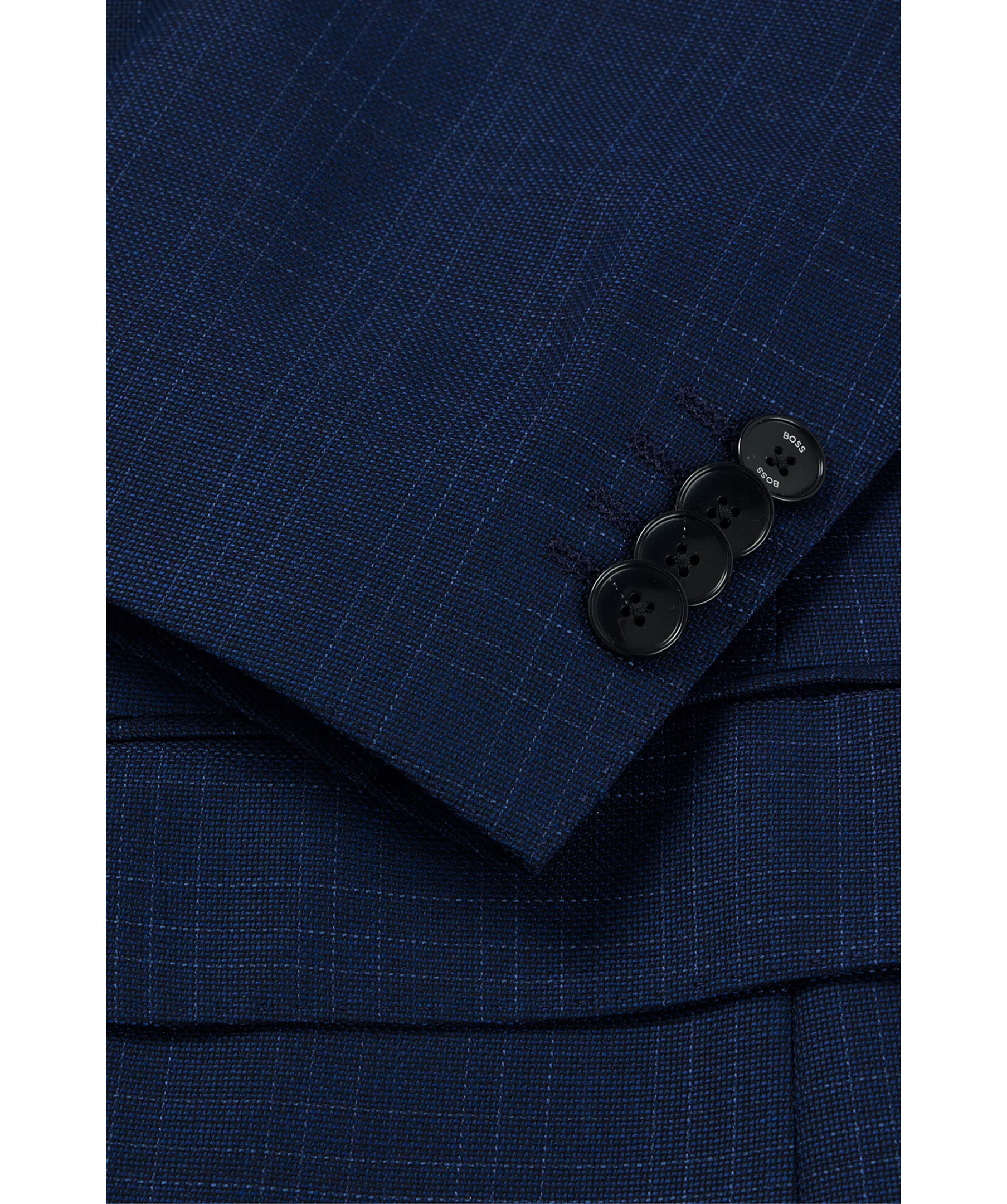 Mörkblå kostym från BOSS Black. Vävd med en sergeteknik för att skapa en modern rutig look. Denna tvådelade kostym är tillverkad i ull för en raffinerad look och känsla. Den slimmade passformen ger en ren siluett. Naggade slag, två knappar framtill. En welt bröstficka samt två fickor med lock. Manschetter med knapp, sidoventil samt helfodrad. Byxorna har två sidfickor samt två bakfickor med knapp. Bälteshällor i midjan. Slimmad passform.