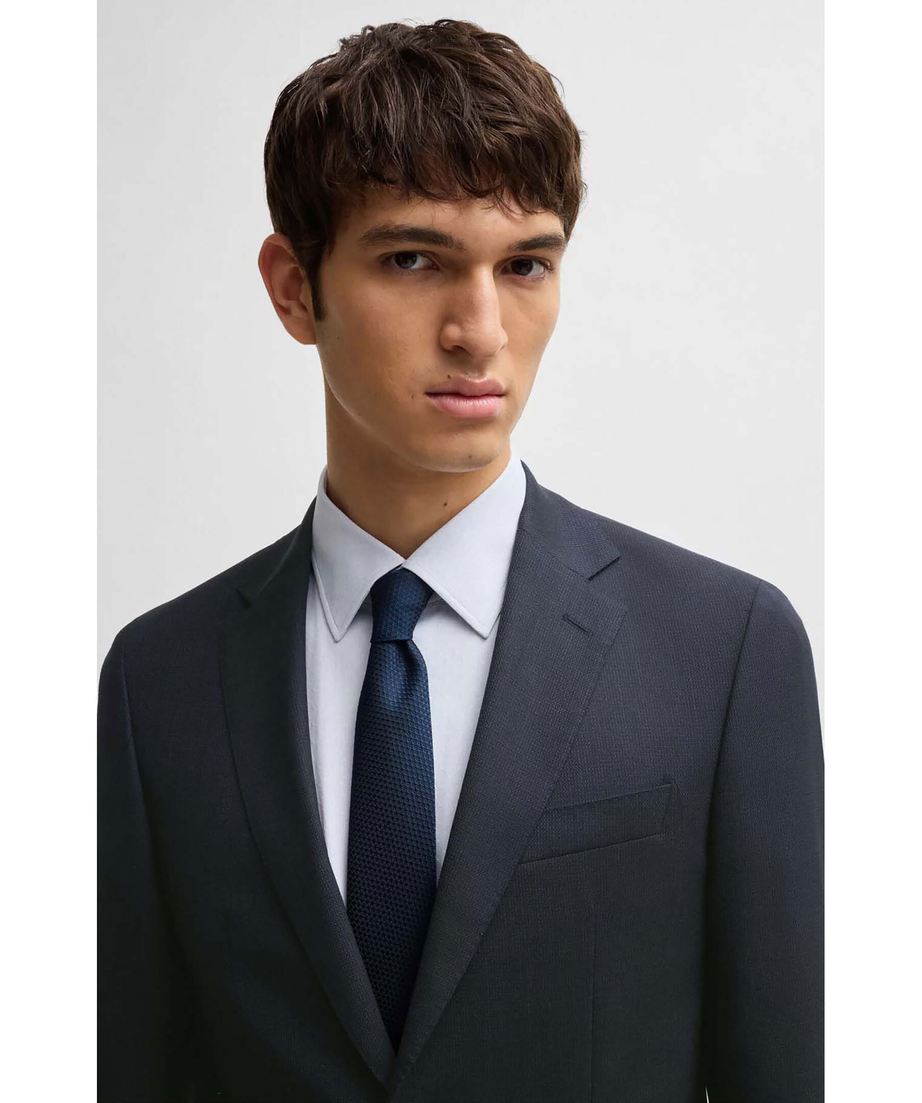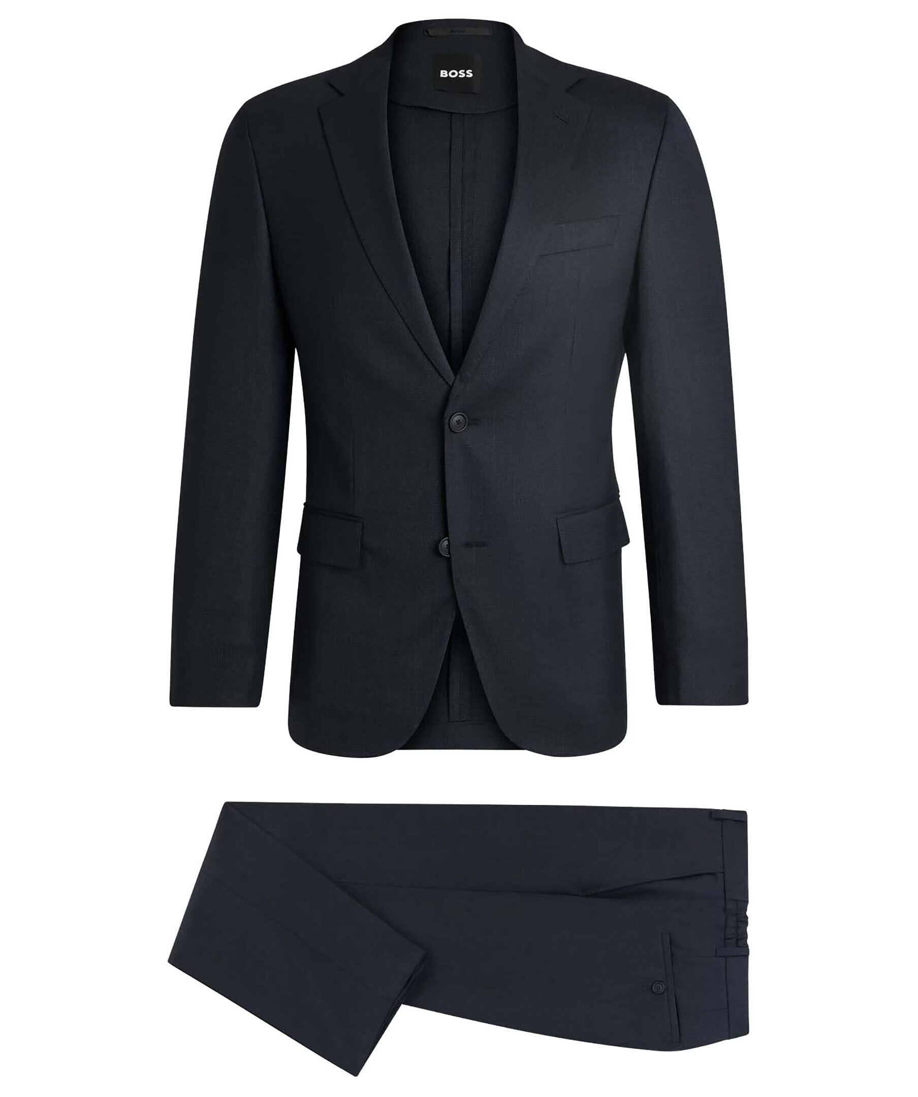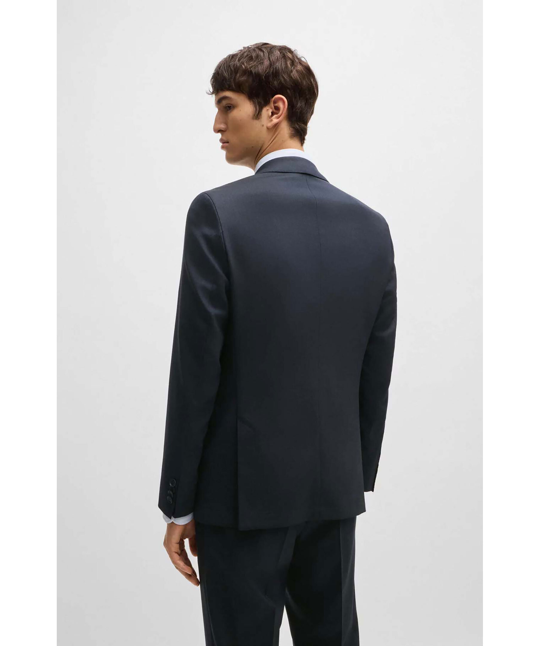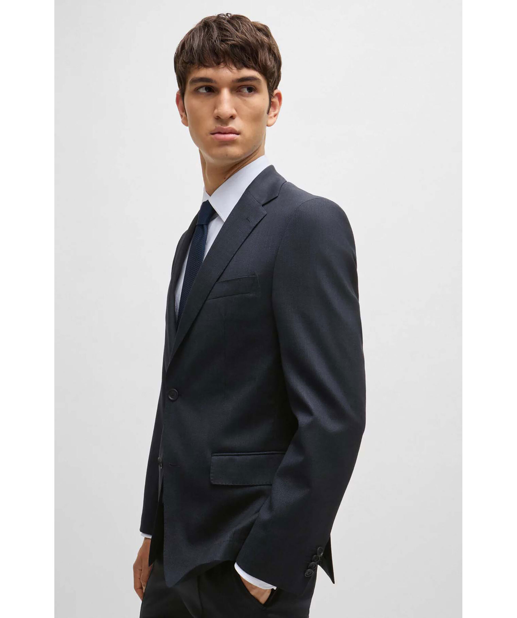 Mörkblå kostymset från BOSS Black. Kostymen har ett mikromönster, kavajen stängs med två knappar och har två fickor med lock samt en bröstficka. Byxorna har bälteshällor i midjan, två sidfickor samt två passpoalfickor baktill med knapp. Tillverkad av en ullblandning med stretch.