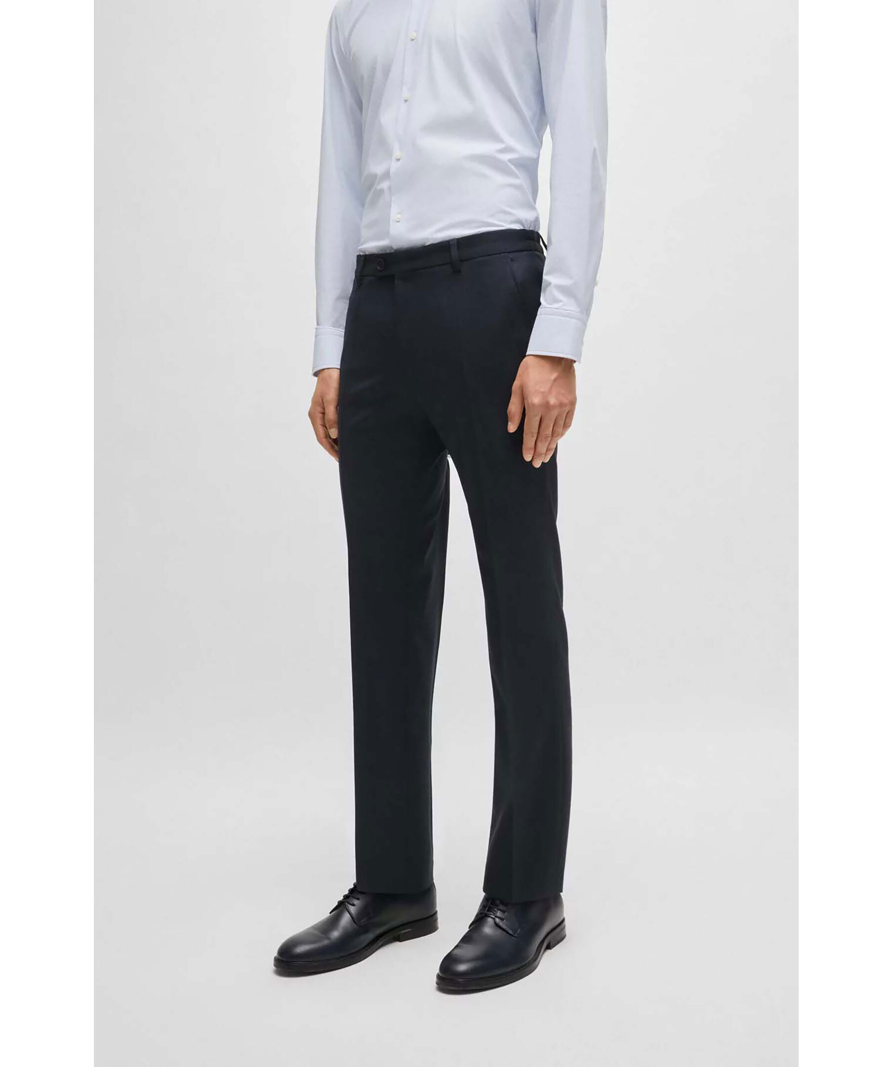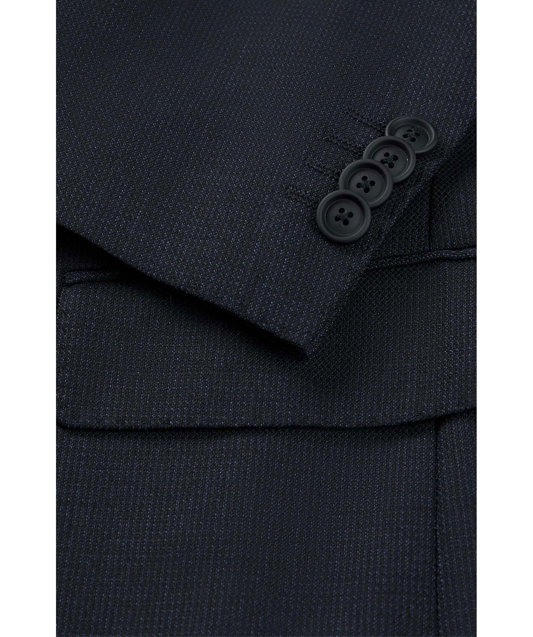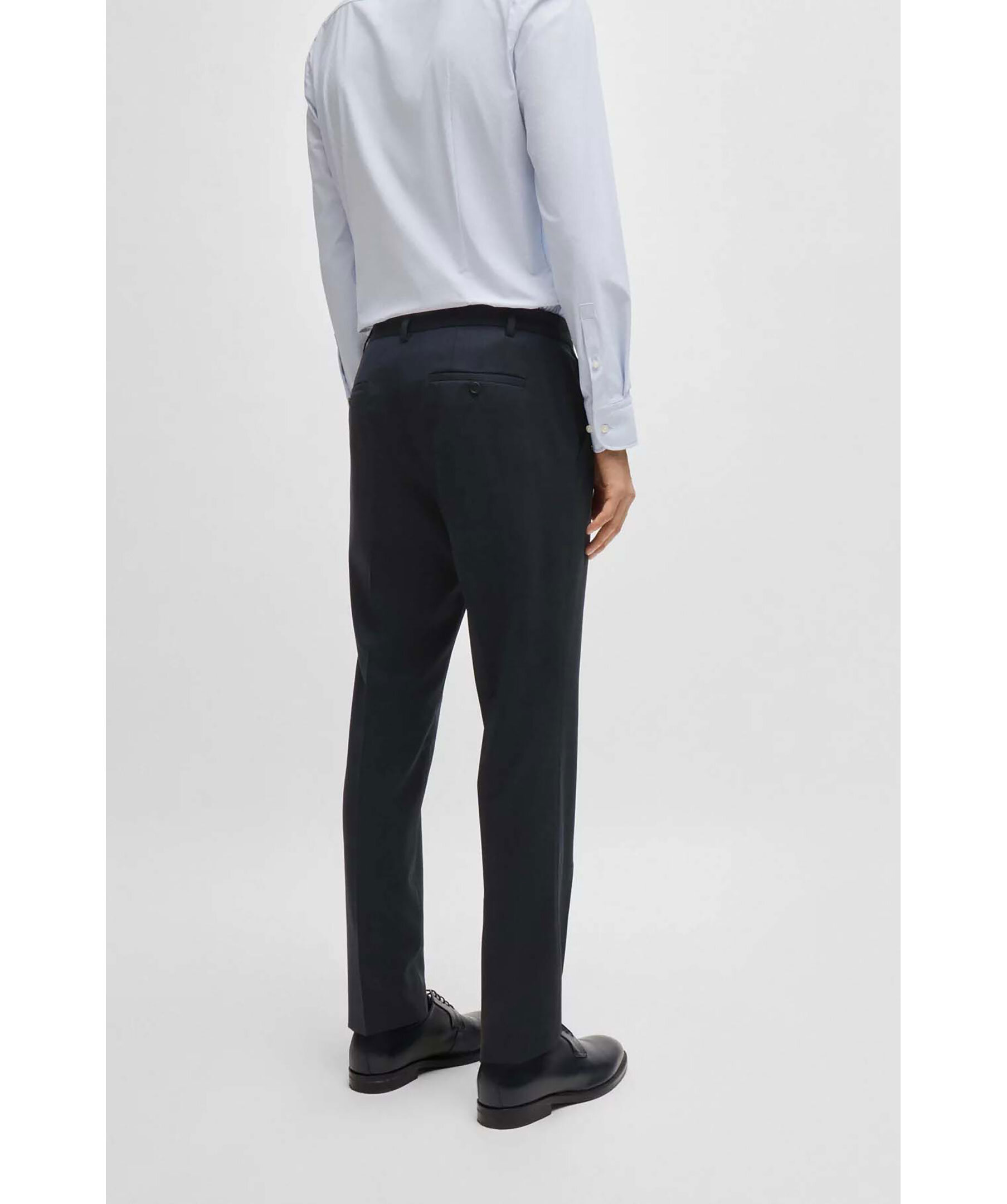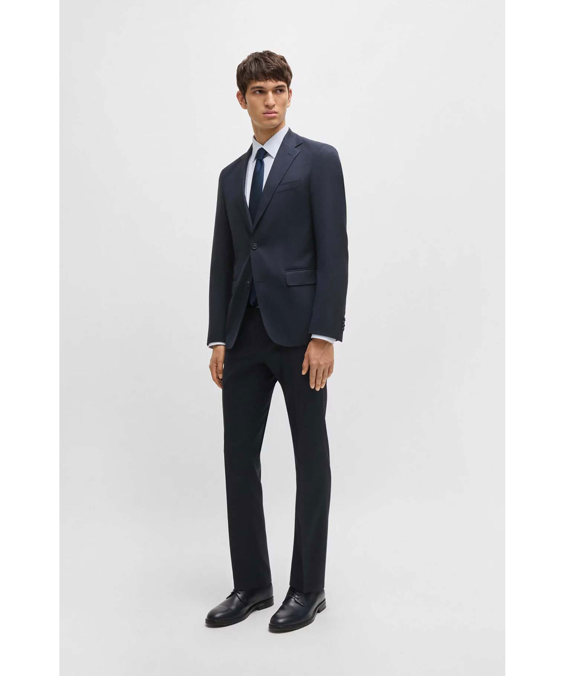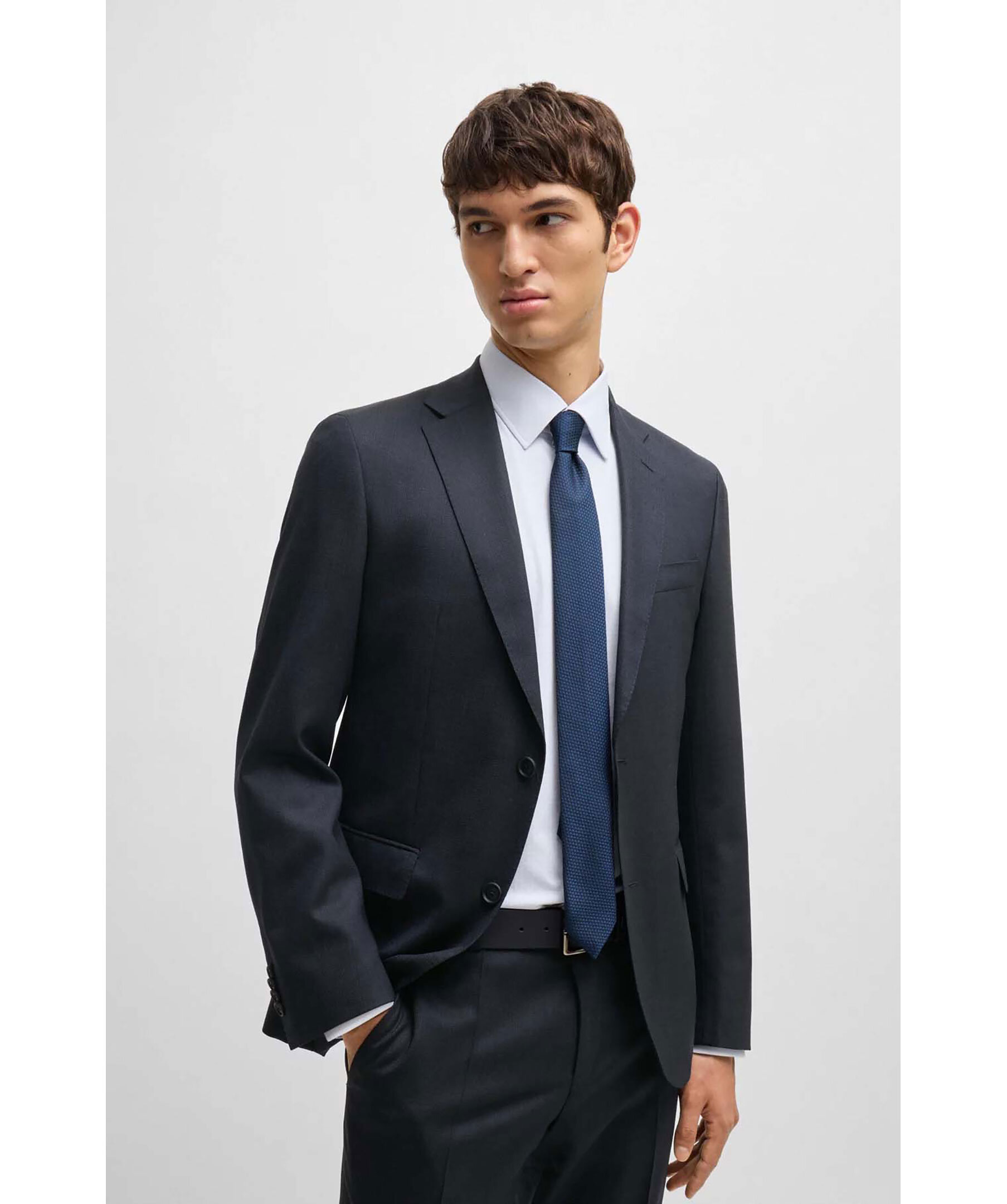 Mörkblå kostymset från BOSS Black. Kostymen har ett mikromönster, kavajen stängs med två knappar och har två fickor med lock samt en bröstficka. Byxorna har bälteshällor i midjan, två sidfickor samt två passpoalfickor baktill med knapp. Tillverkad av en ullblandning med stretch.