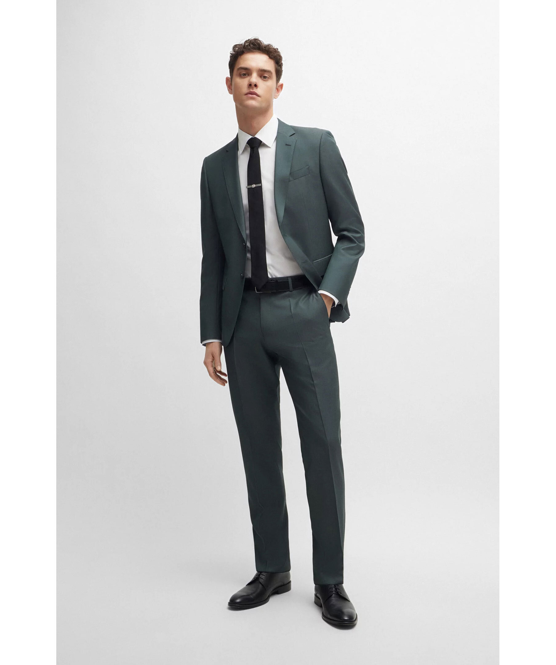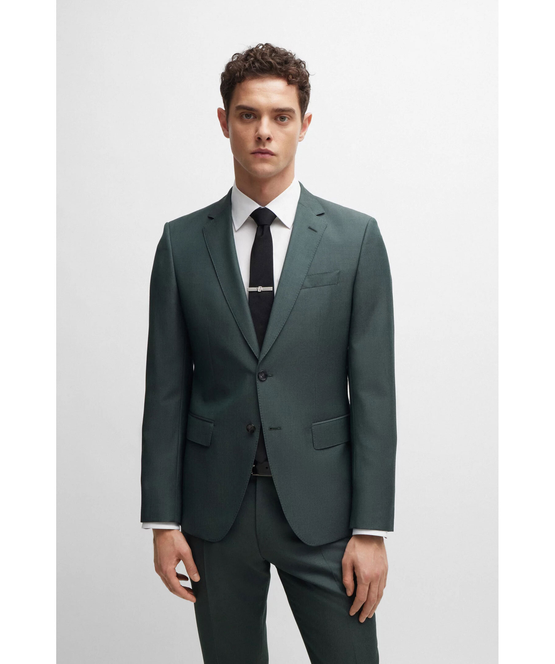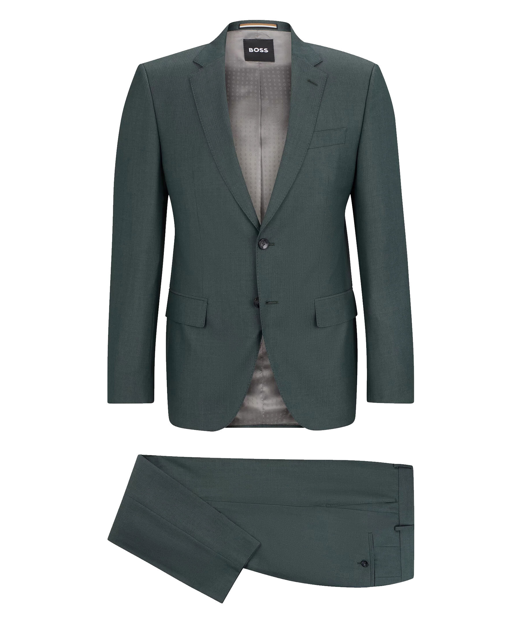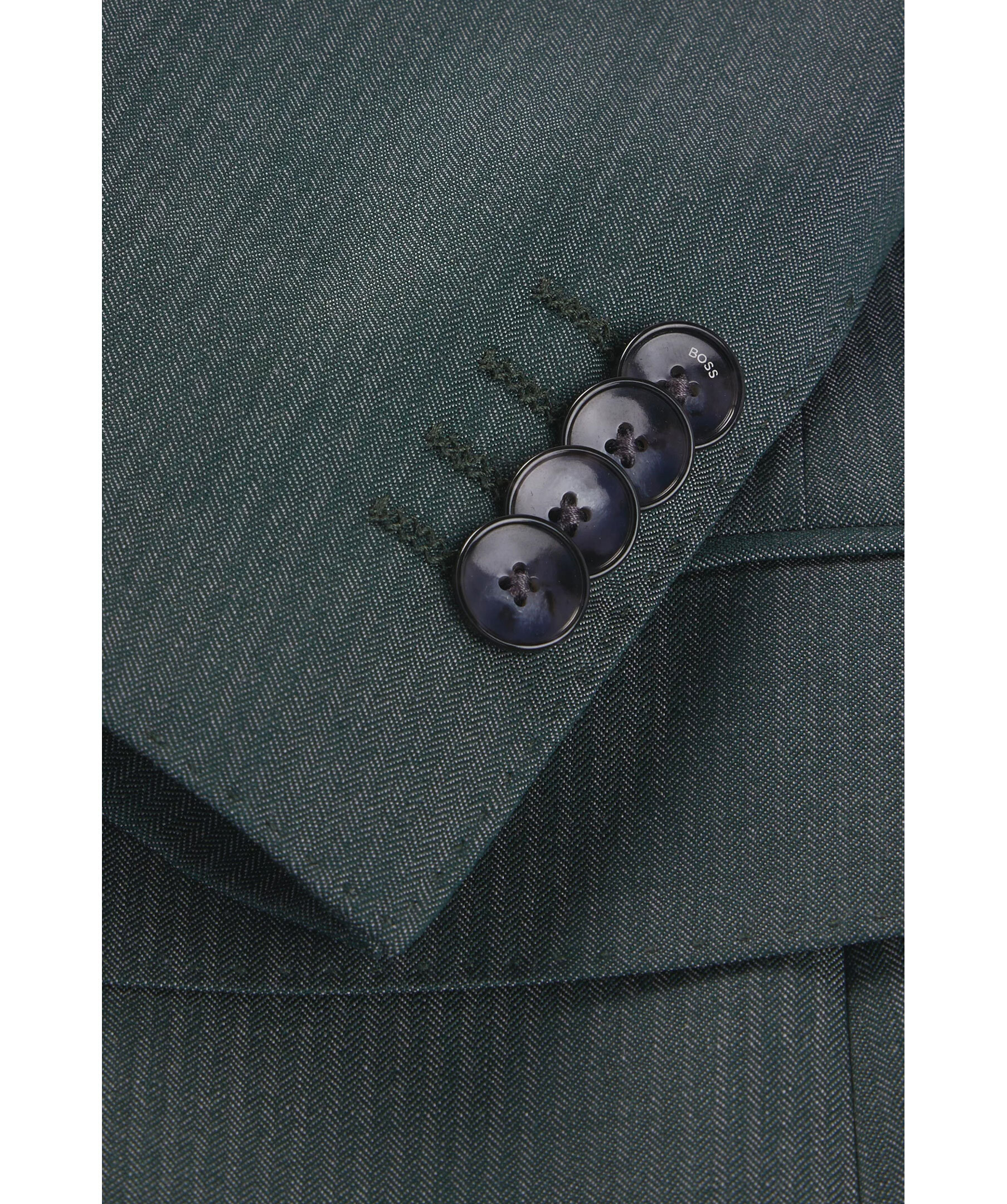 Mörkgrön, klassisk kostym från BOSS Black. Kostymen har ett diskret fiskbensmönster och tillverkad i ull. Kavajen stängs med två knappar och har två fickor med lock samt en bröstficka. Byxorna har bälteshällor i midjan, två sidfickor samt två passpoalfickor baktill med knapp.