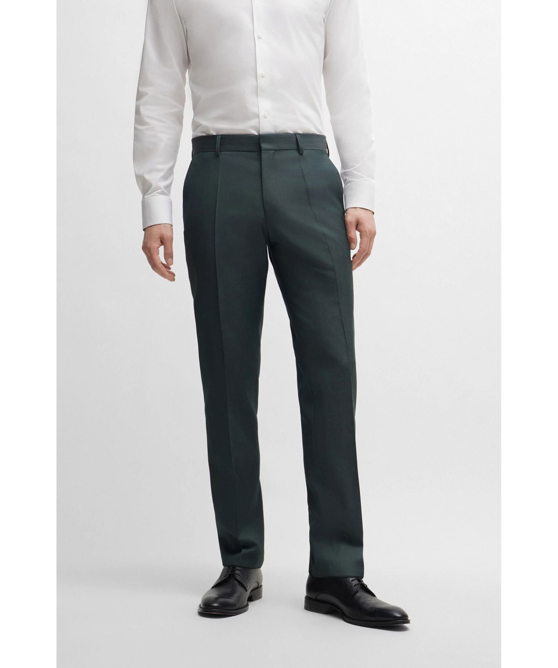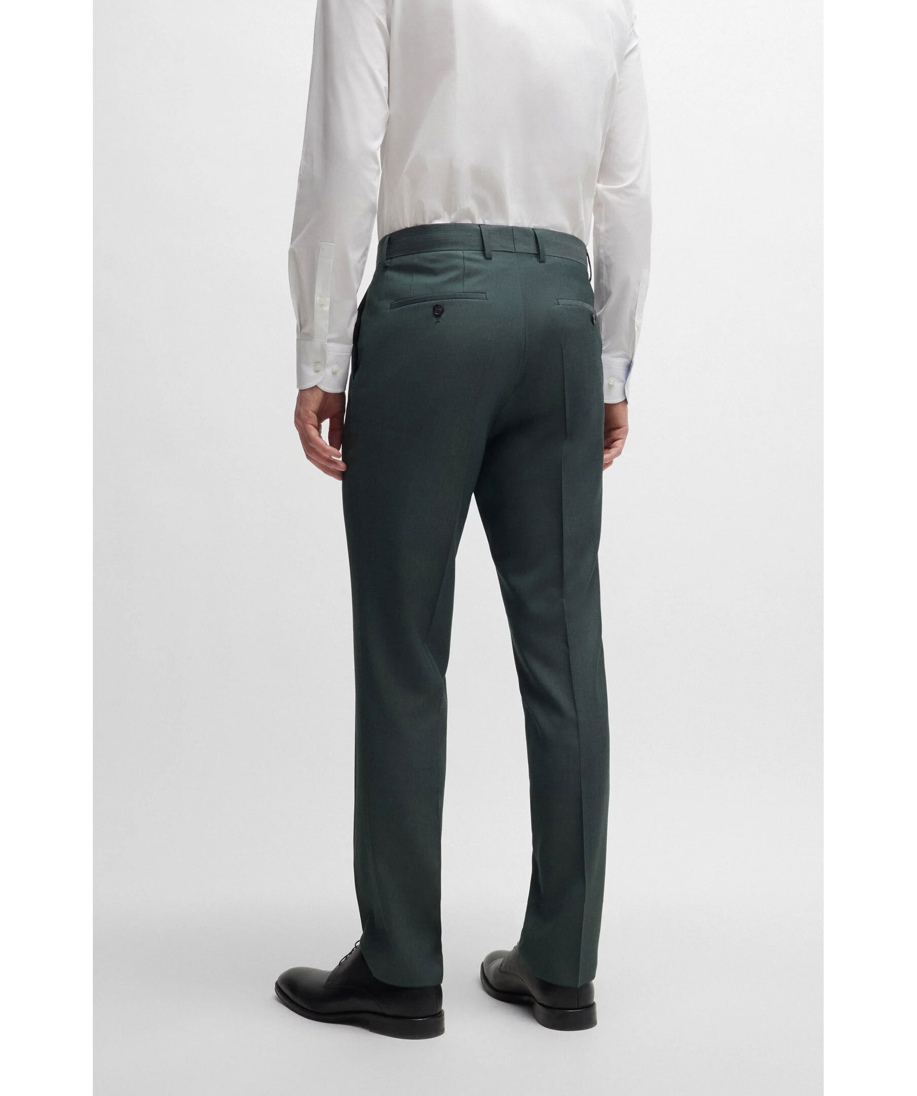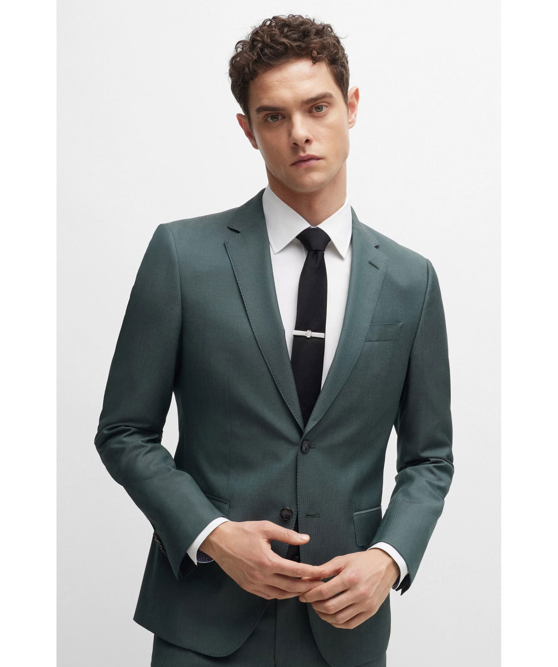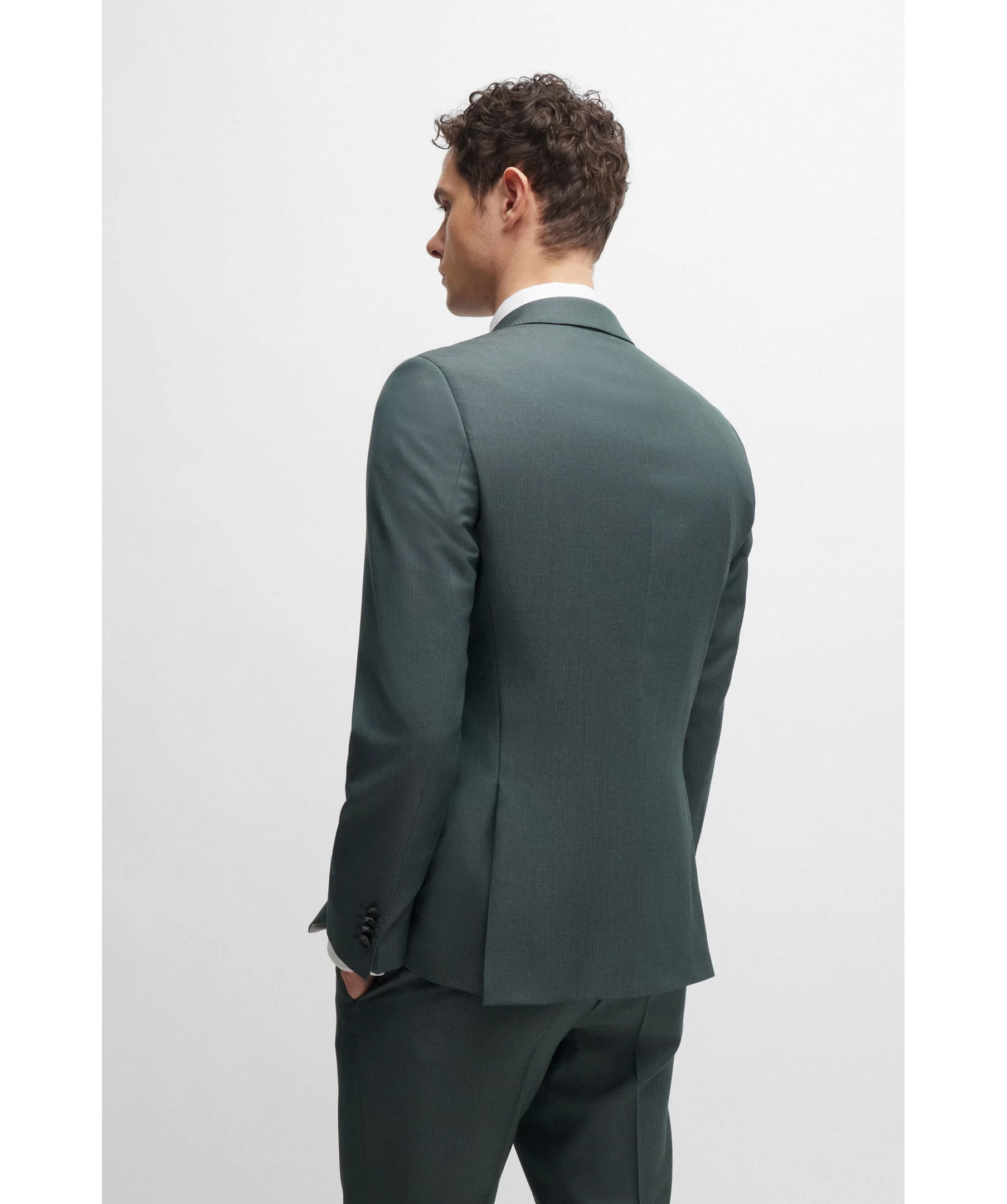 Mörkgrön, klassisk kostym från BOSS Black. Kostymen har ett diskret fiskbensmönster och tillverkad i ull. Kavajen stängs med två knappar och har två fickor med lock samt en bröstficka. Byxorna har bälteshällor i midjan, två sidfickor samt två passpoalfickor baktill med knapp.