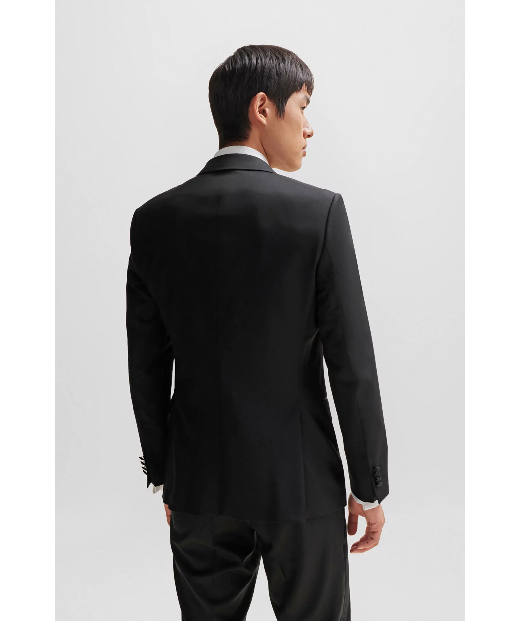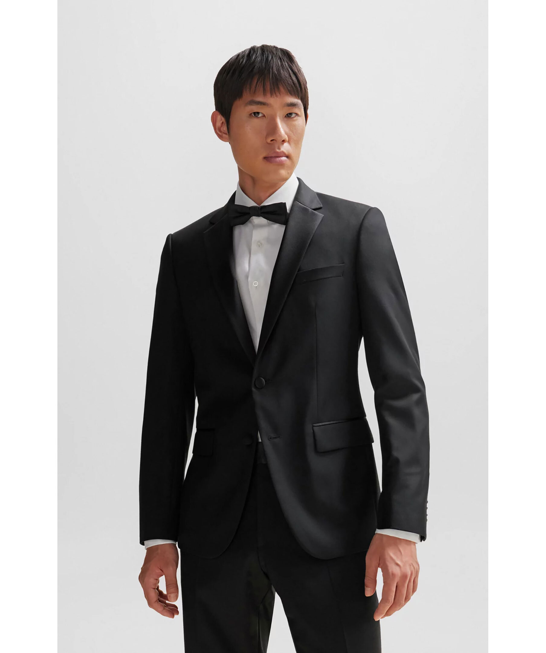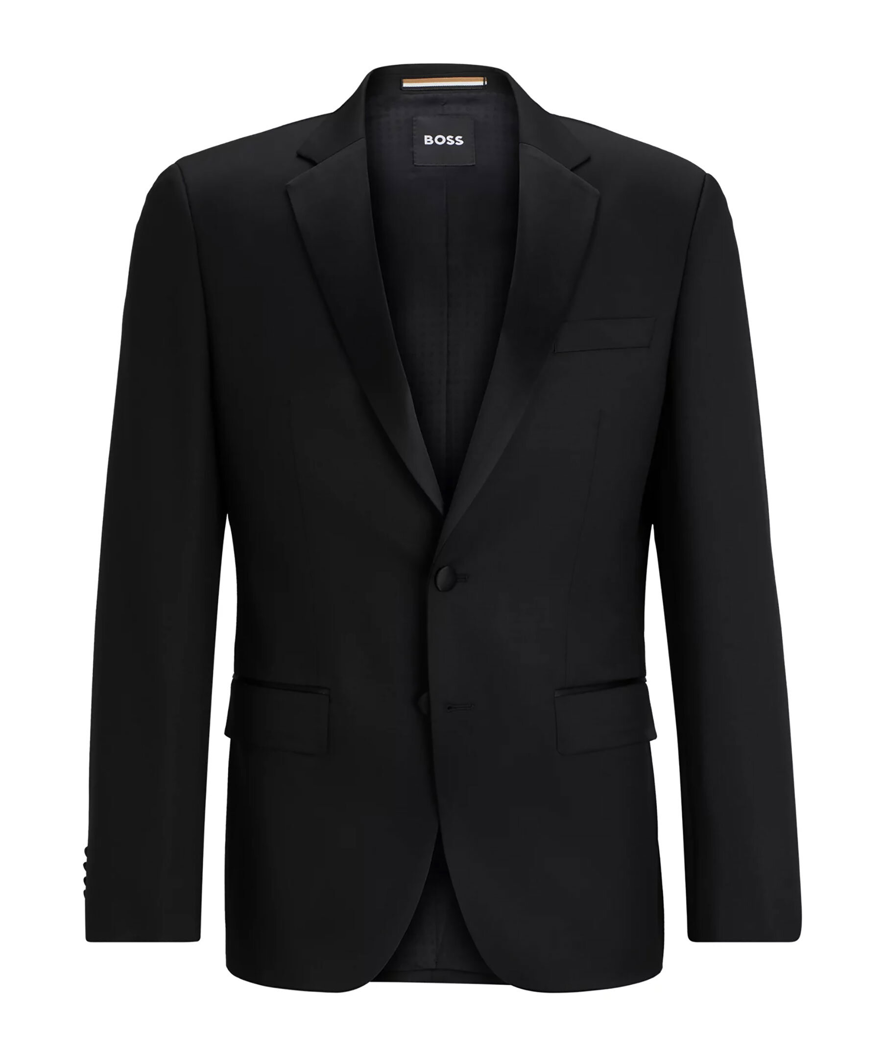 Svart smokingkavaj från HUGO. Kavajen har trubbiga slag, enkelknäppt, två fickor med lock och en bröstficka. Tillverkad i ull med detaljer av en sidenblandning.