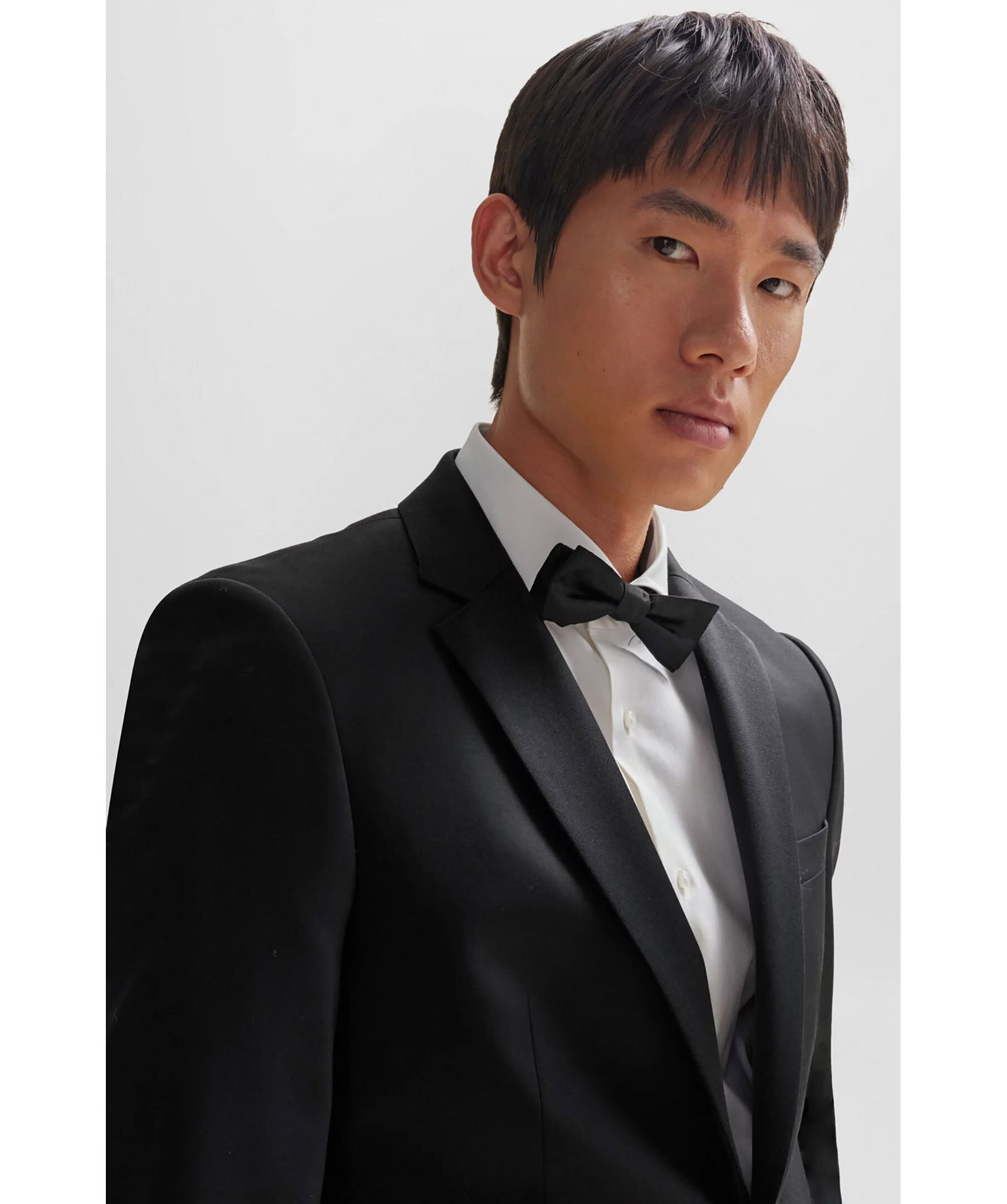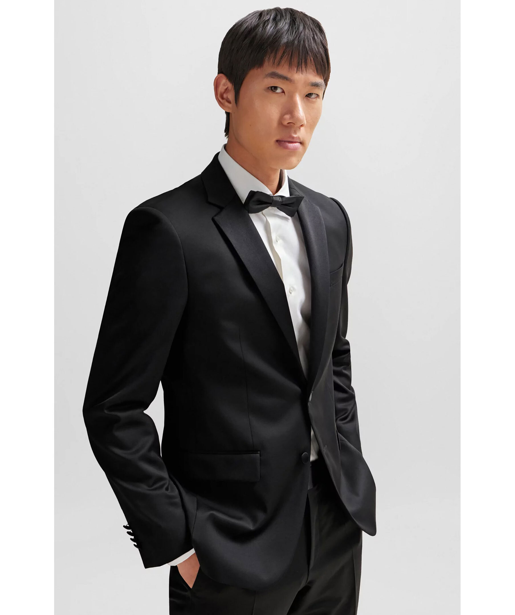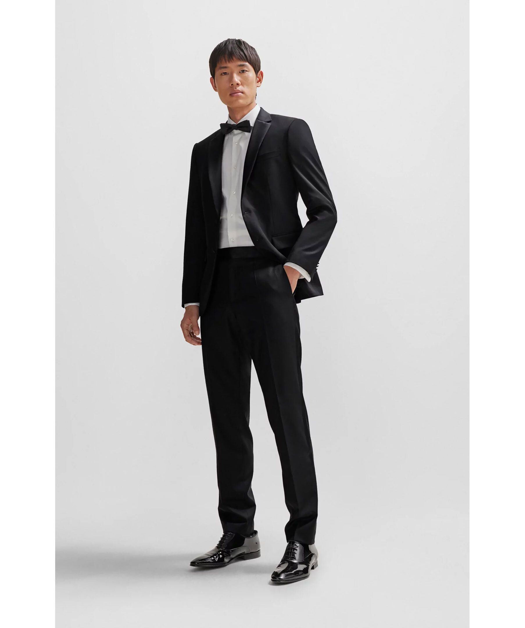 Svart smokingkavaj från HUGO. Kavajen har trubbiga slag, enkelknäppt, två fickor med lock och en bröstficka. Tillverkad i ull med detaljer av en sidenblandning.