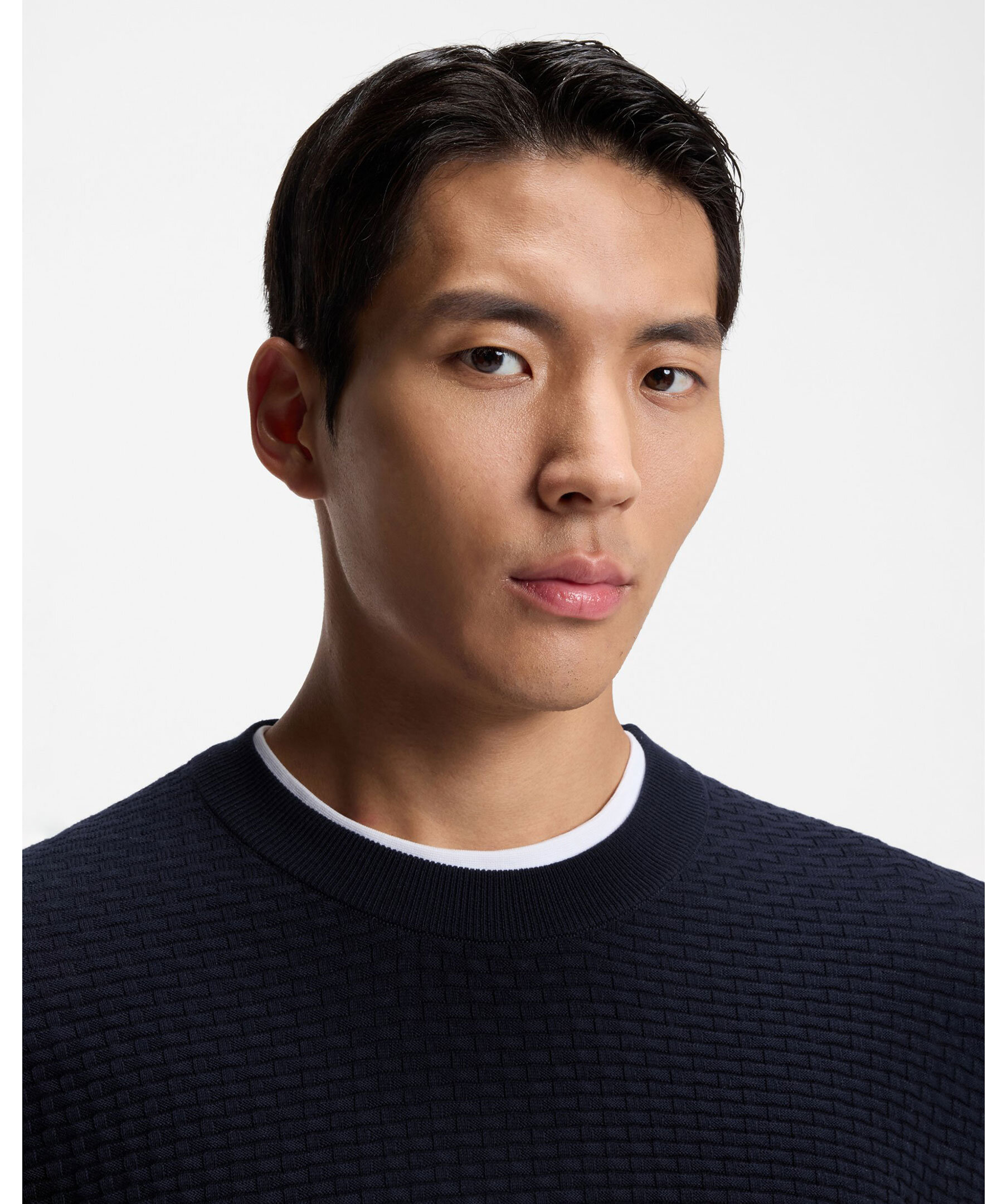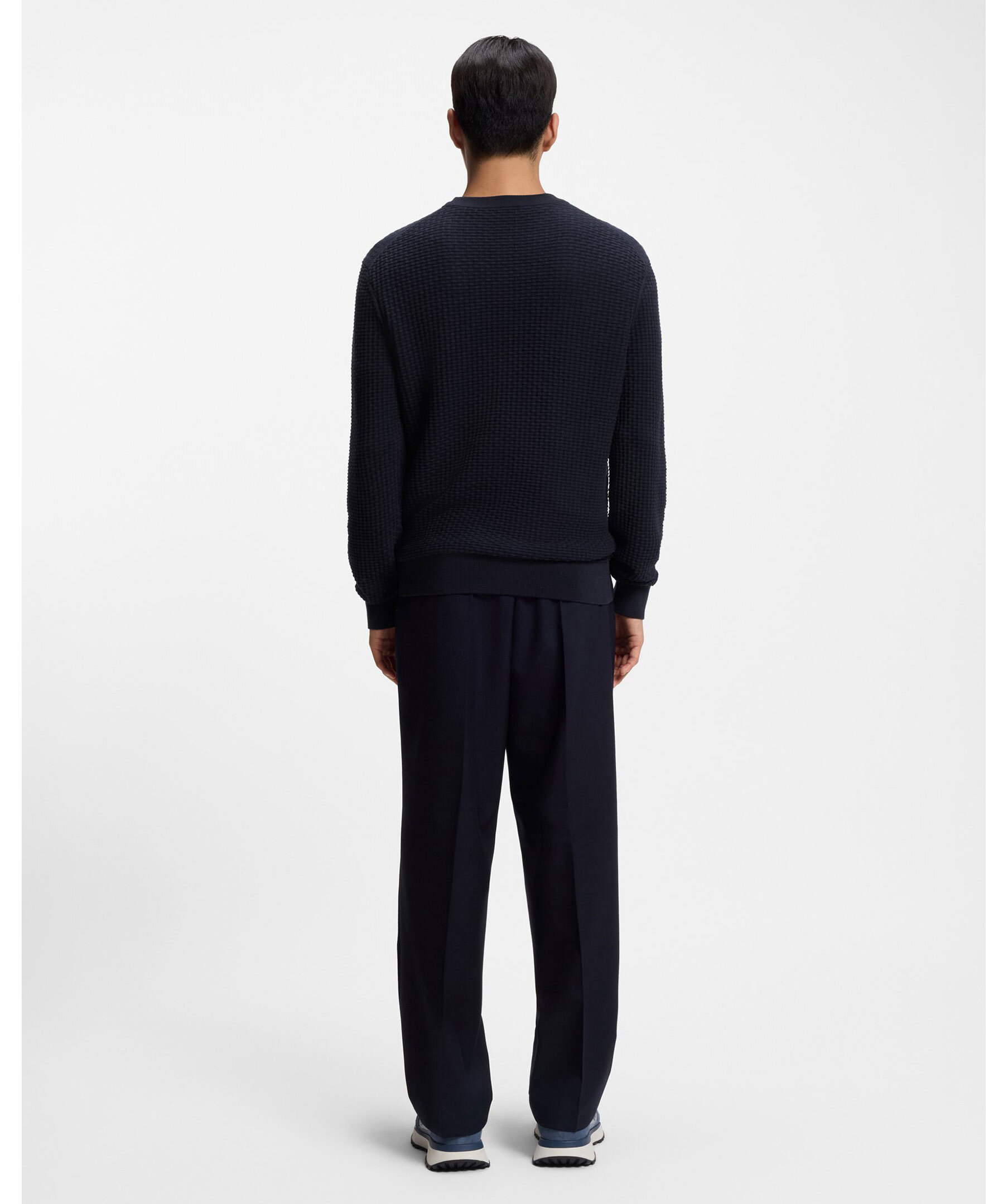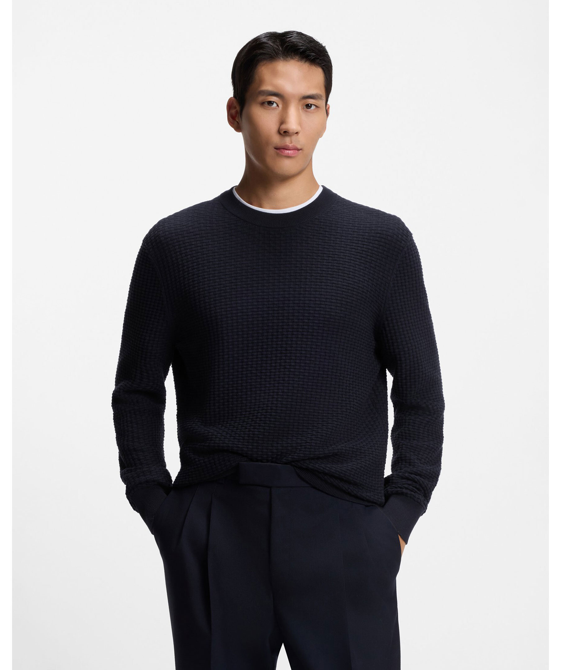 En stilren tröja i mjuk bomull med en tydlig strukturell stickning från BOSS BLACK. Modellen är regular fit och har rund halsringning samt ribbade avslut. En mångsidig baströja som fungerar lika bra till vardags som under kavaj eller jacka.