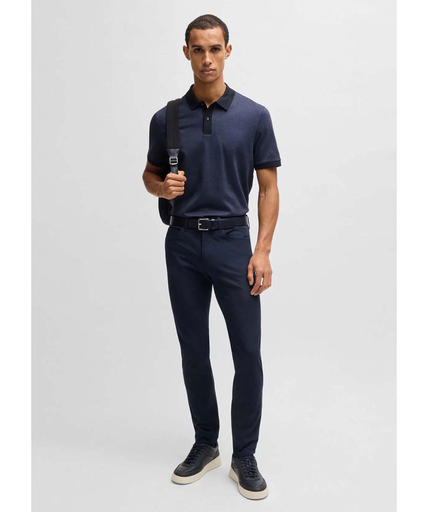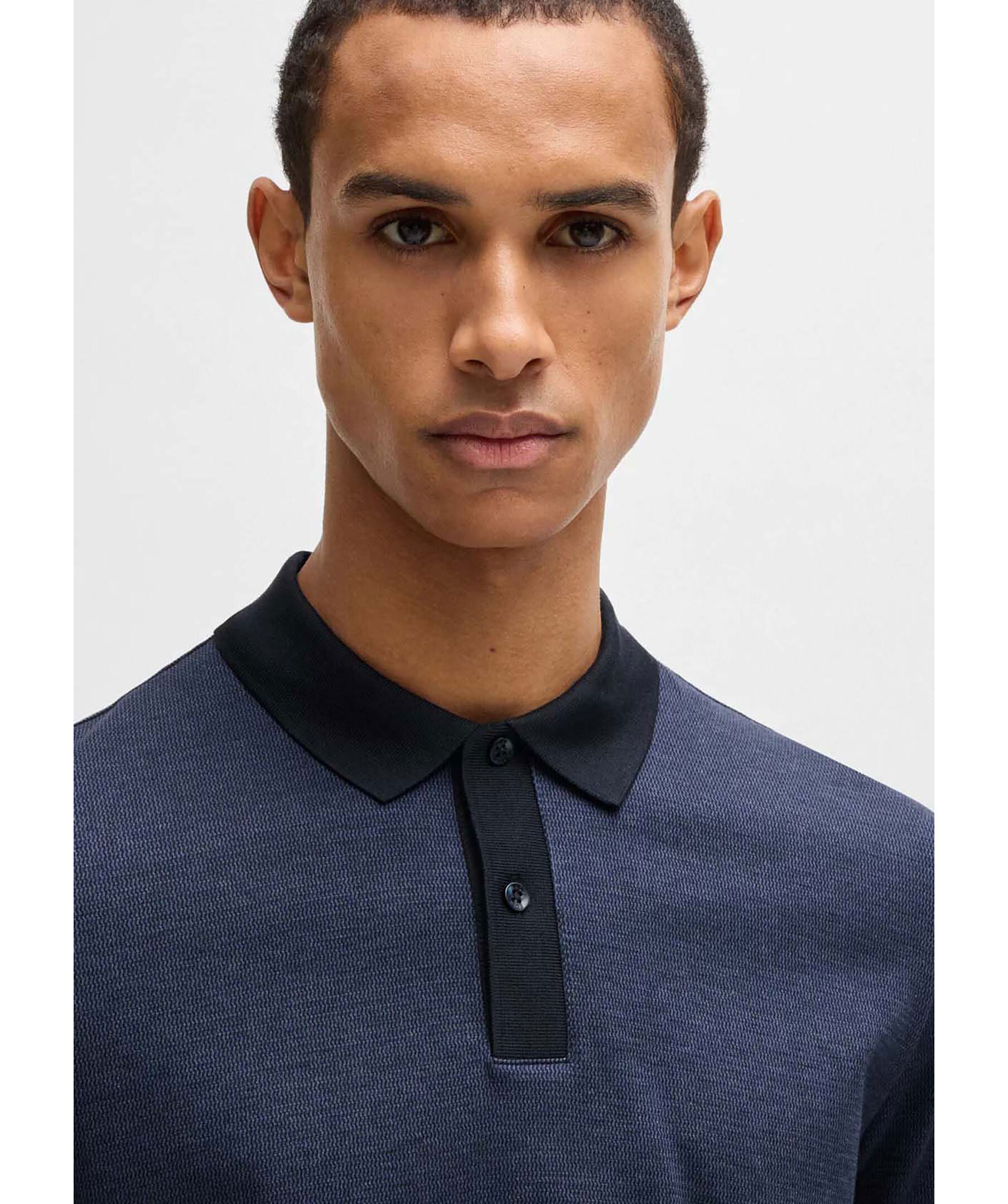 Mörkblå mönstrad piké från Boss Black. , tröjan har mörka detaljer kring krage och ärmslut. Två knappar vid kragen och är tillverkad av 100% bomull.