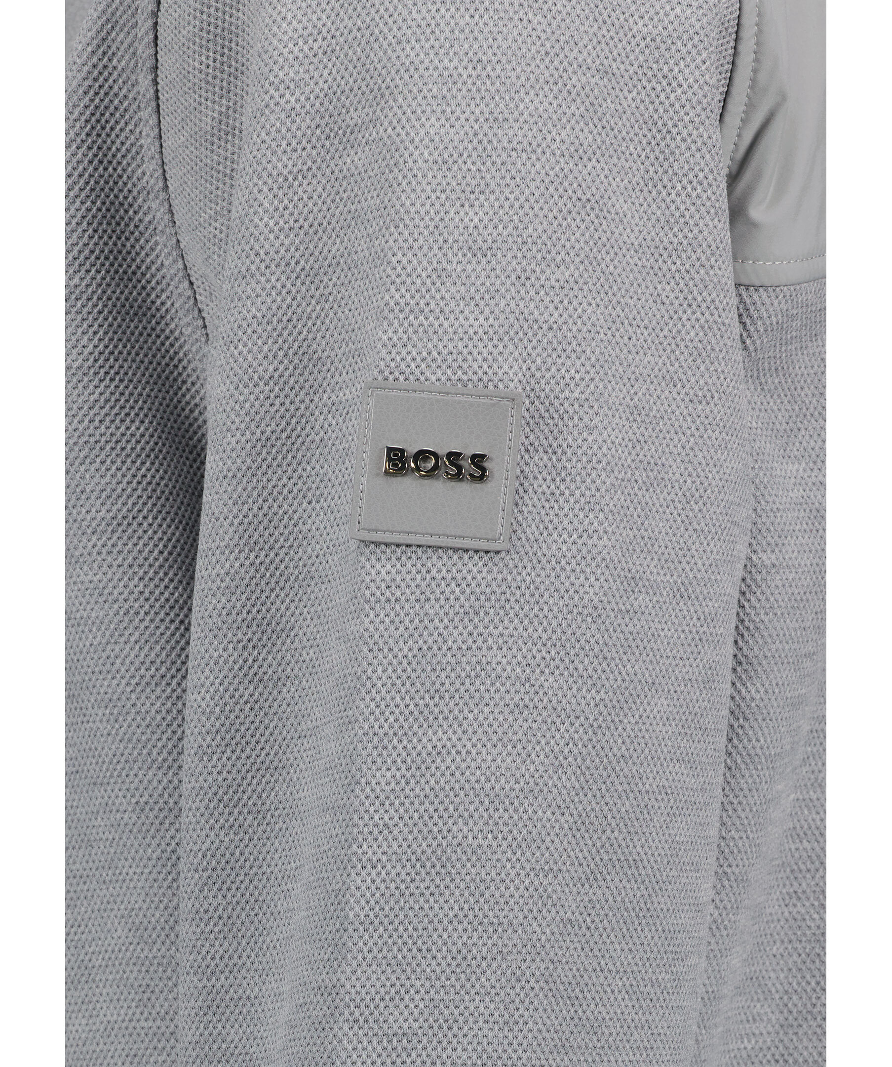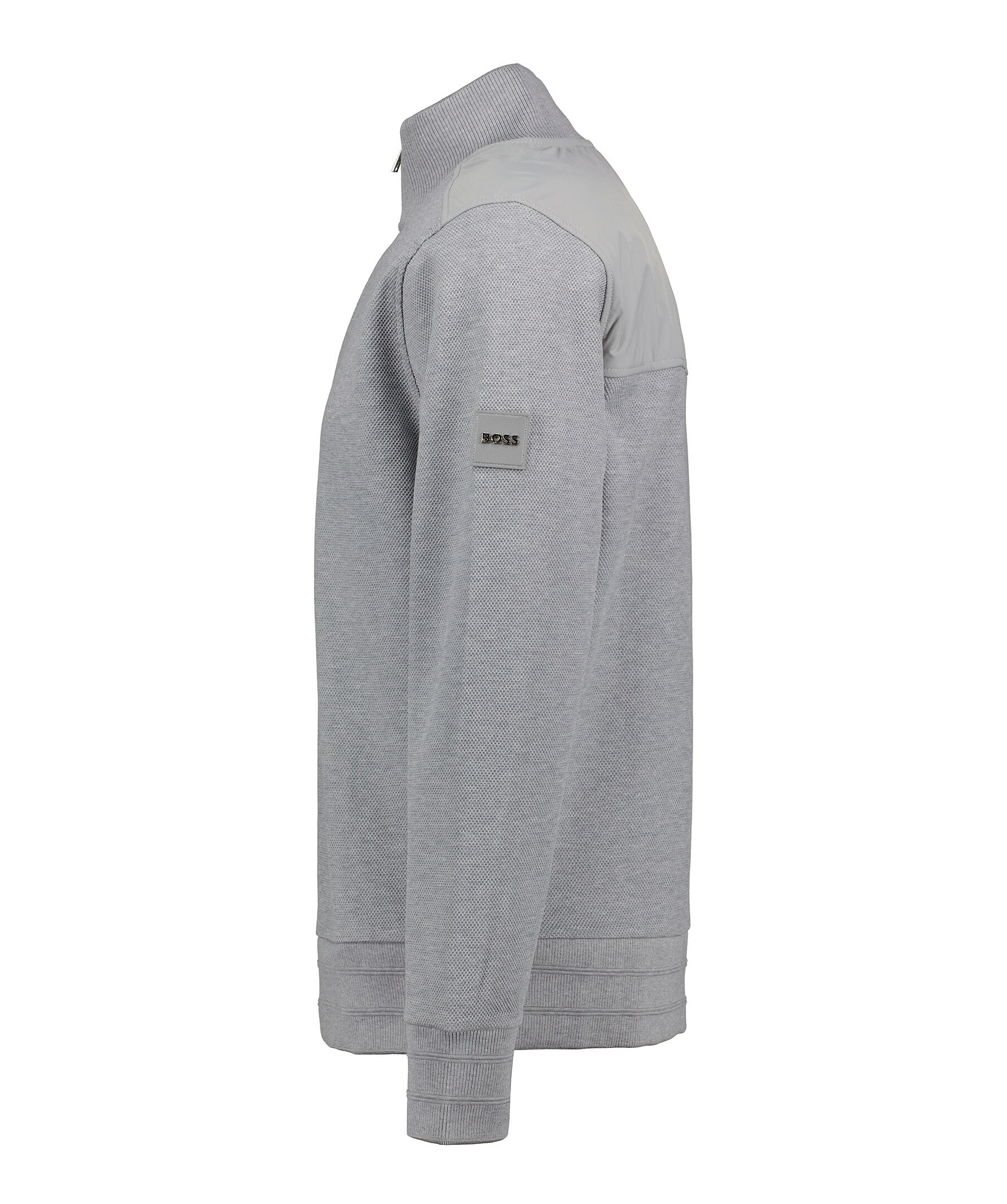 Grå strukturerad half-zip från BOSS Black. Ståkrage med halv dragkedja framtill samt konstrasdelar vid axlar och ryggen. Logotyp på vänster ärm. Tillverkad i bomull.