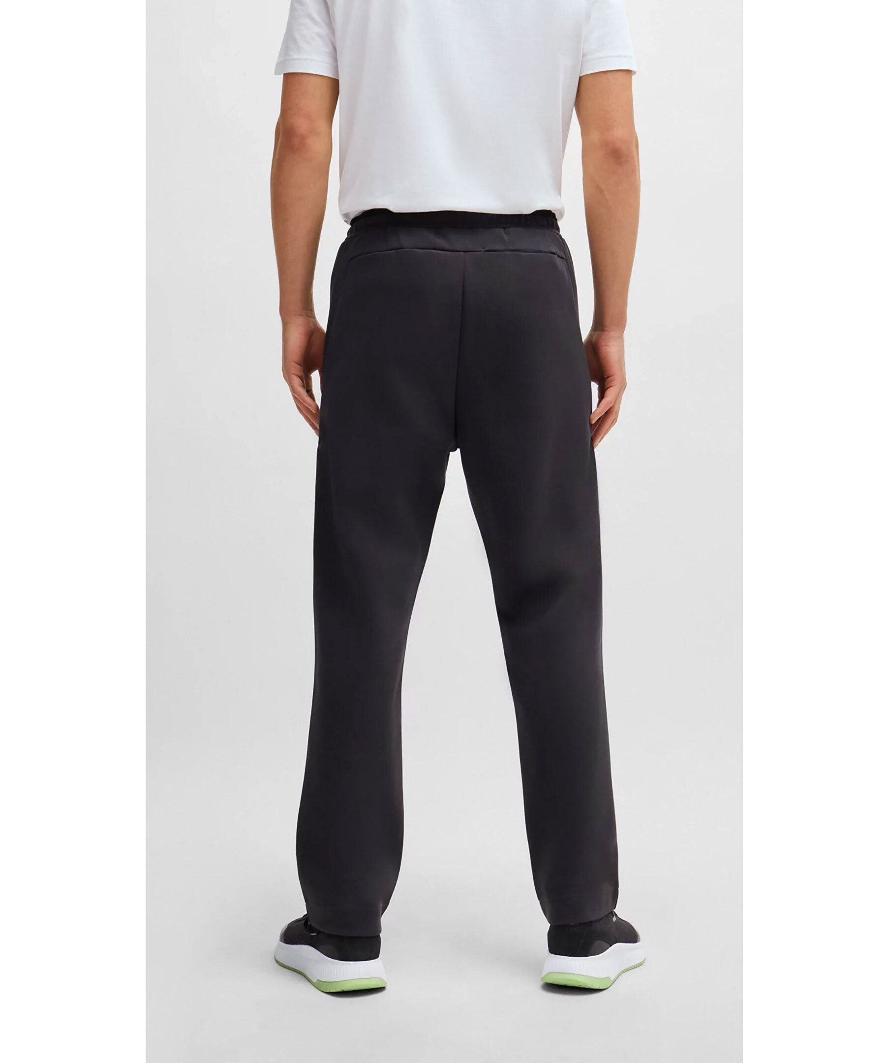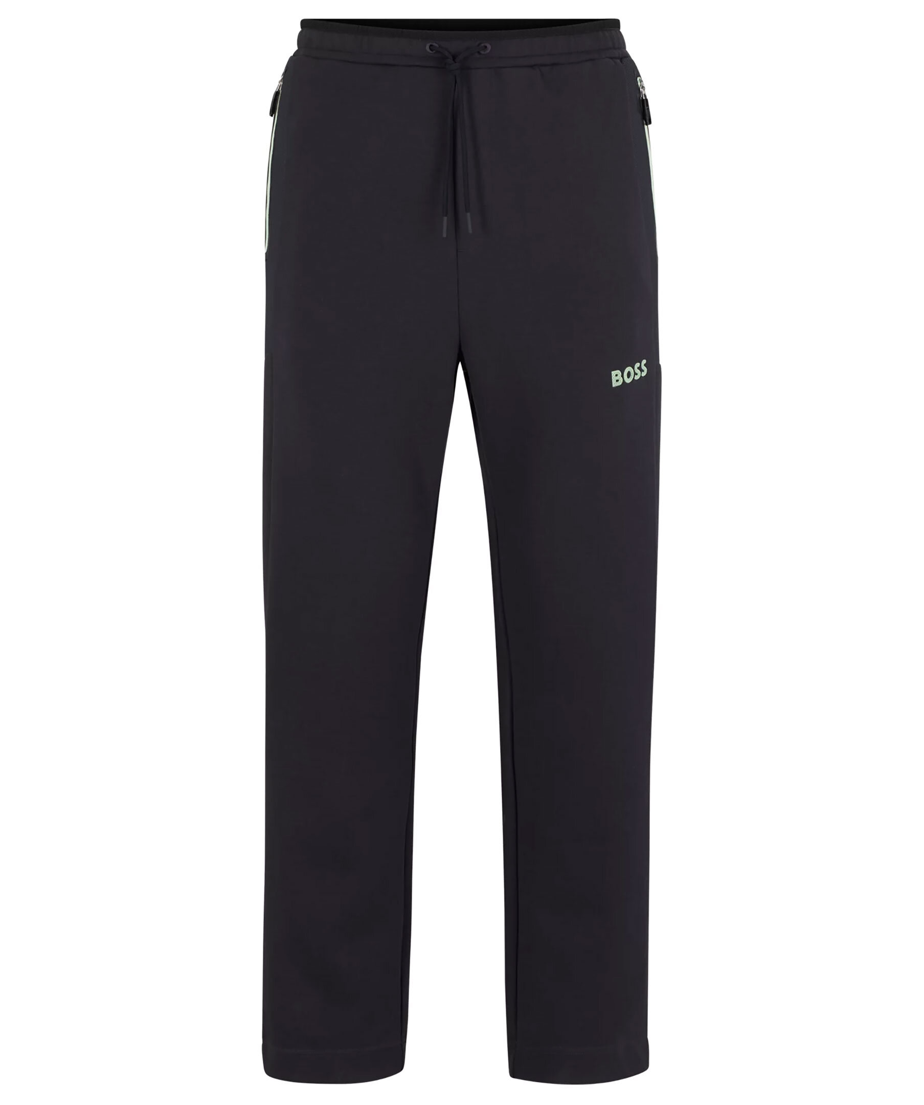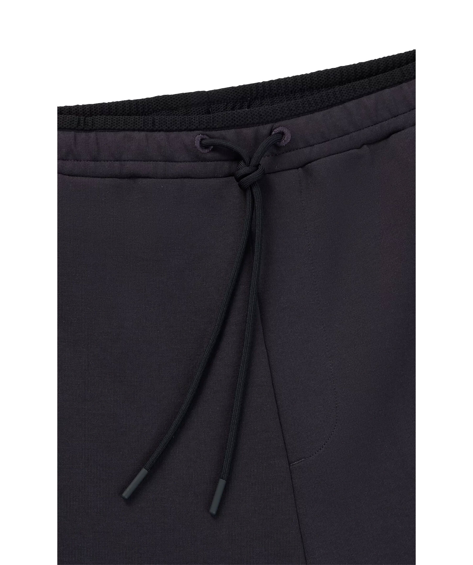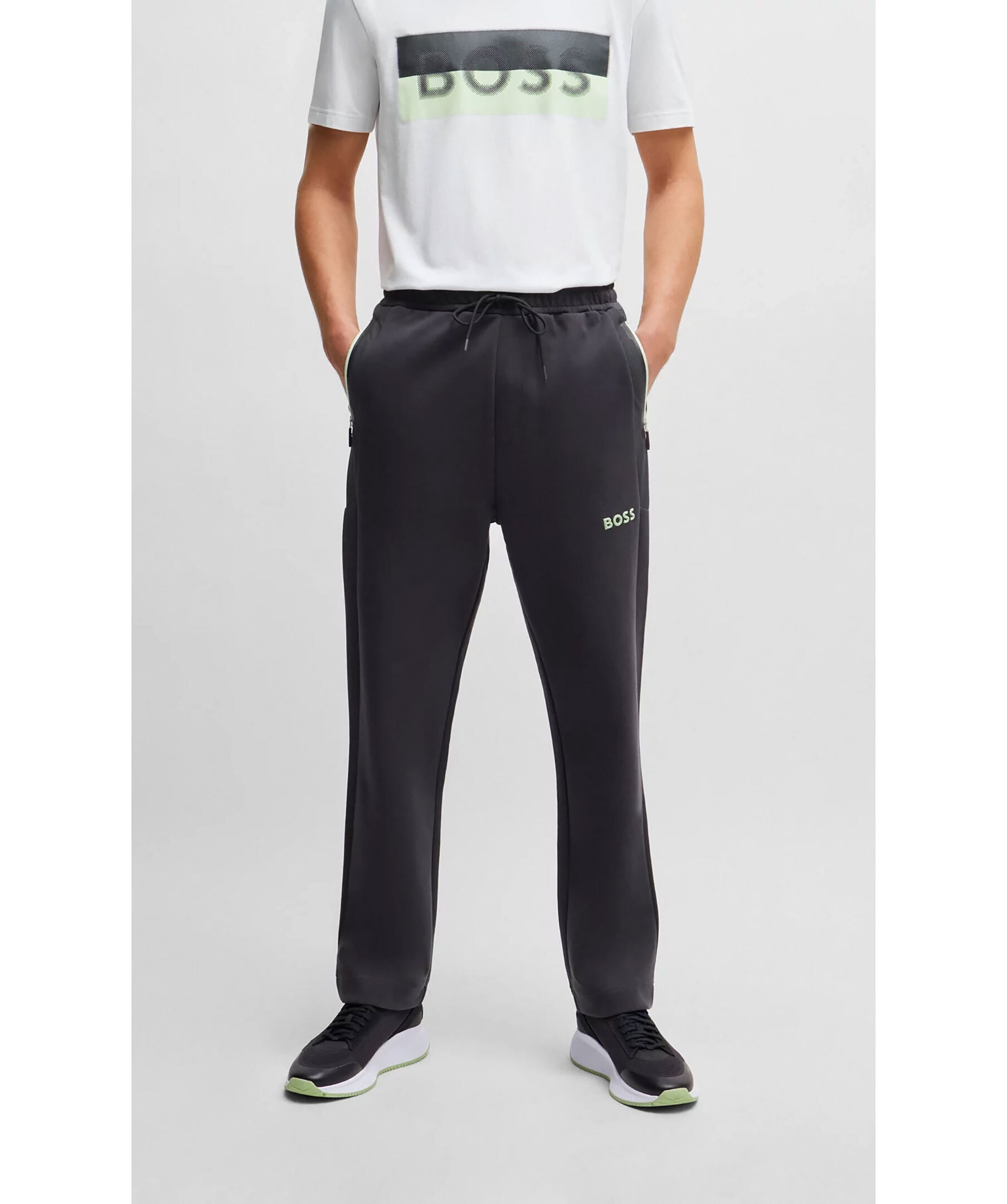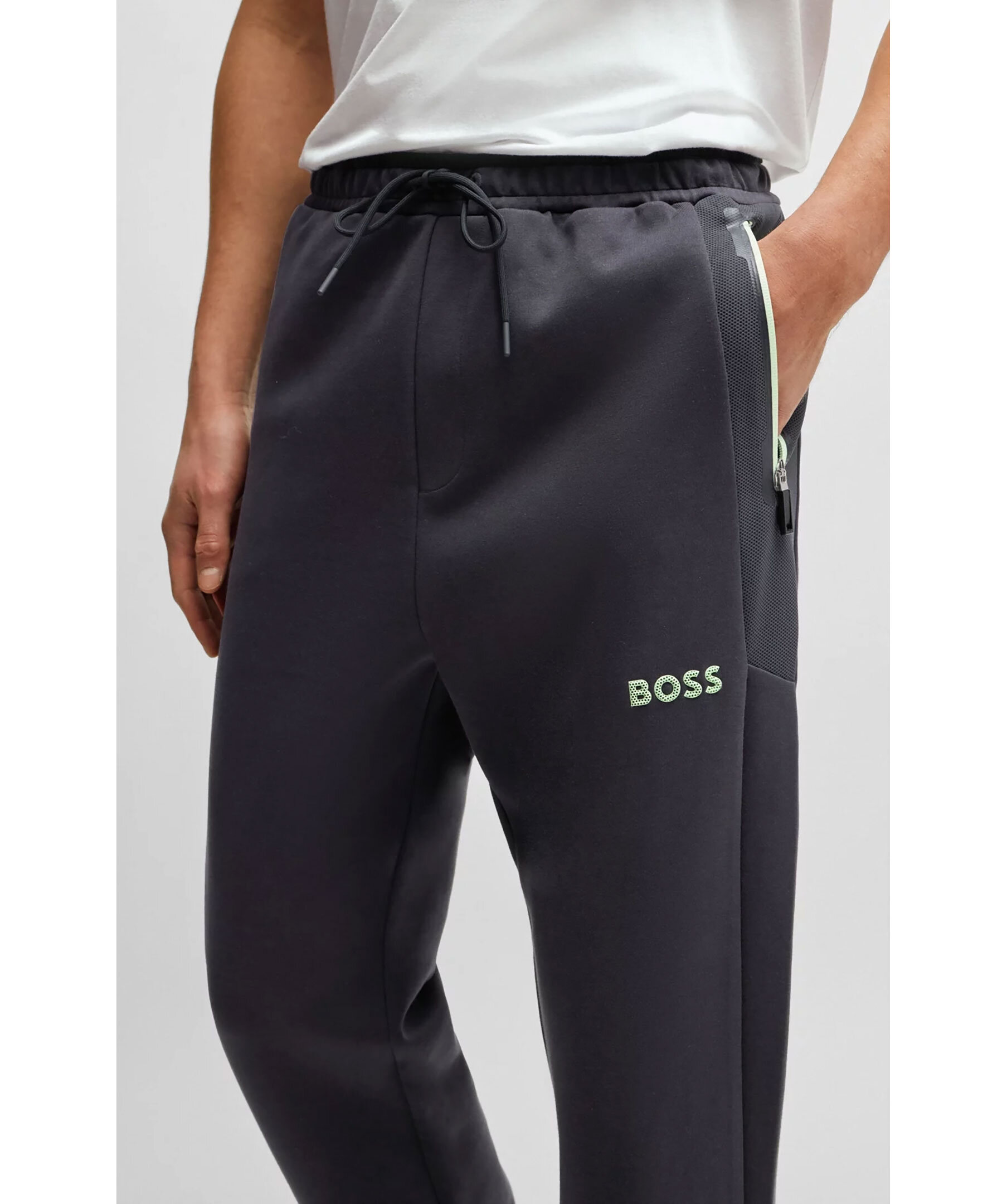 Mörkgrå sweatpants från BOSS Green. Gummerad logotyp på vänster lår. Dragsko vid midjan. Två fickor i sidorna som stängs med dragkedja. Detaljer i mesh.