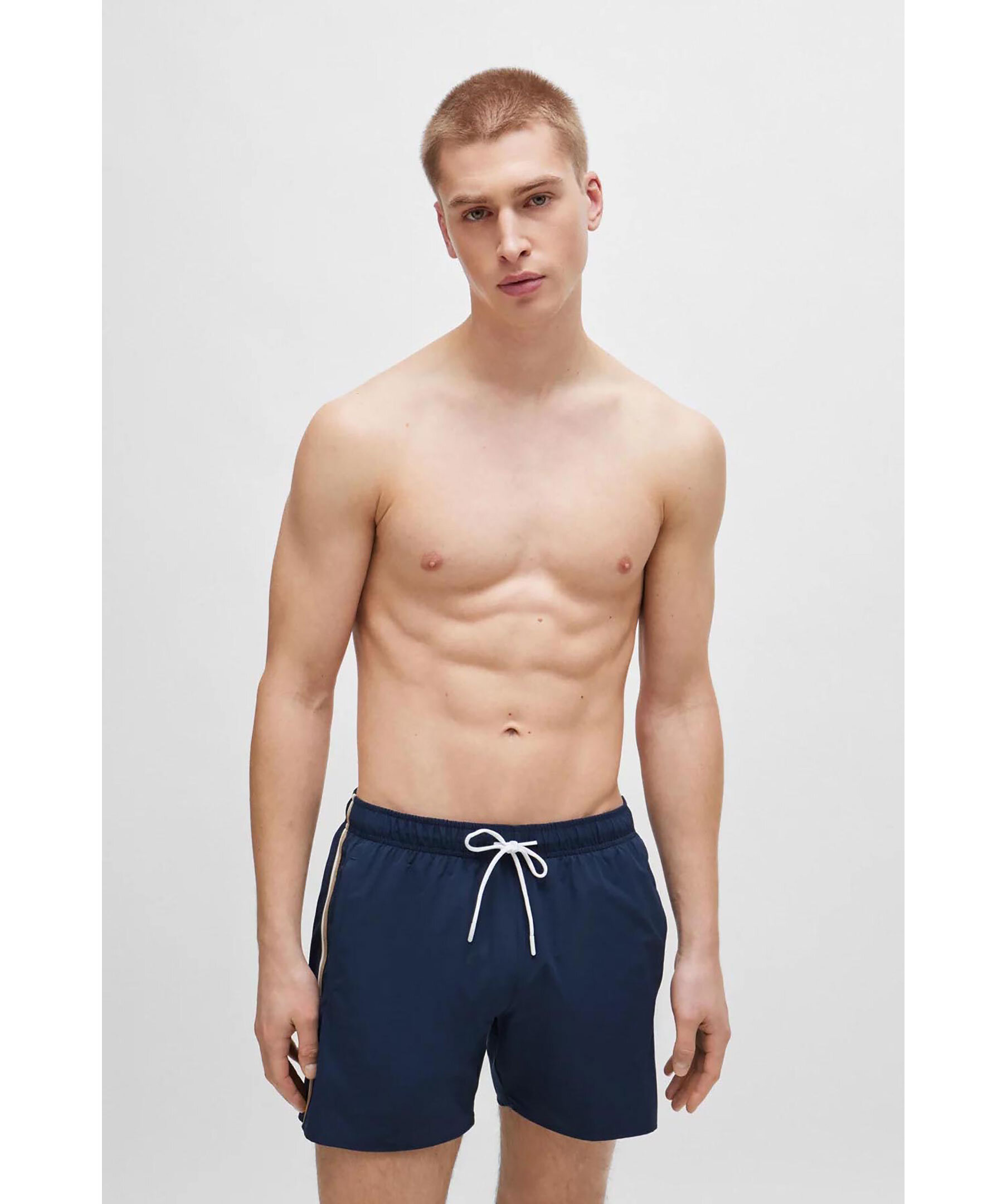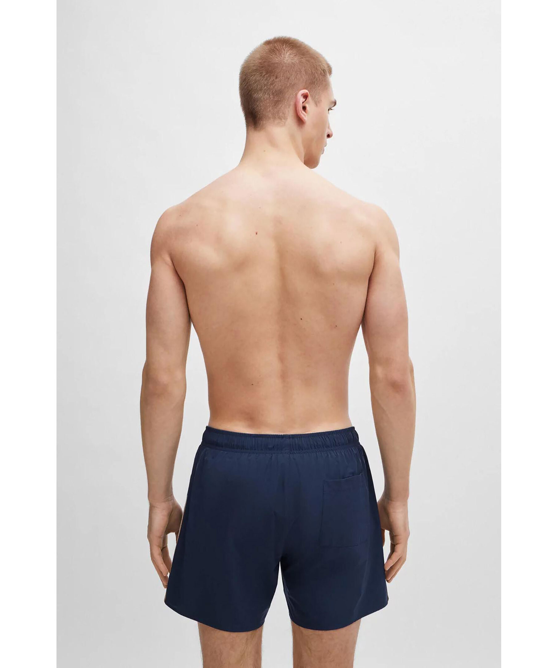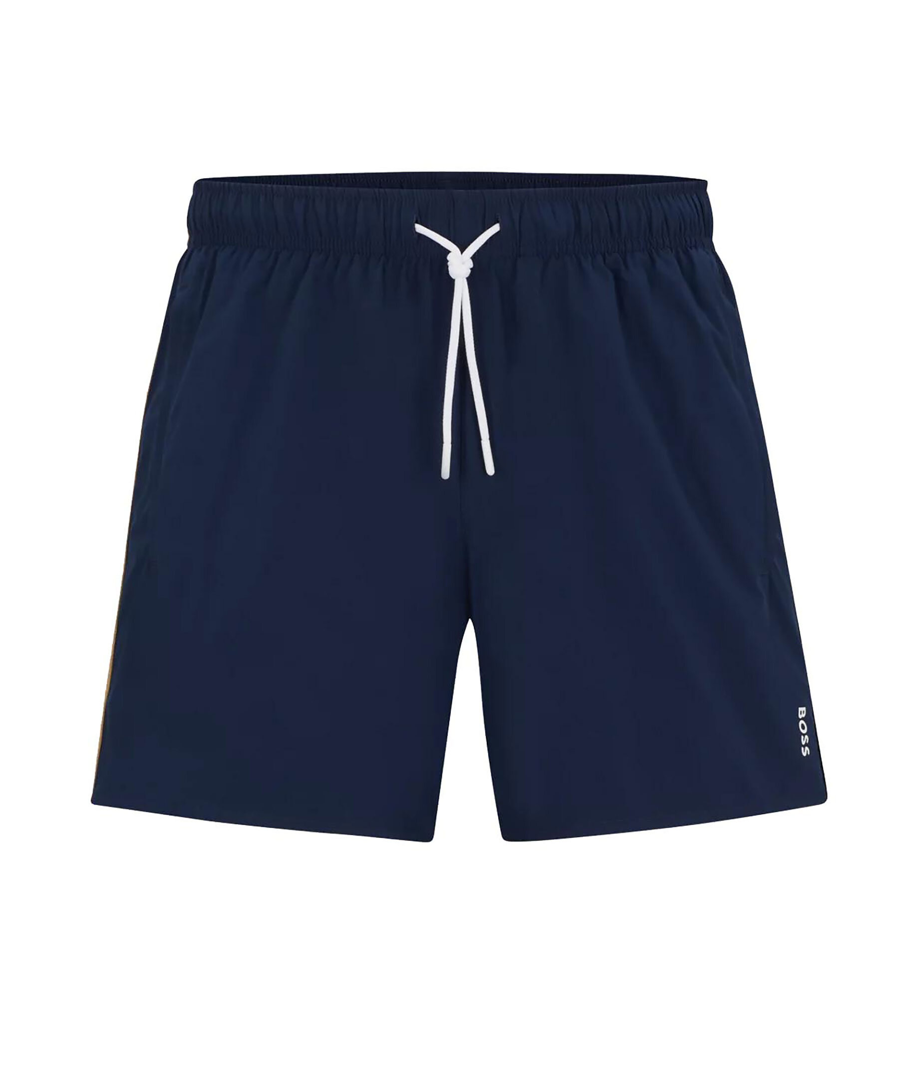 Mörkblå badshorts från BOSS Black. Badshortsen är fodrade och har en elastisk midja med dragsko samt logotyp vid ena benslut och revärer längs benen i deras färger. Tillverkade i elastomultiester.