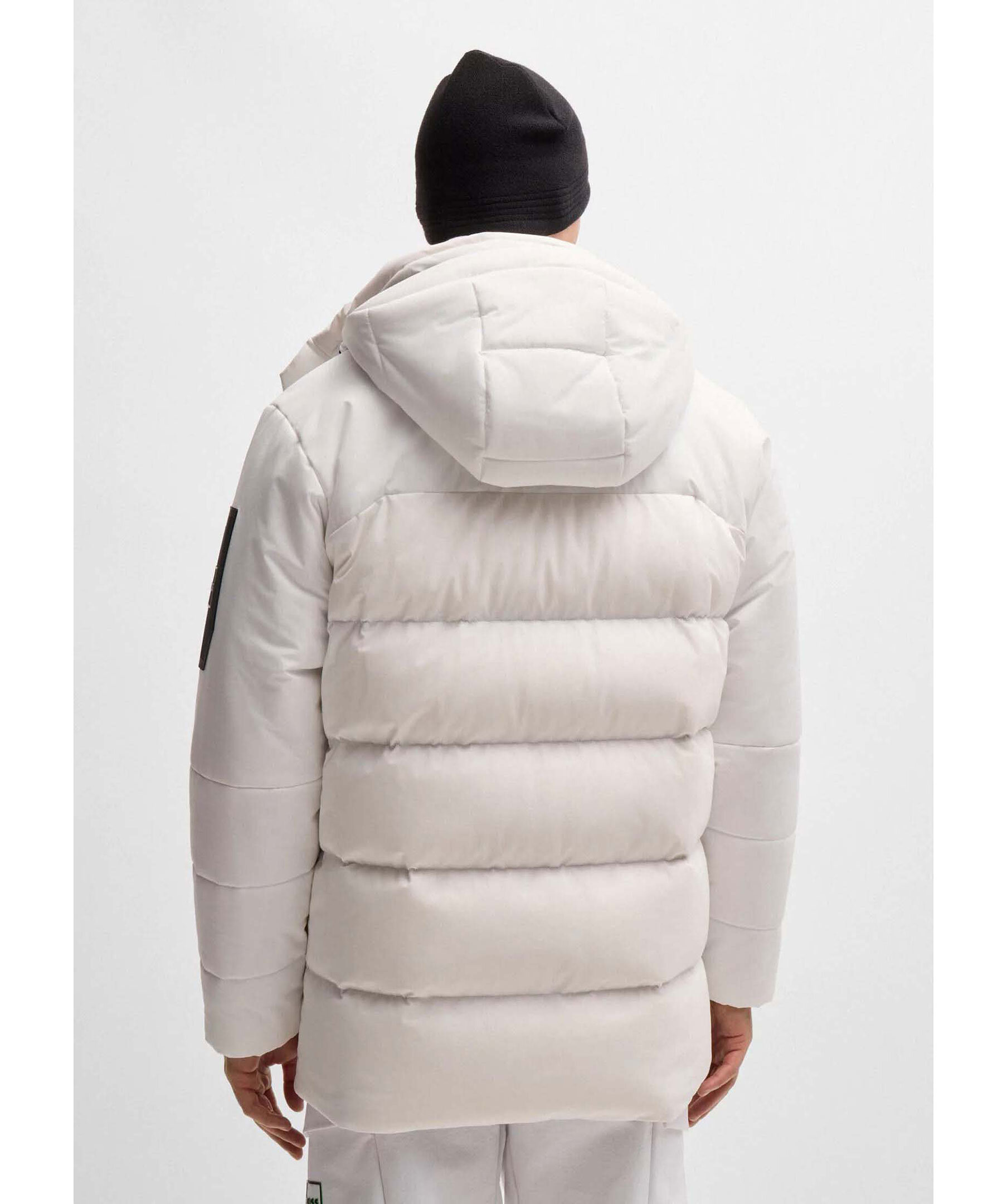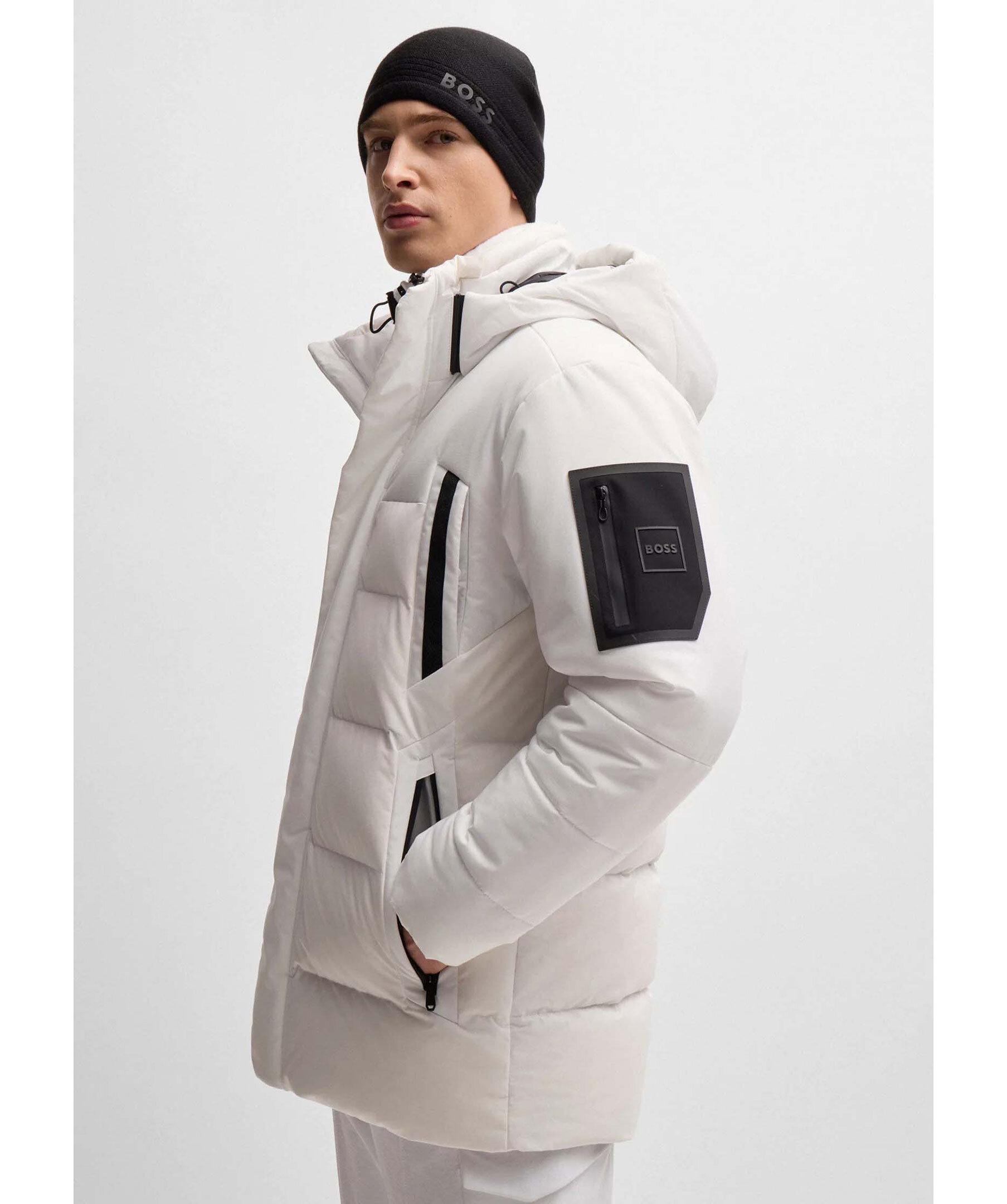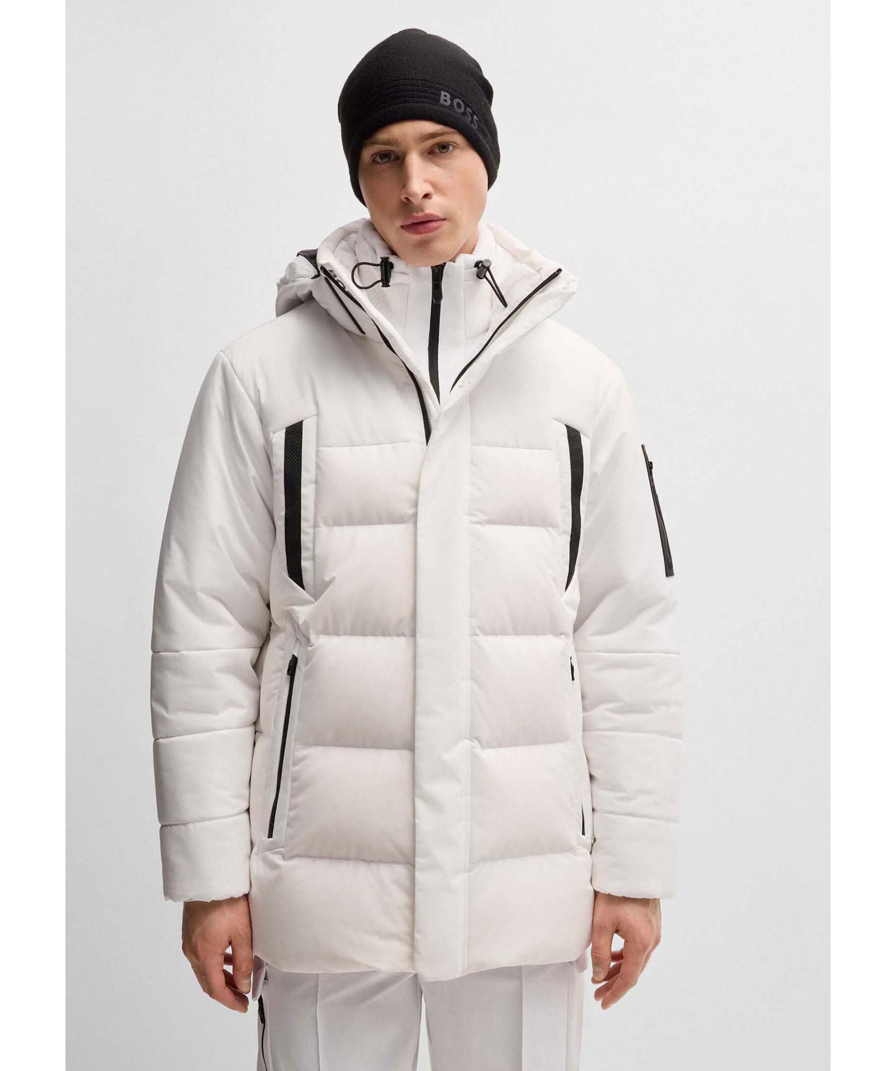 Vit, tjock parka från BOSS Green. Jackan stängs med tvåvägsdragkedja och har justerbar och avtagbar huva, flera fickor med dragkedja – några fodrade med mysig fleece – på framsidan, bröstet, ärmen och fodret, plus en hörlursficka. Elastiska muddar vid ärmslut och logotyp vid ärmfickan. Jackan är tillverkad i polyester och fylld med certifierat ankdun och fjäder och tillverkad av slitstarkt, vattenavvisande ripstop.