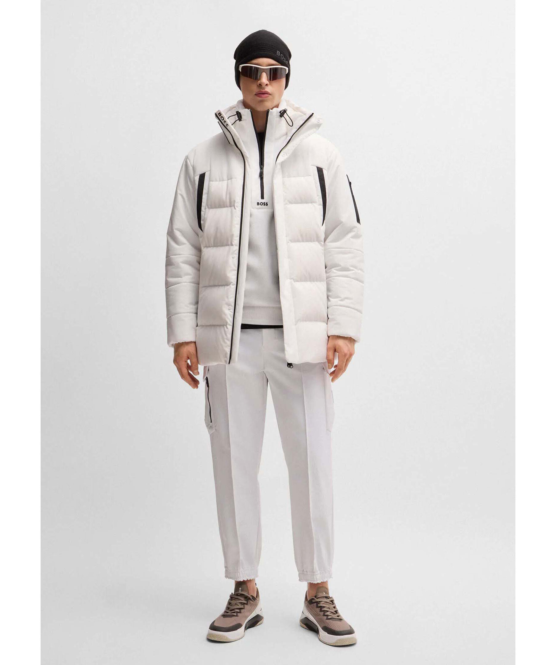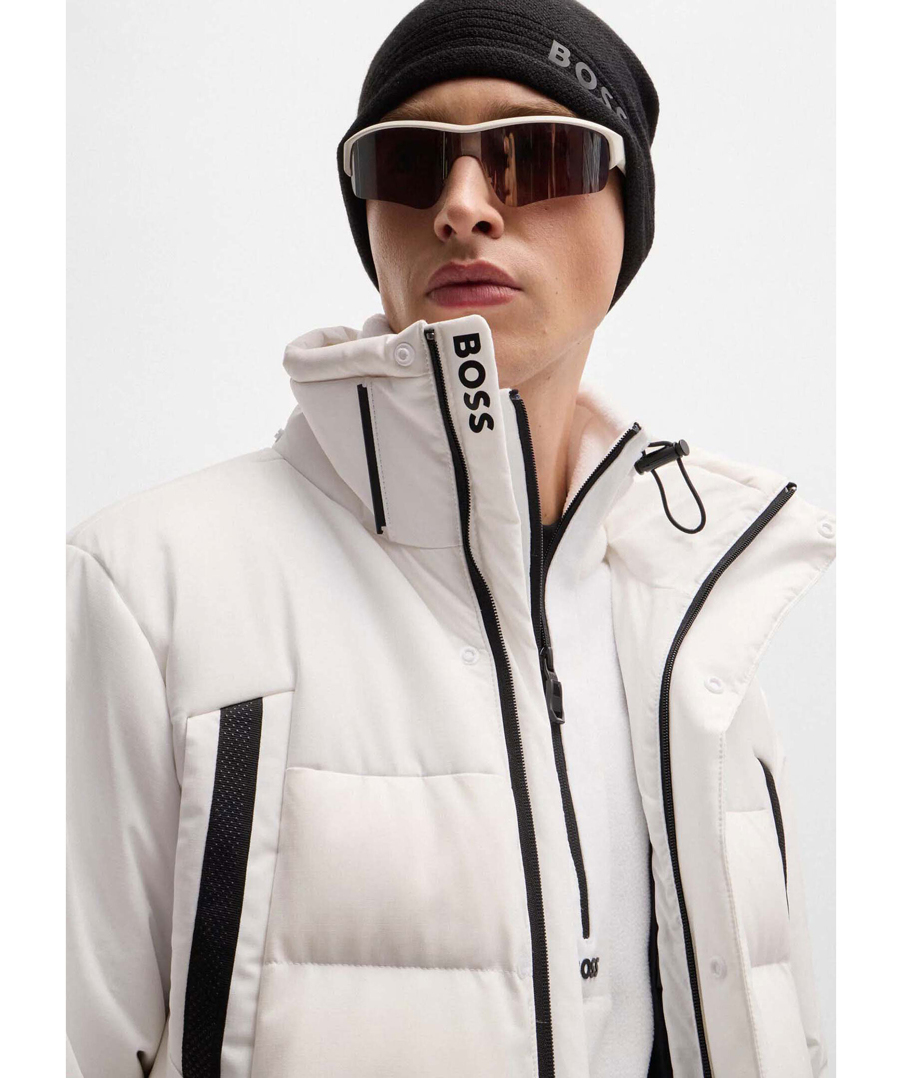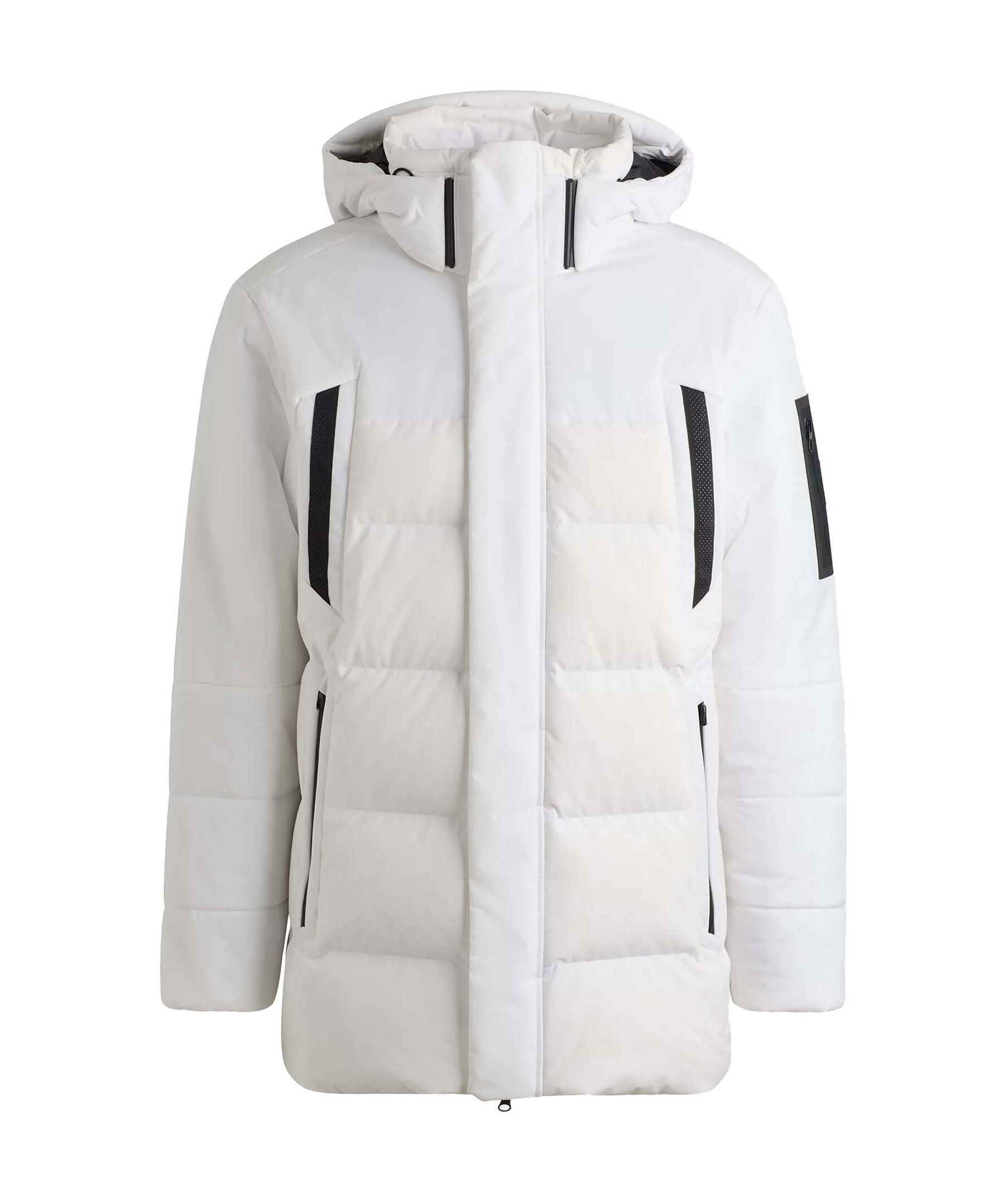 Vit, tjock parka från BOSS Green. Jackan stängs med tvåvägsdragkedja och har justerbar och avtagbar huva, flera fickor med dragkedja – några fodrade med mysig fleece – på framsidan, bröstet, ärmen och fodret, plus en hörlursficka. Elastiska muddar vid ärmslut och logotyp vid ärmfickan. Jackan är tillverkad i polyester och fylld med certifierat ankdun och fjäder och tillverkad av slitstarkt, vattenavvisande ripstop.