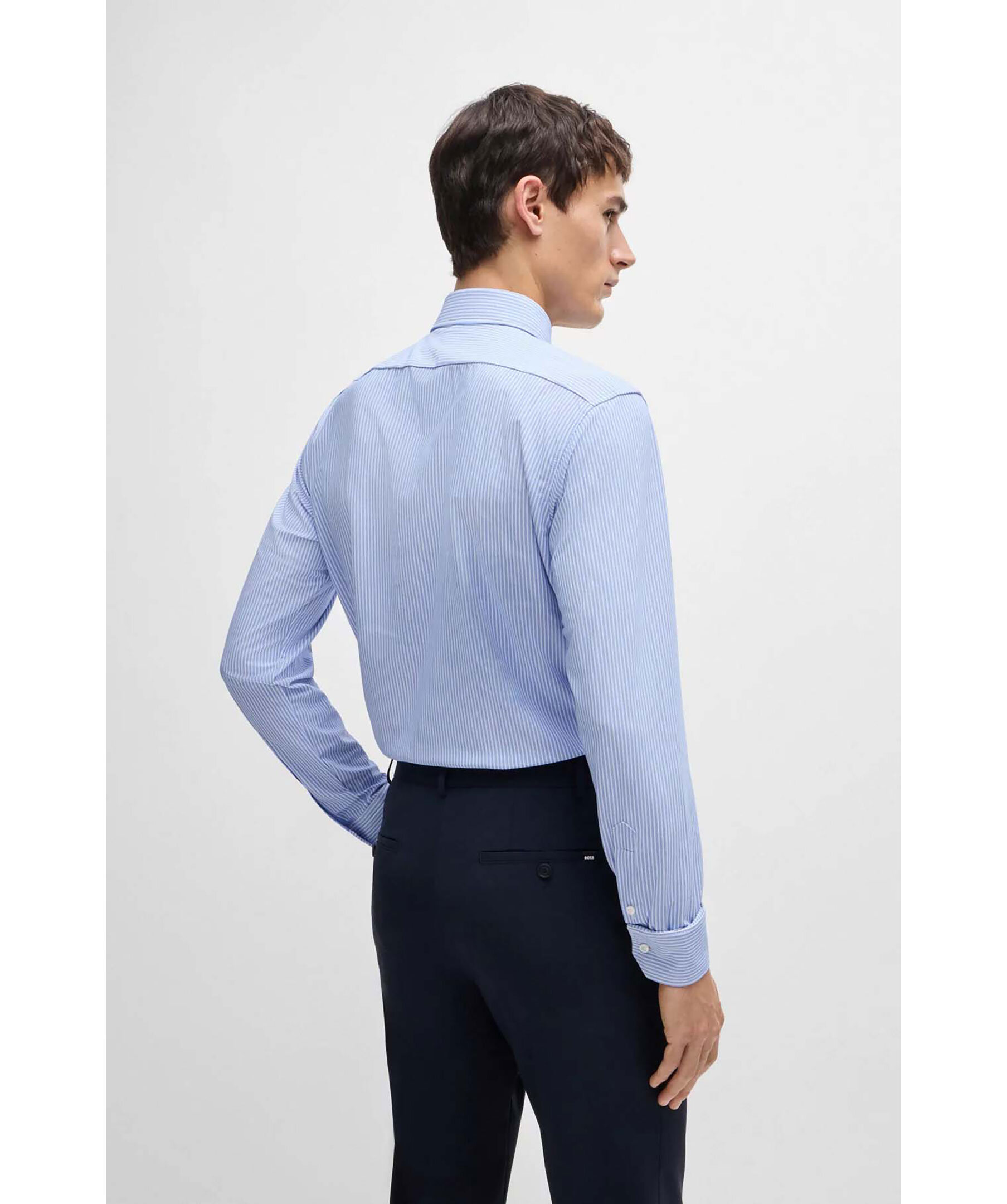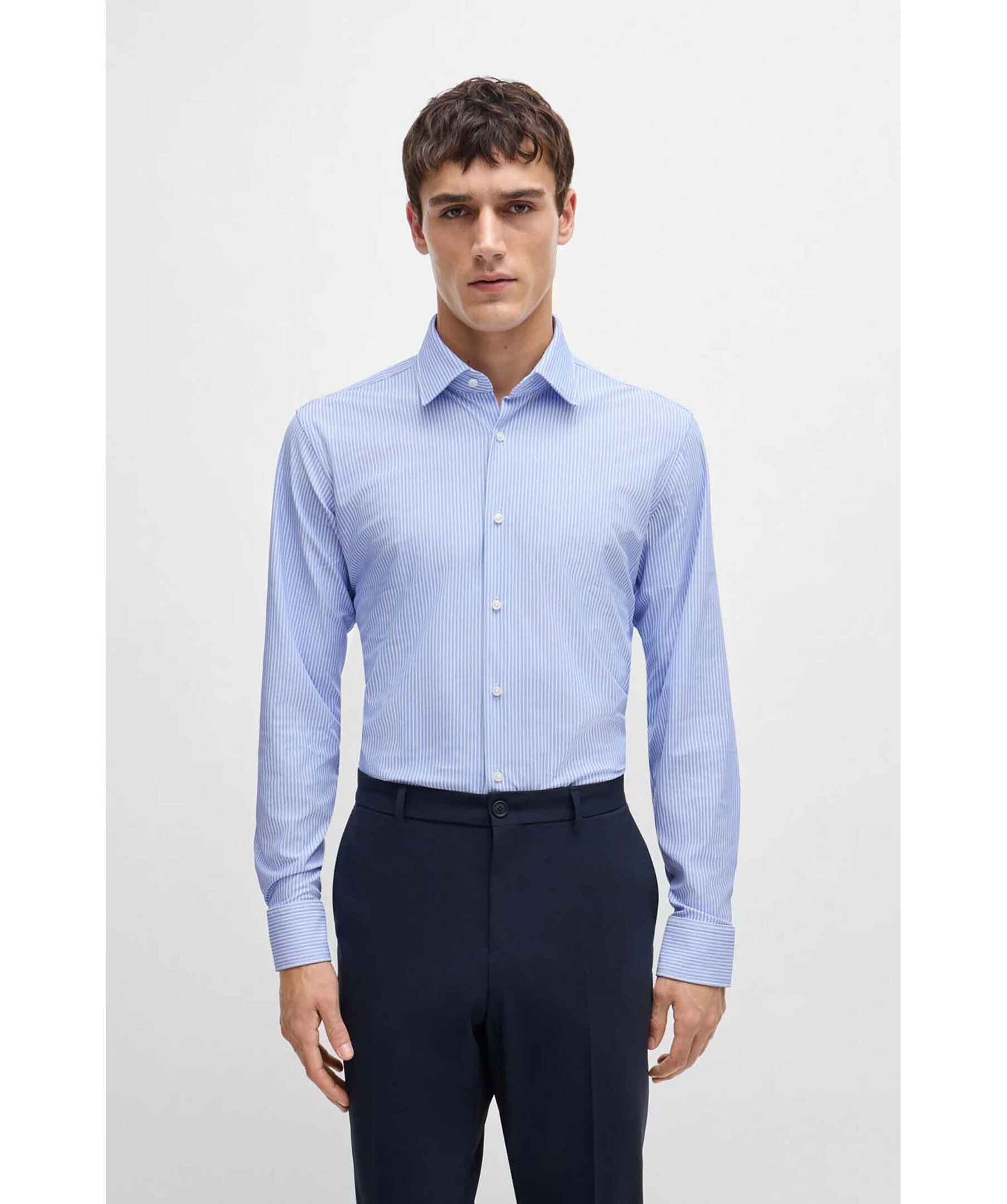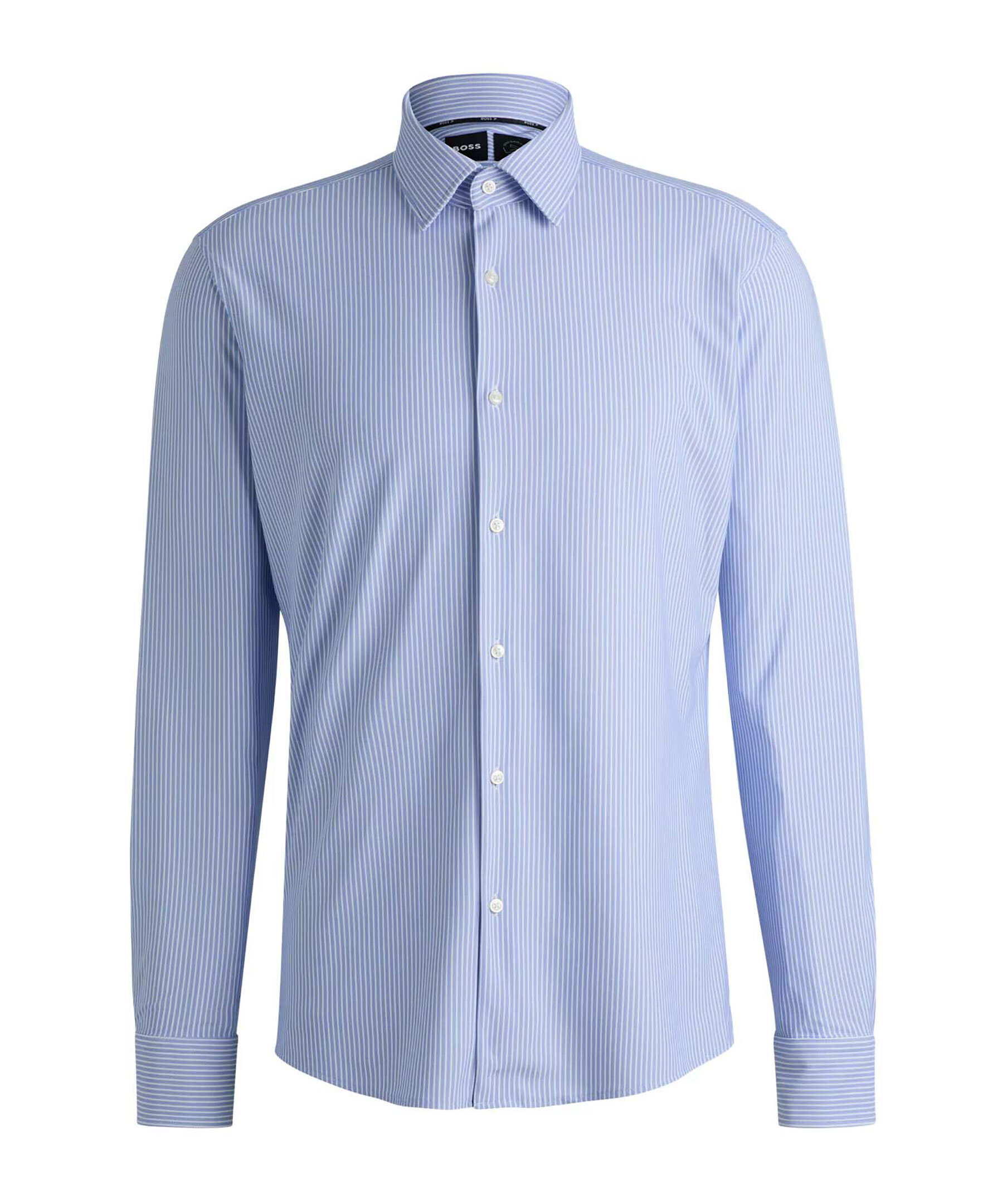 Blå och vitrandig skjorta från Boss Black. Skjortan är tillverkad i performance material och har en rak passform och har en kent krage. Tillverkad av polyester.