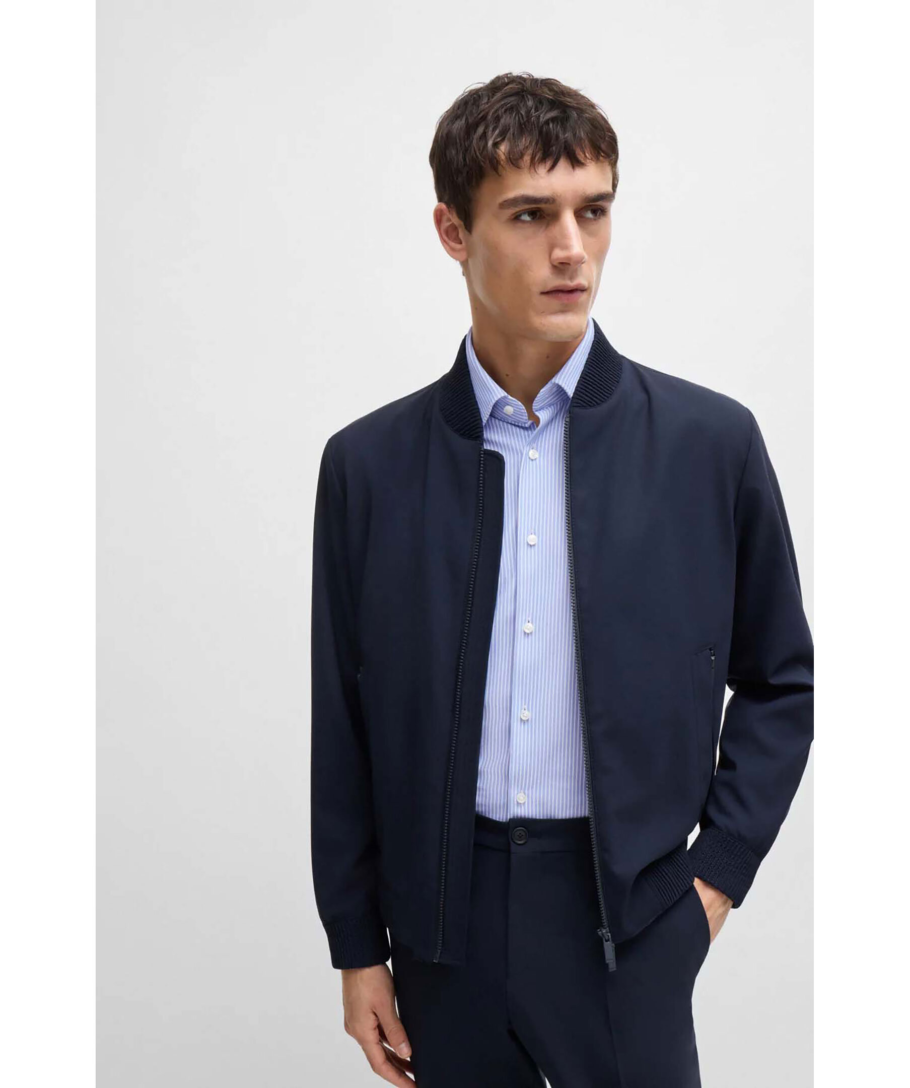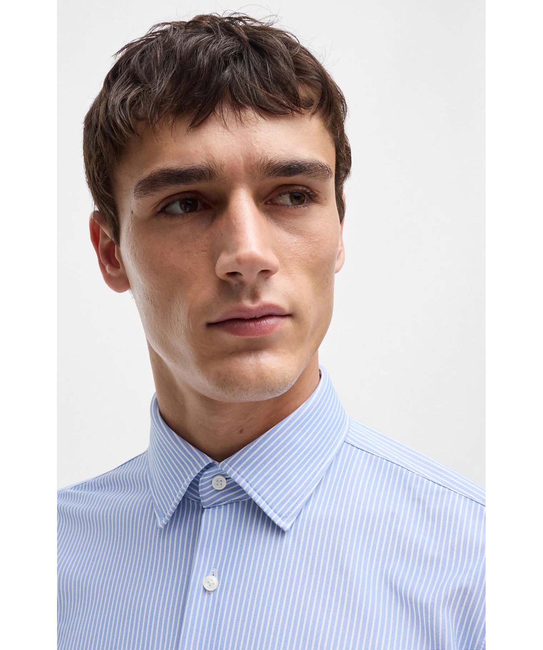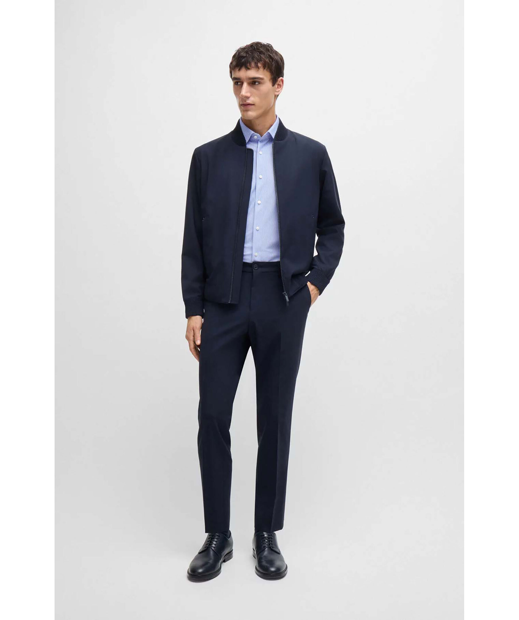 Blå och vitrandig skjorta från Boss Black. Skjortan är tillverkad i performance material och har en rak passform och har en kent krage. Tillverkad av polyester.