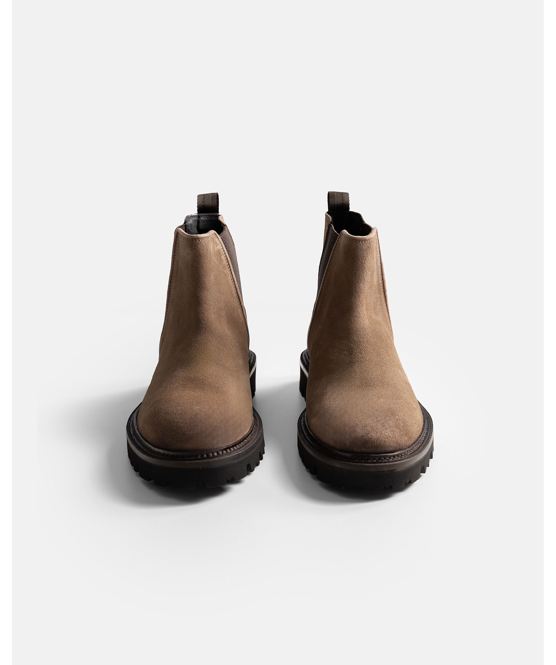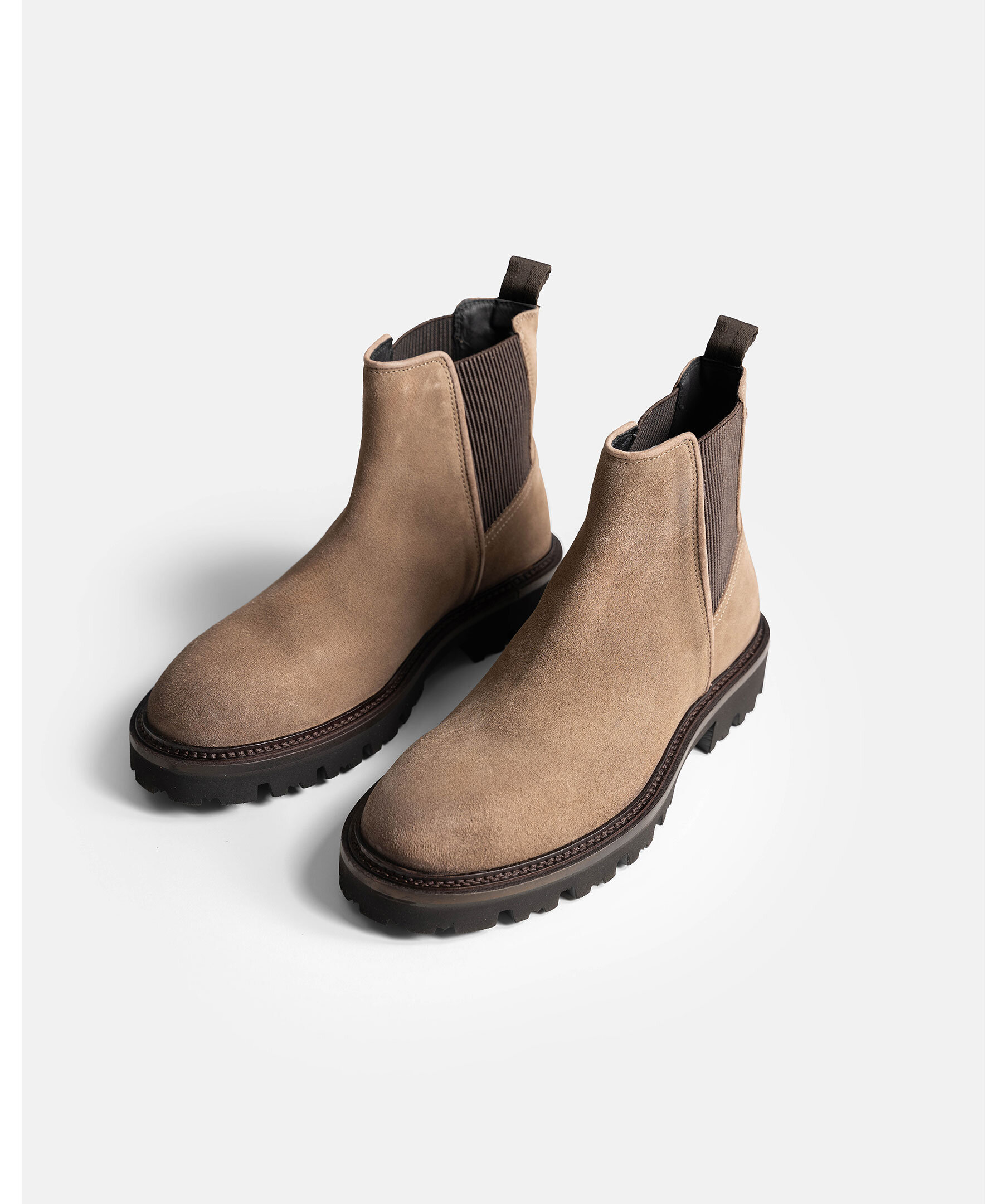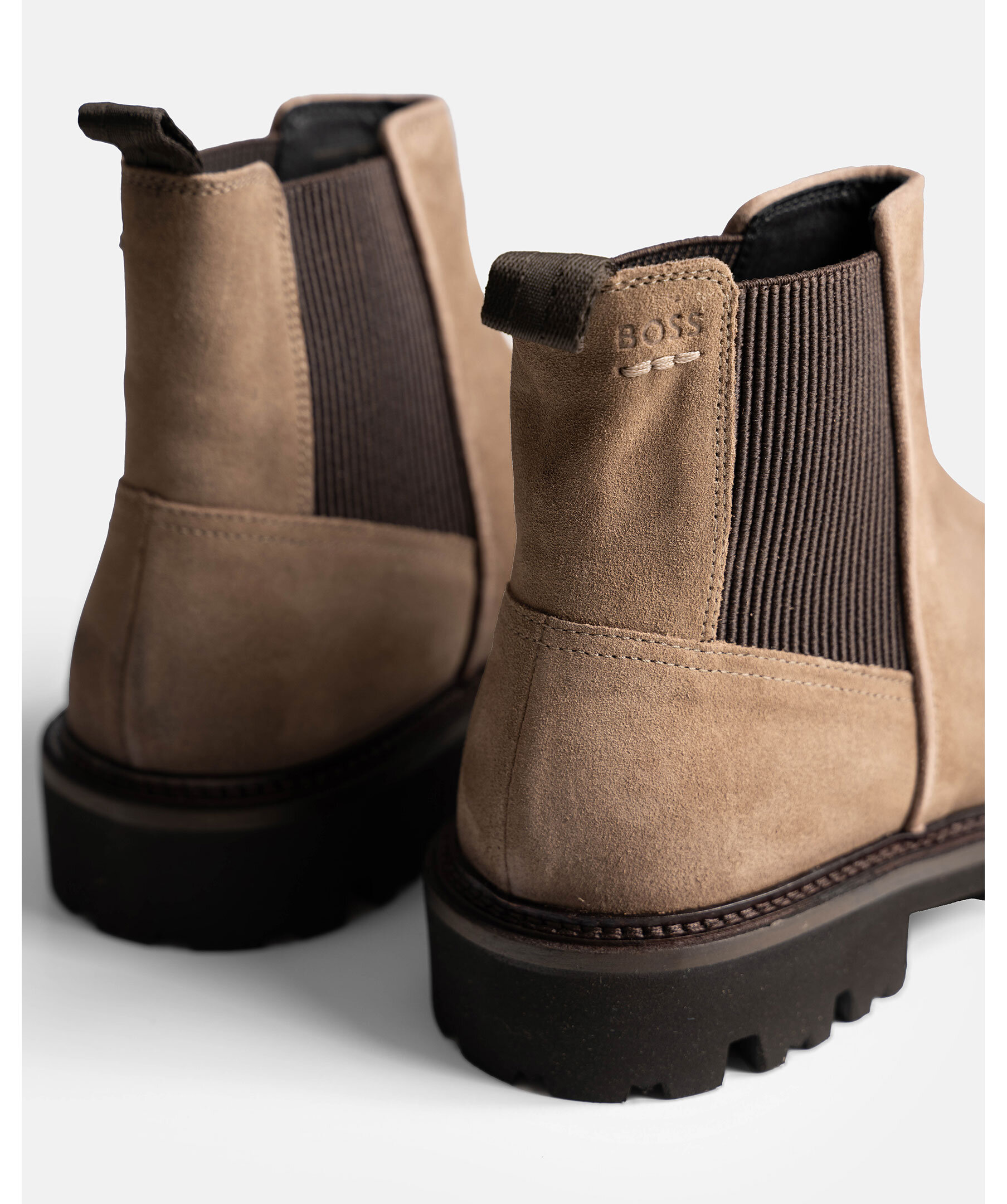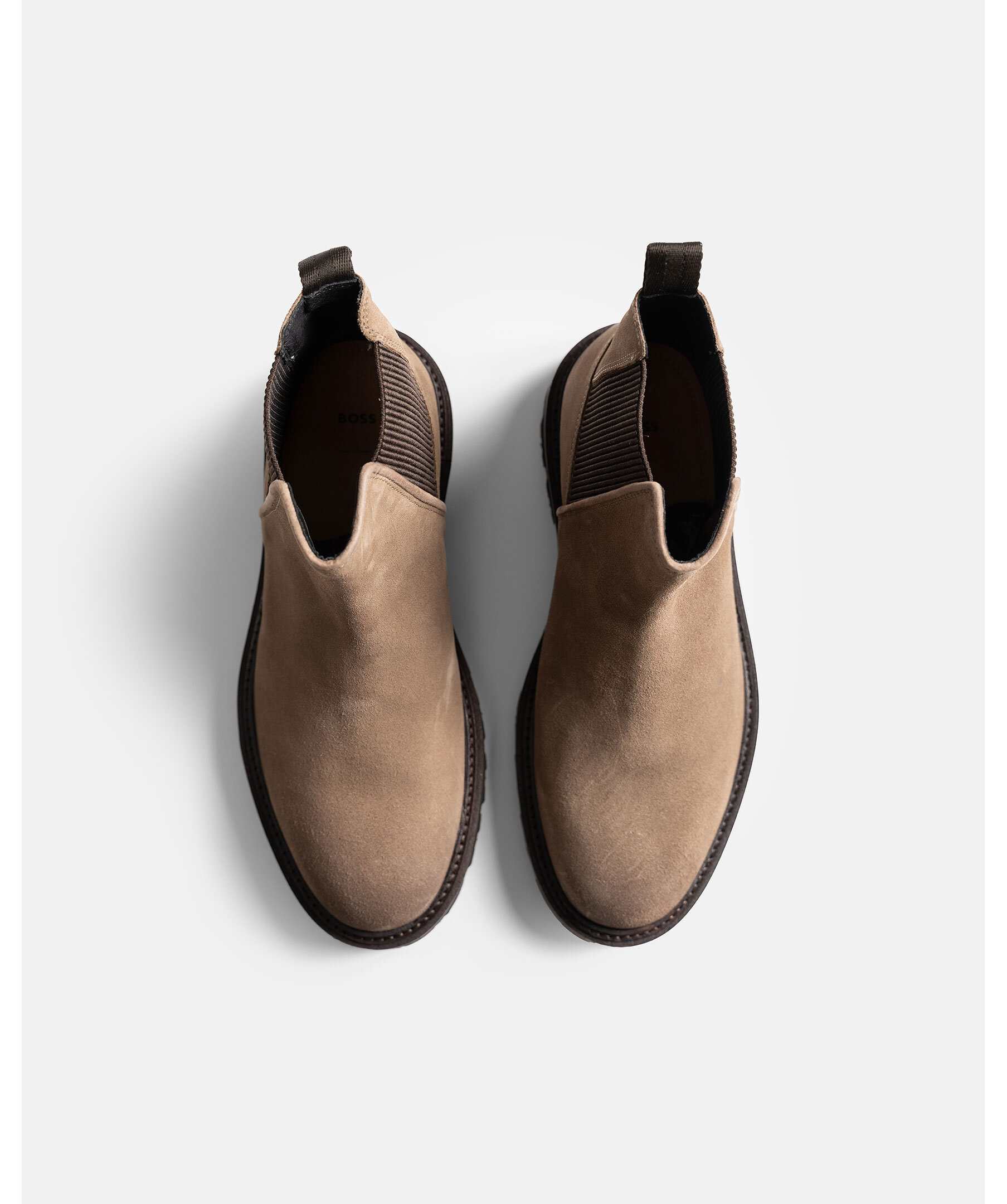 Chelsea boots från BOSS. En klassiker i ny tappning med grovmönstrad yttersula. Ovandel i mocka. Elastiska paneler. Stansad logotyp på sidan.