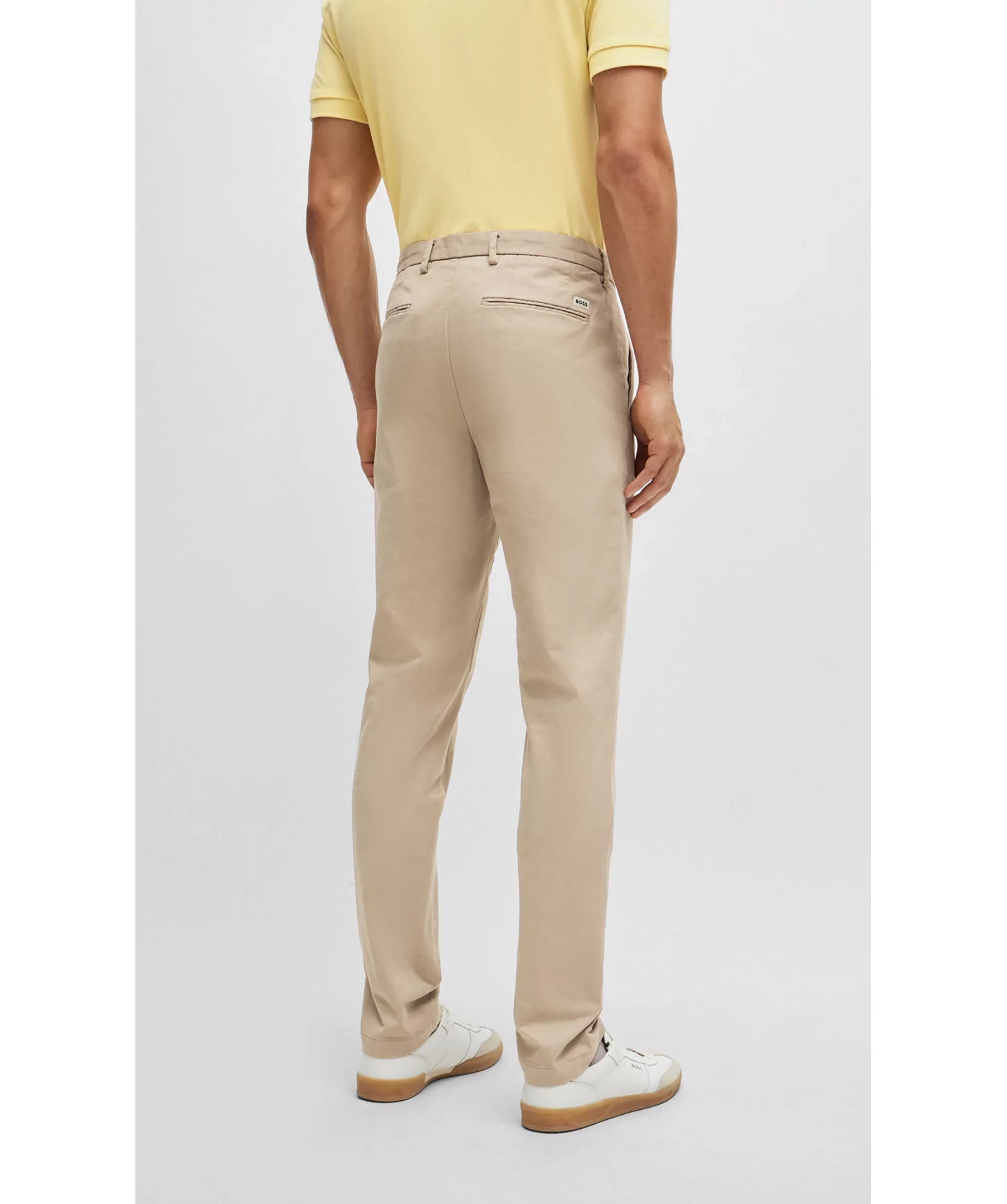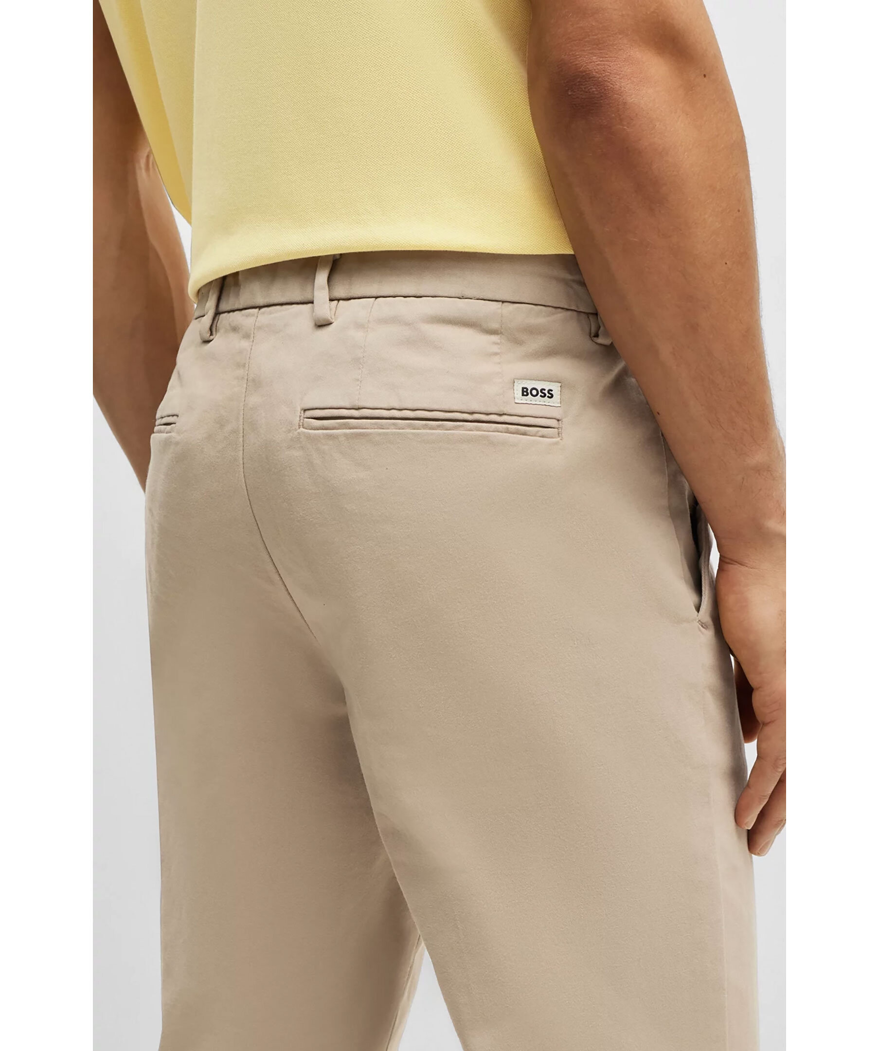 Beigea texturerade byxor från BOSS Black. Tillverkade i en bomullsblandning. Två snedställda sidfickor, två bakfickor samt en lite svart och vit logotyp över högra bakfickan. Bälteshällor.