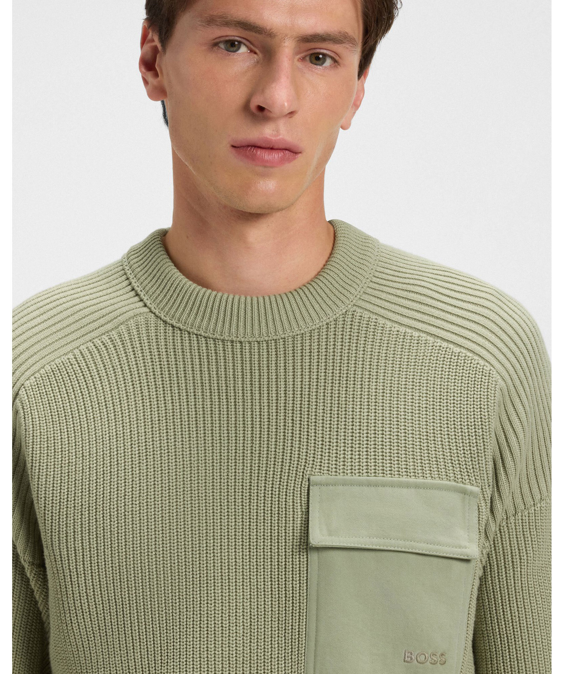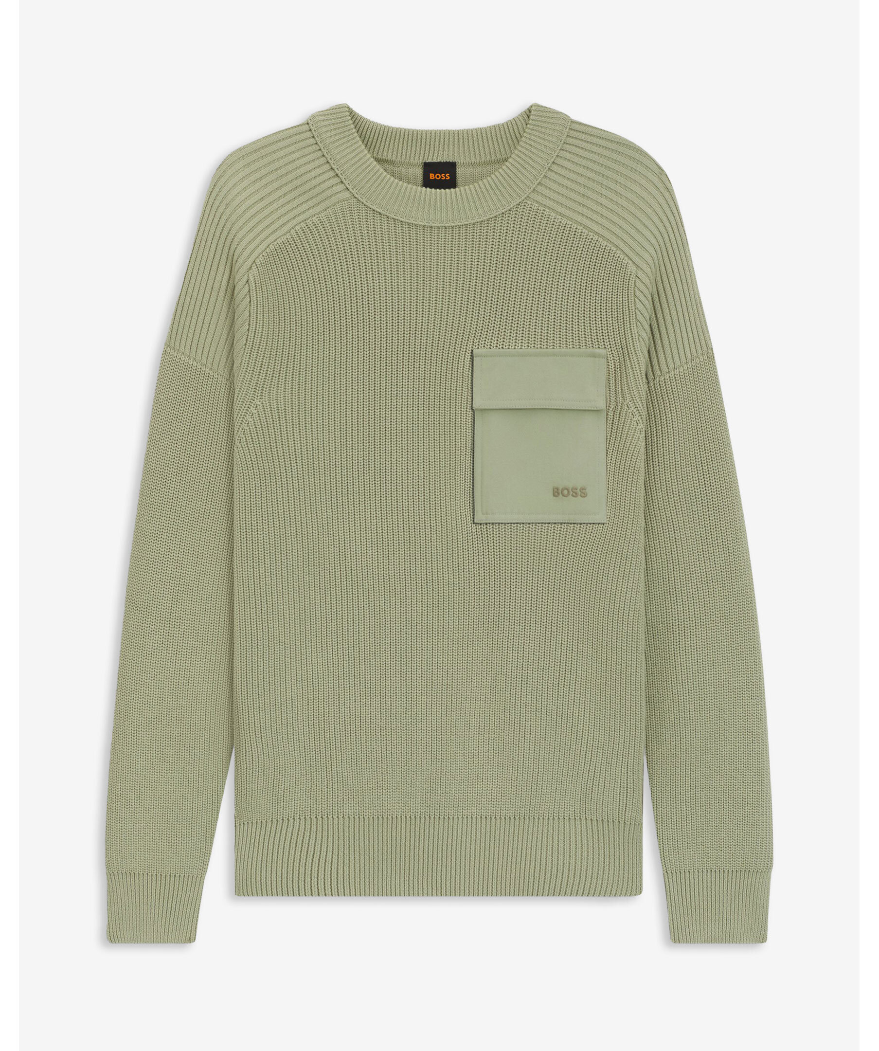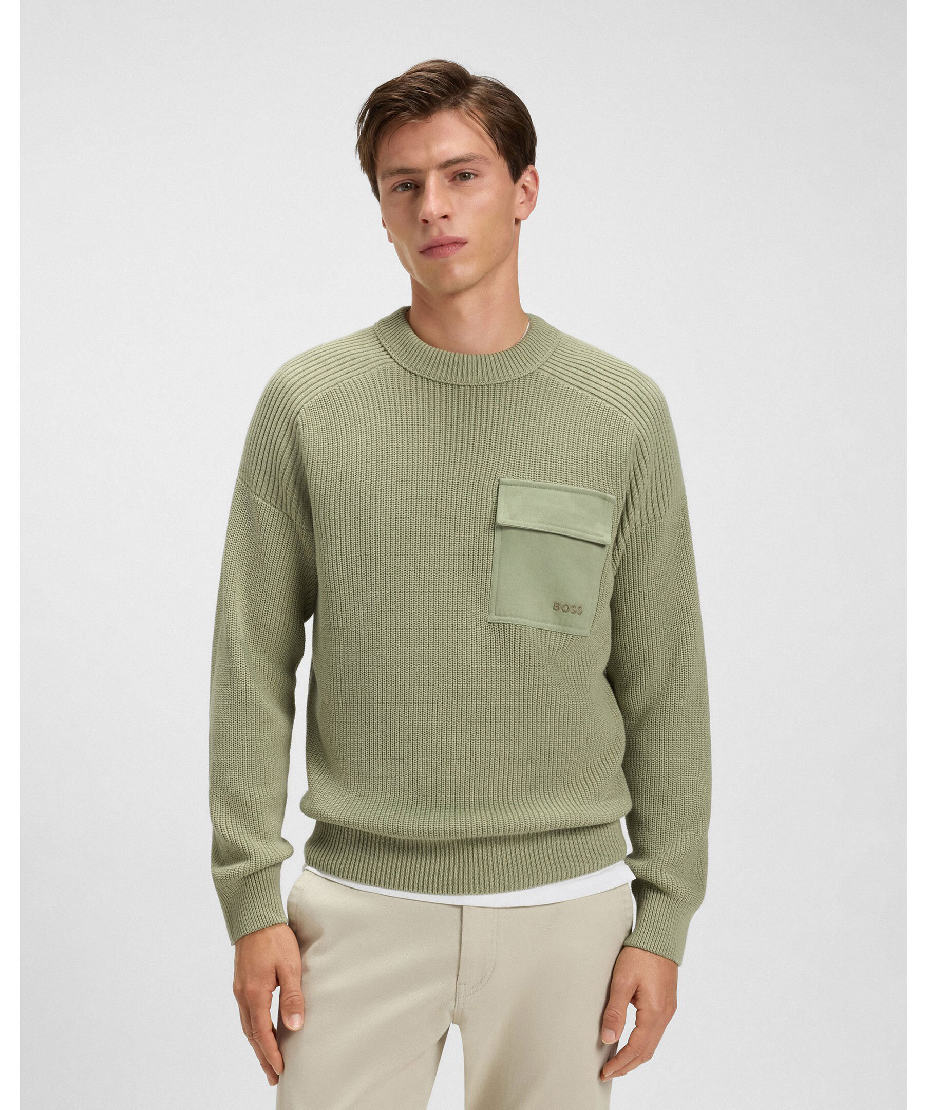Grön, ribbstickad tröja från BOSS Orange. Bröstficka i kontrasttyg. Avslappnad passform.