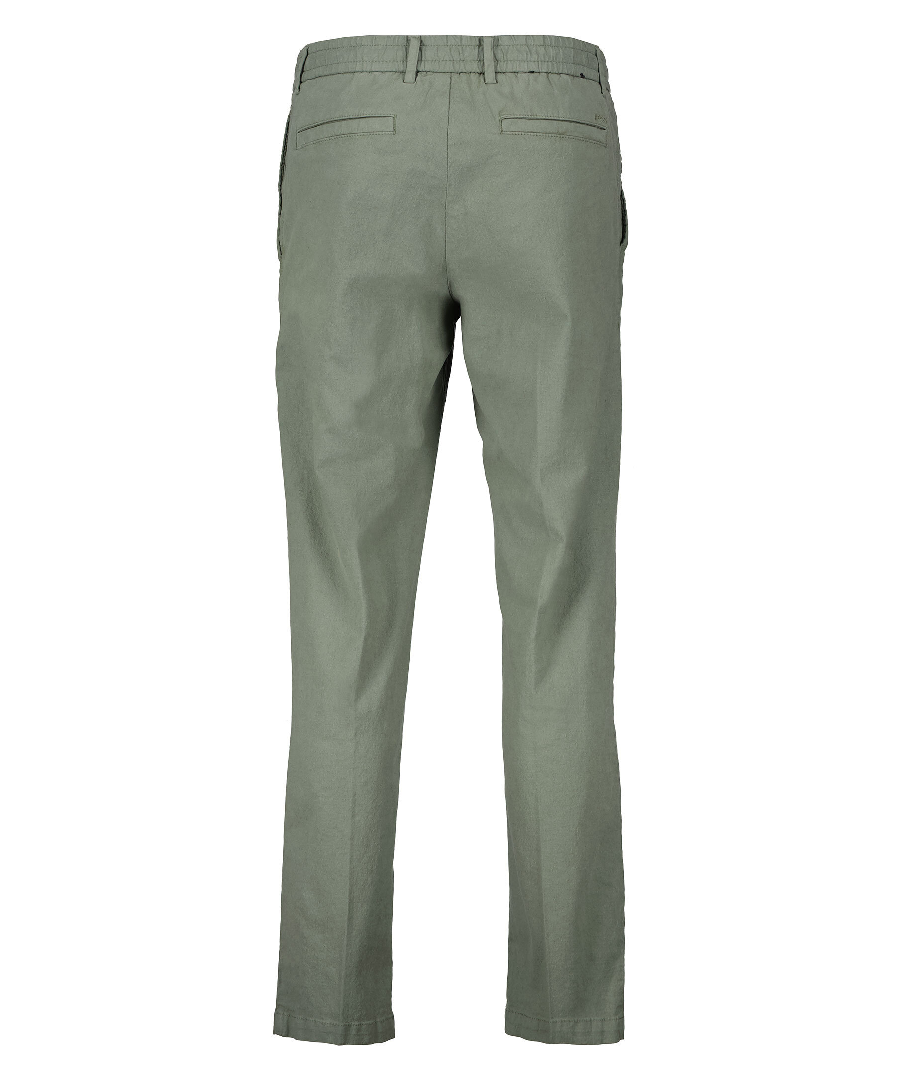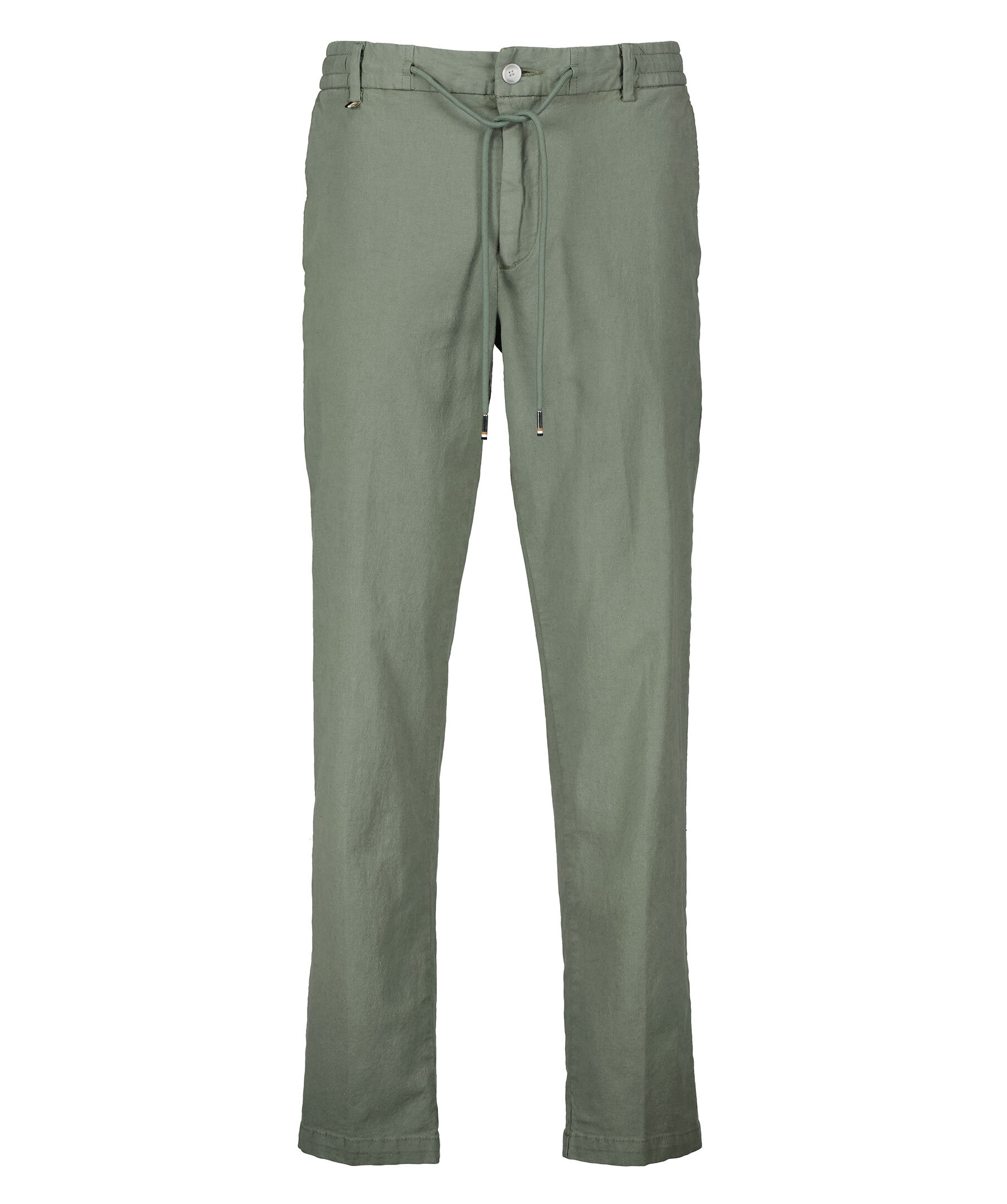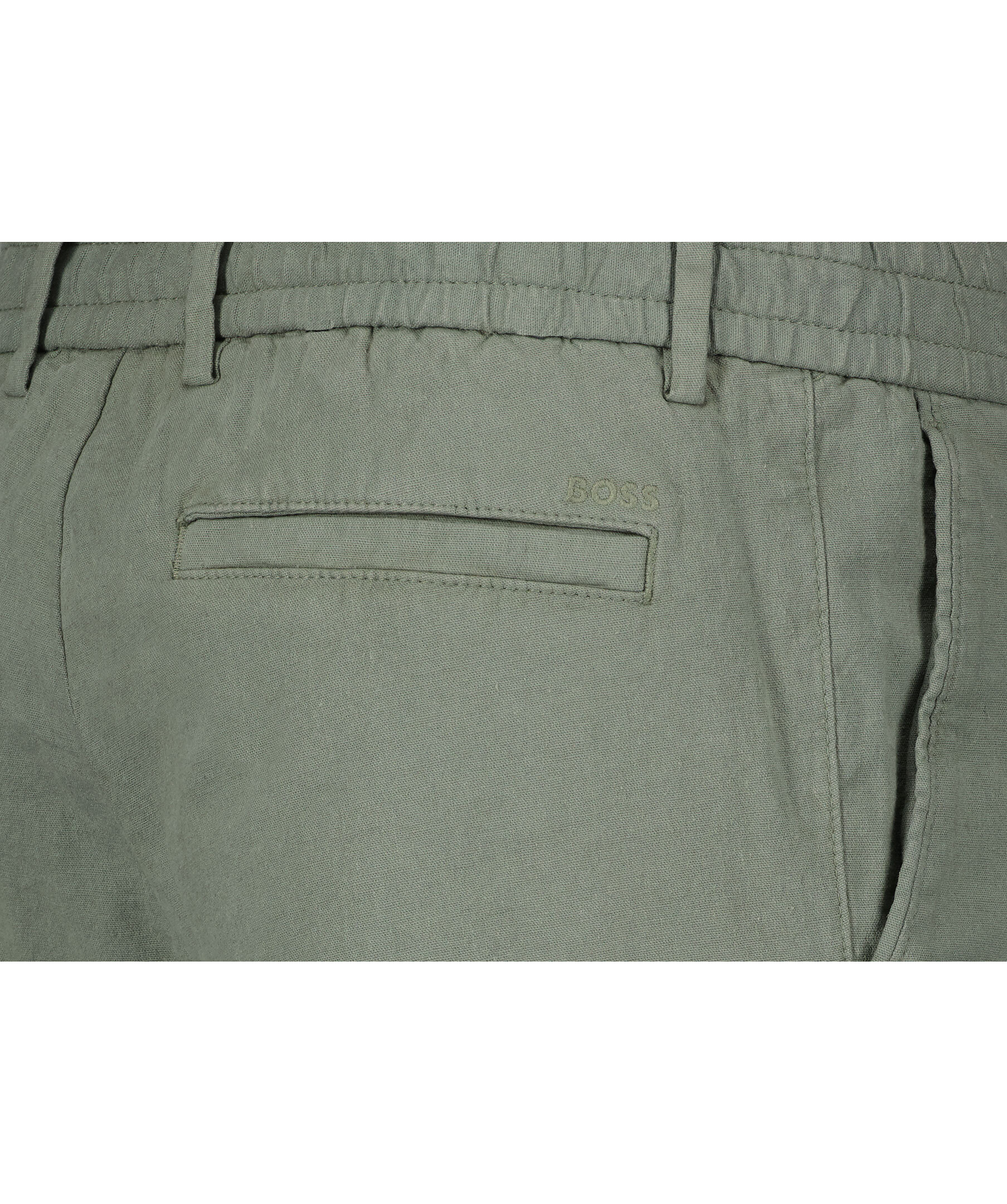 Olivgröna linnebyxor i stretchig linne- och bomullsblandning från BOSS Black. Byxorna har en Slim tapered fit, två snedställda fickor framtill och två passpoalfickor bak med en ton-i-ton broderad logga över den högra bakfickan. Mudd och hällor för skärp i midjan samt snörning för justerbar midja. Gylf med dold dragkedja och knapp.