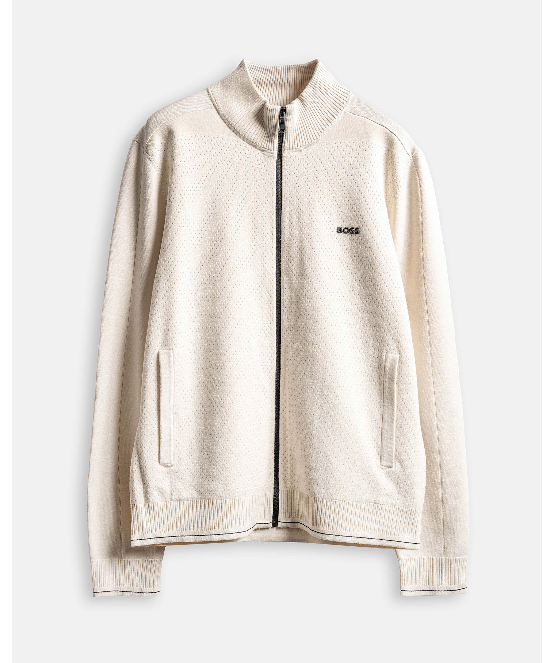 Vit zip-kofta i regular fit från BOSS. Stickad med en kreativ struktur framtill. Ribbade detaljer.