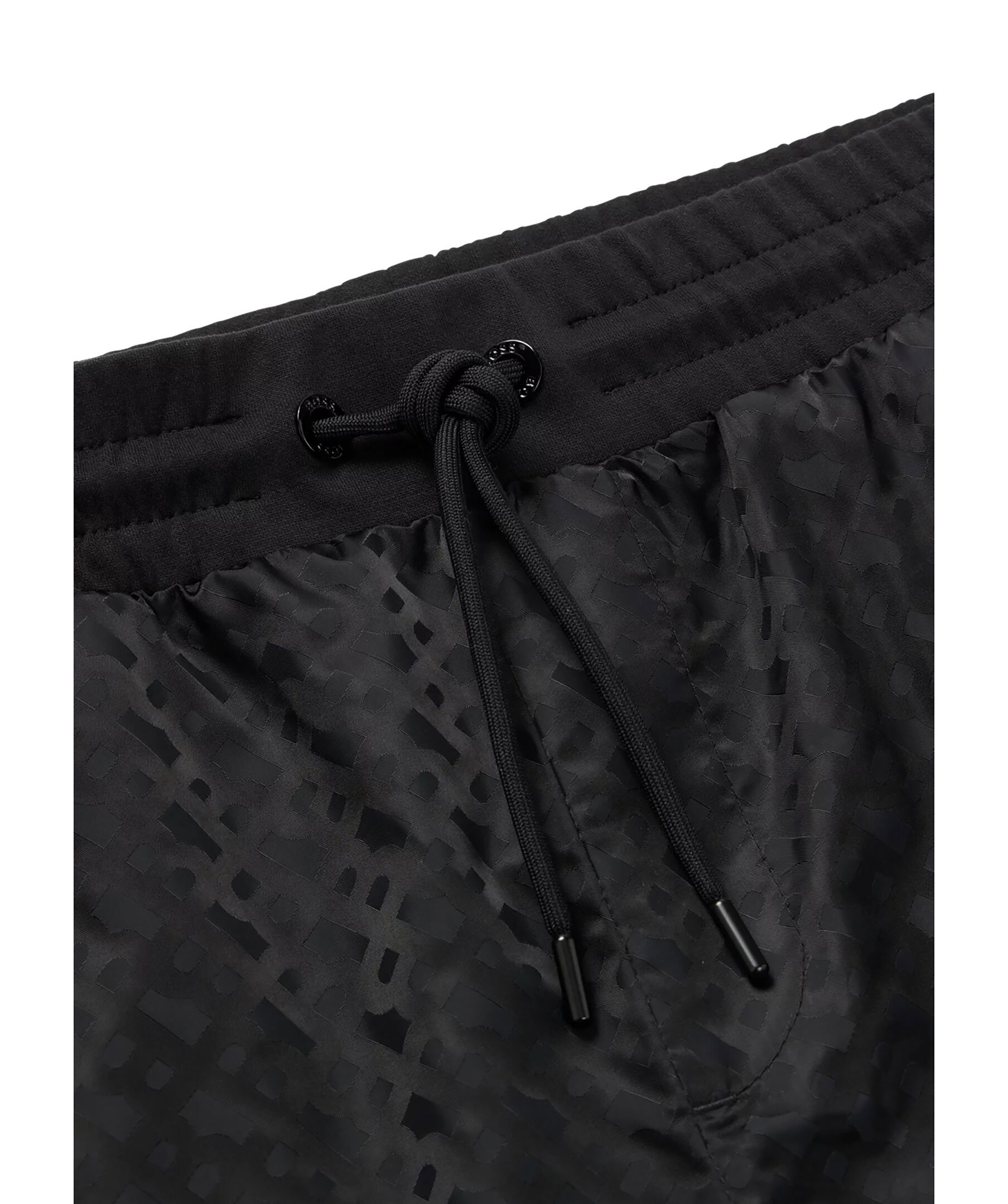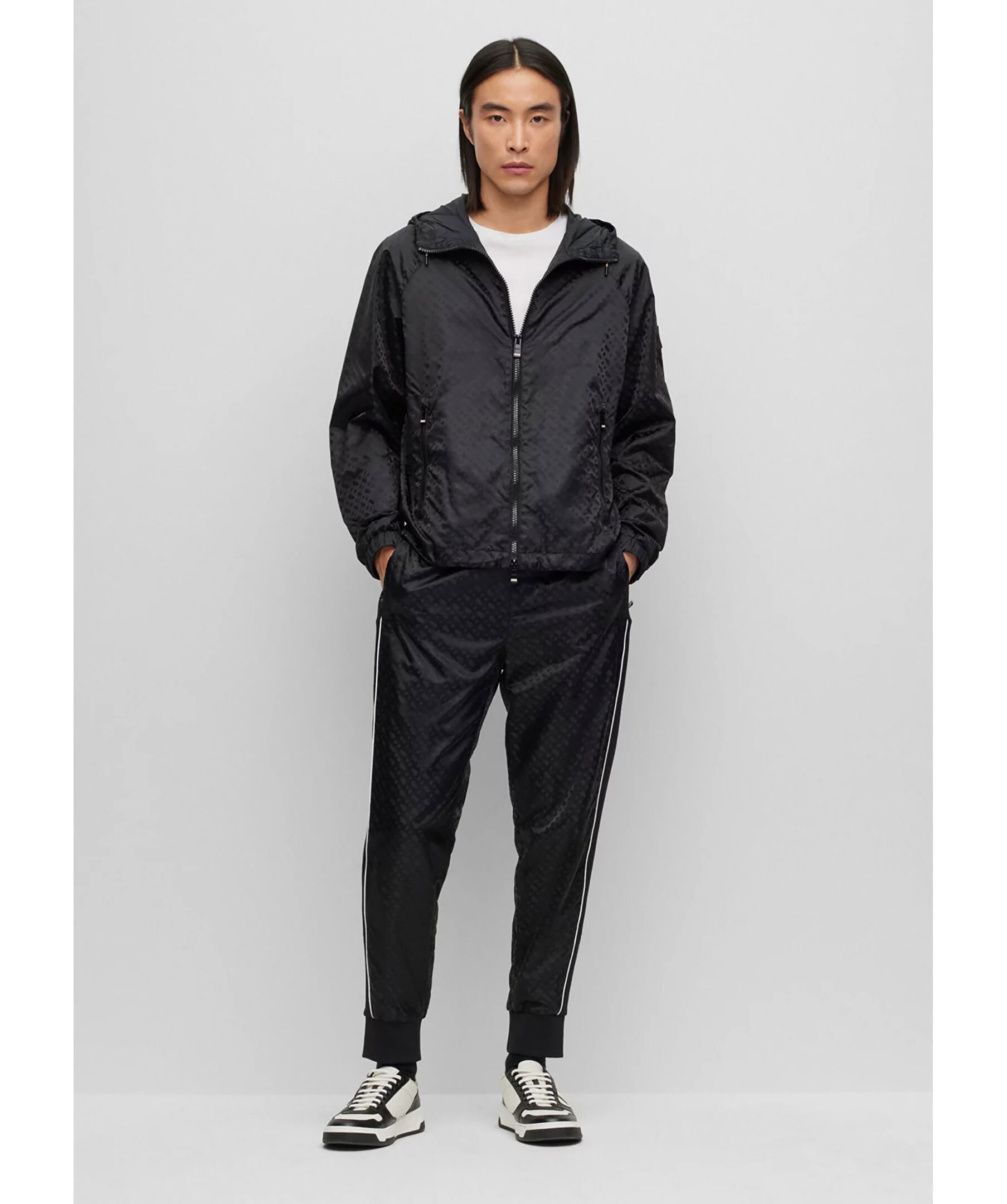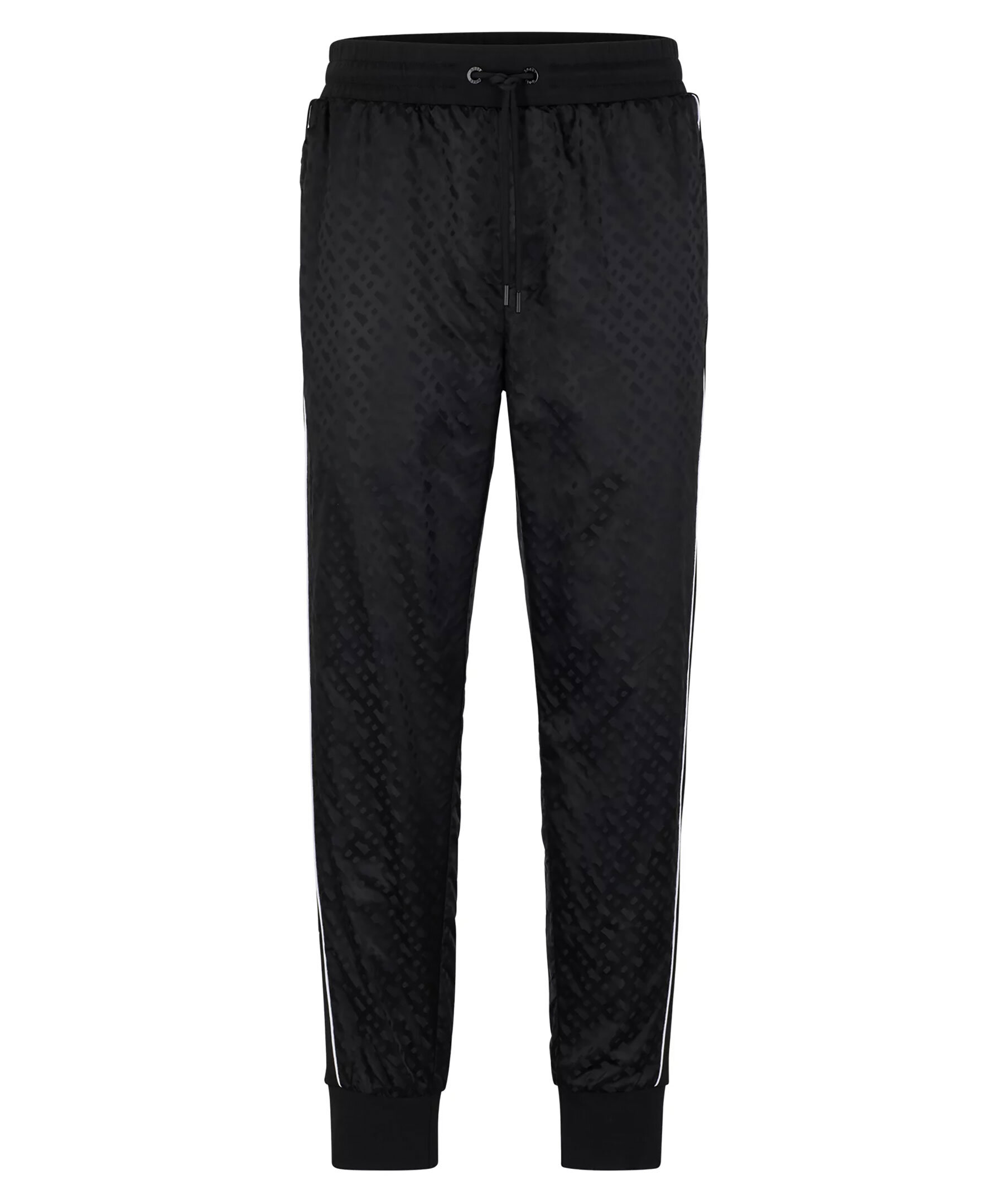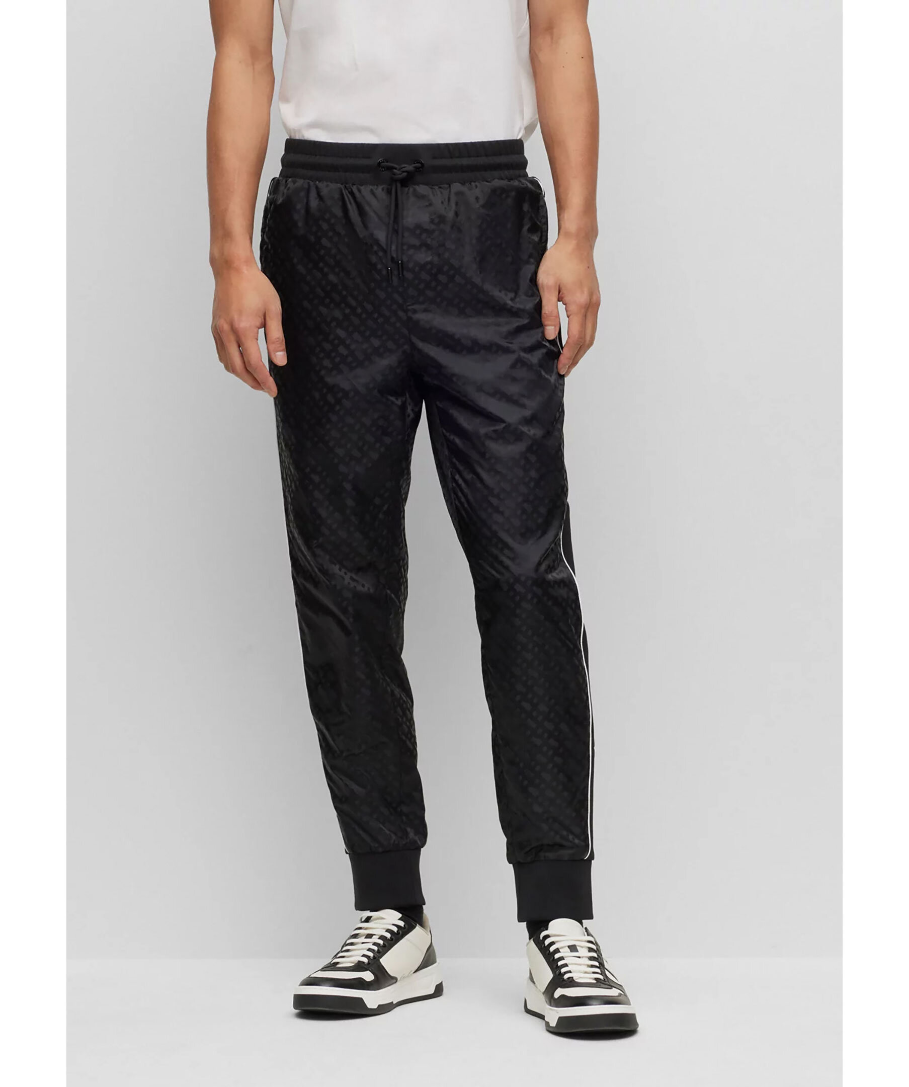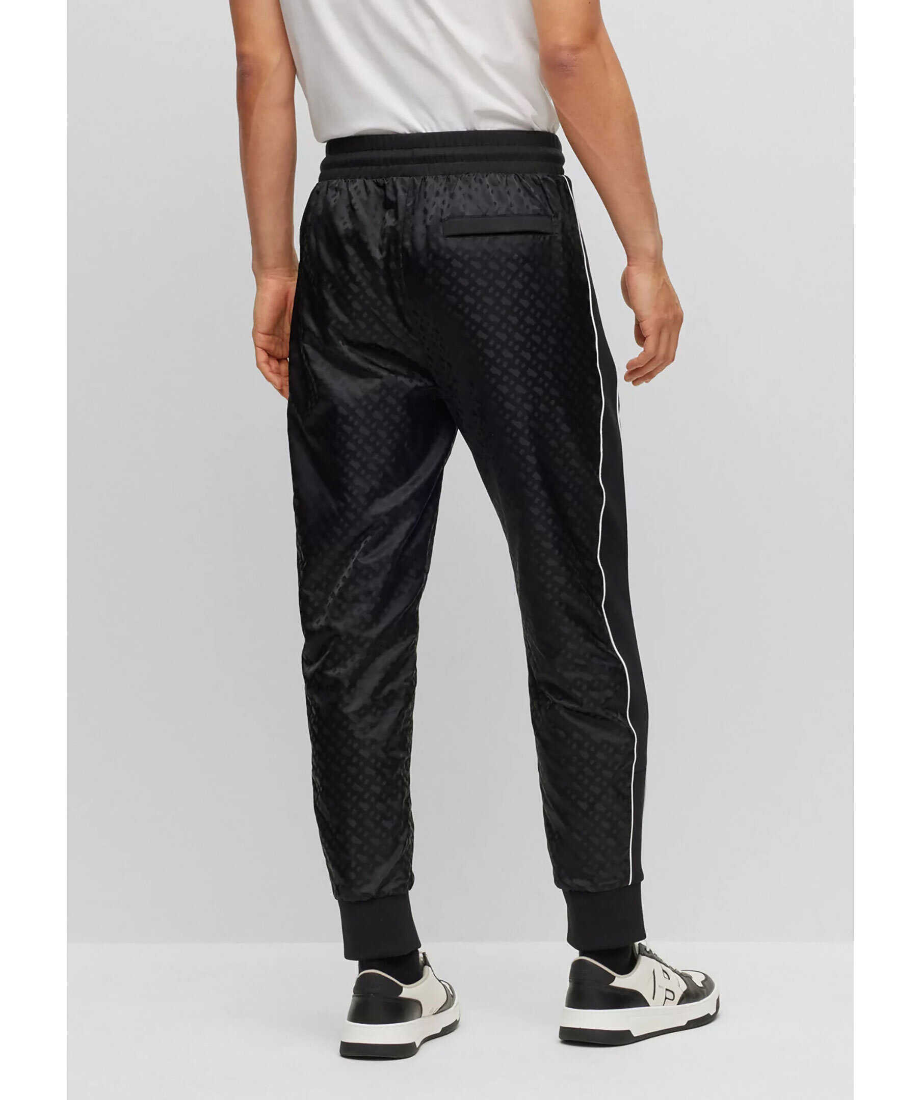 Svarta träningsbyxor med normal passform från BOSS Black. Tillverkad i en bomullsblandning med monogram och med flatstickade ränder på sidsömmarna. Byxorna har dragsko i midjan, två sidfickor samt en passpoalficka på baksidan.