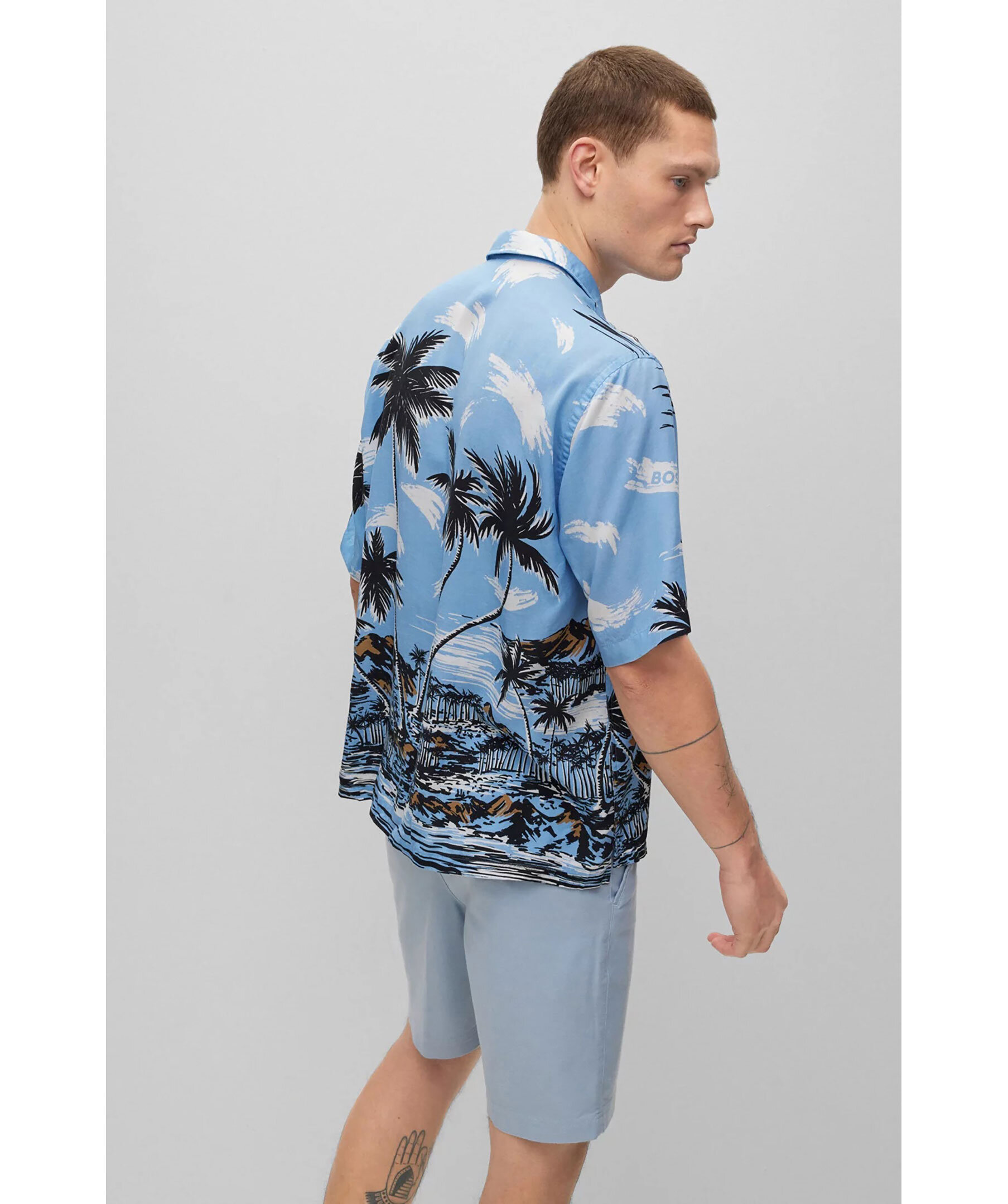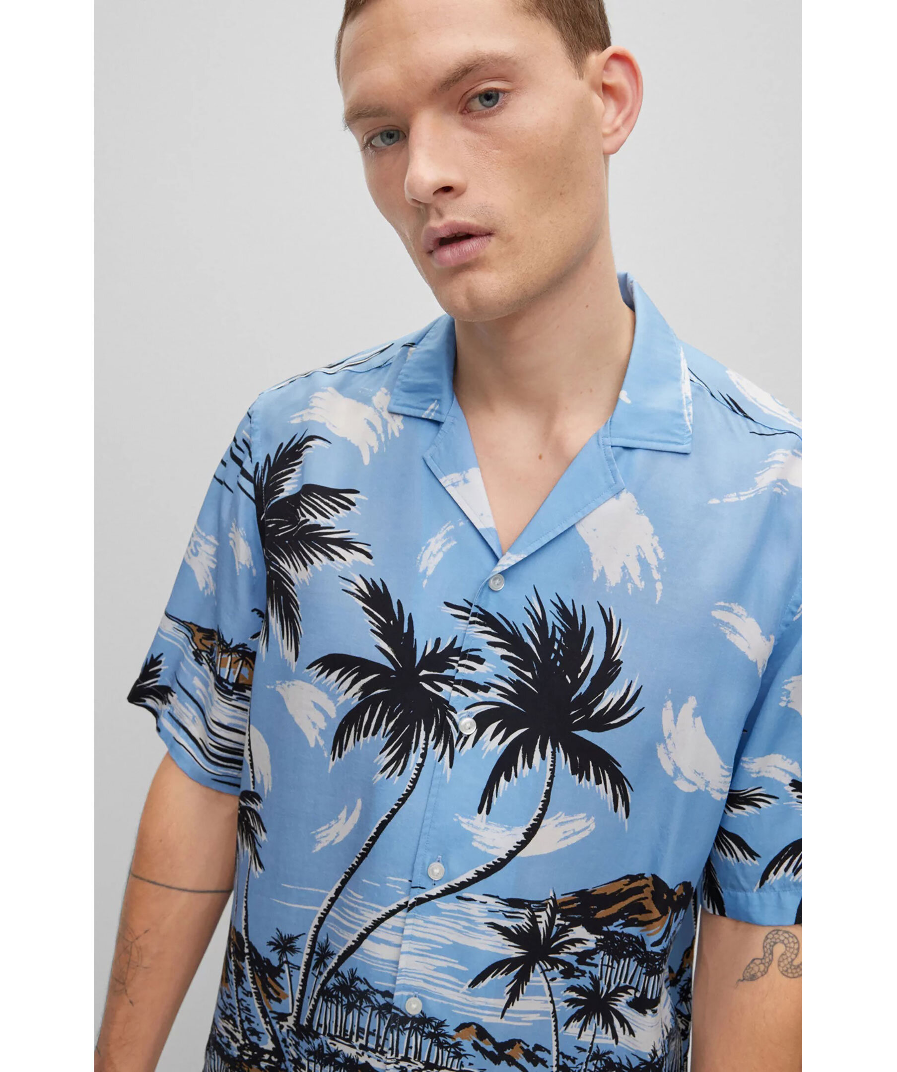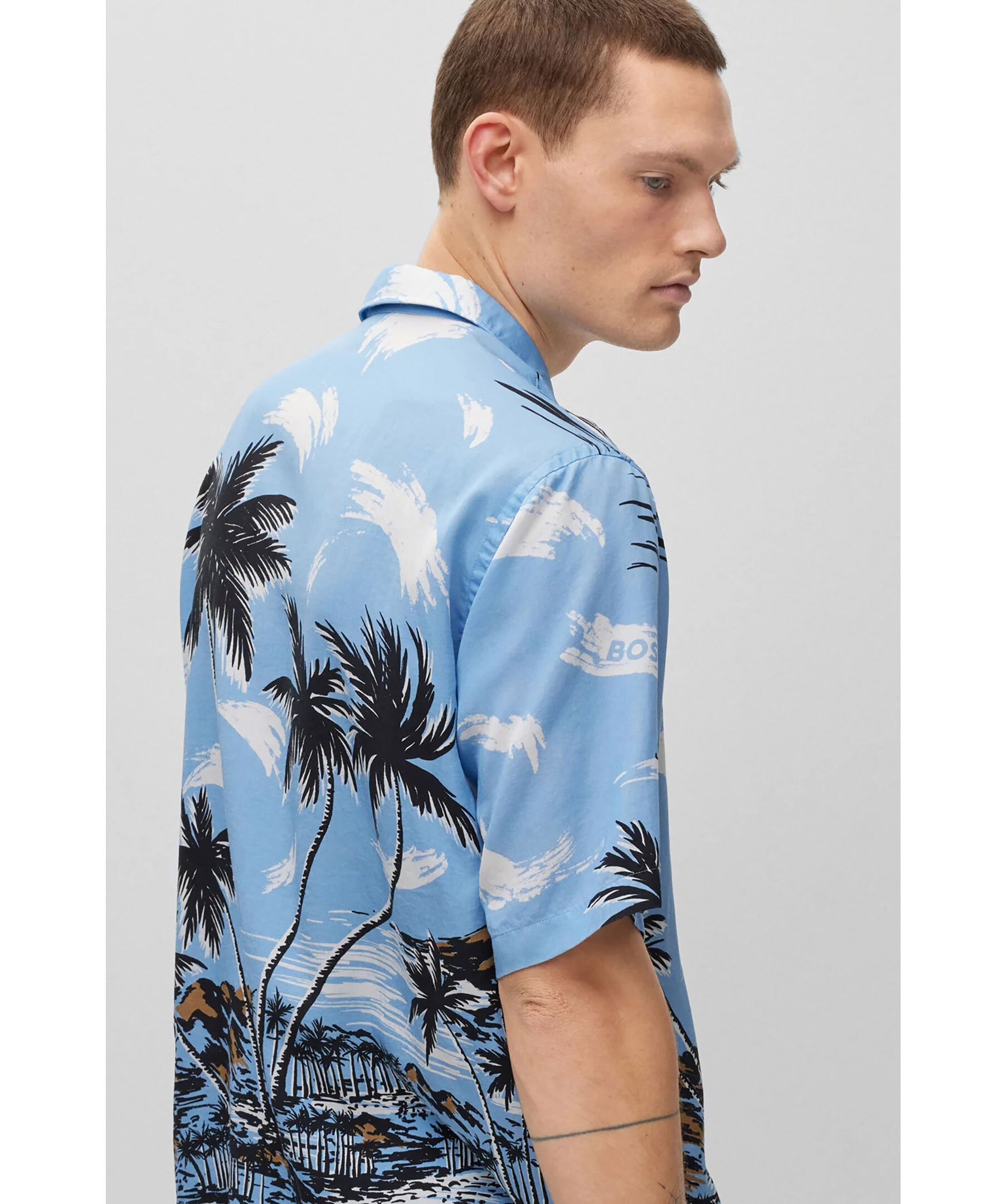 Ljusblå kortärmad skjorta från BOSS Black med Hawaii-inspirerat tryck. Tillverkad i 100% lyocell. Korta slitsar i sidorna.