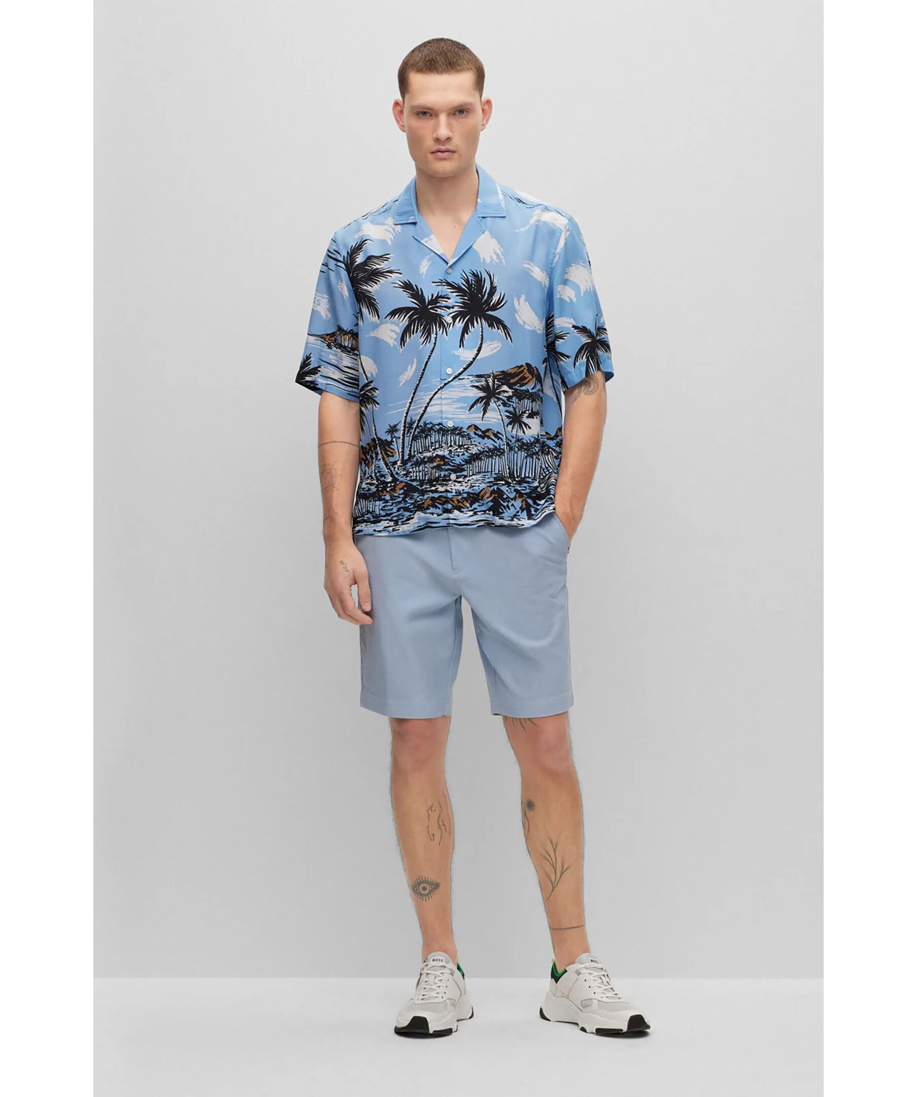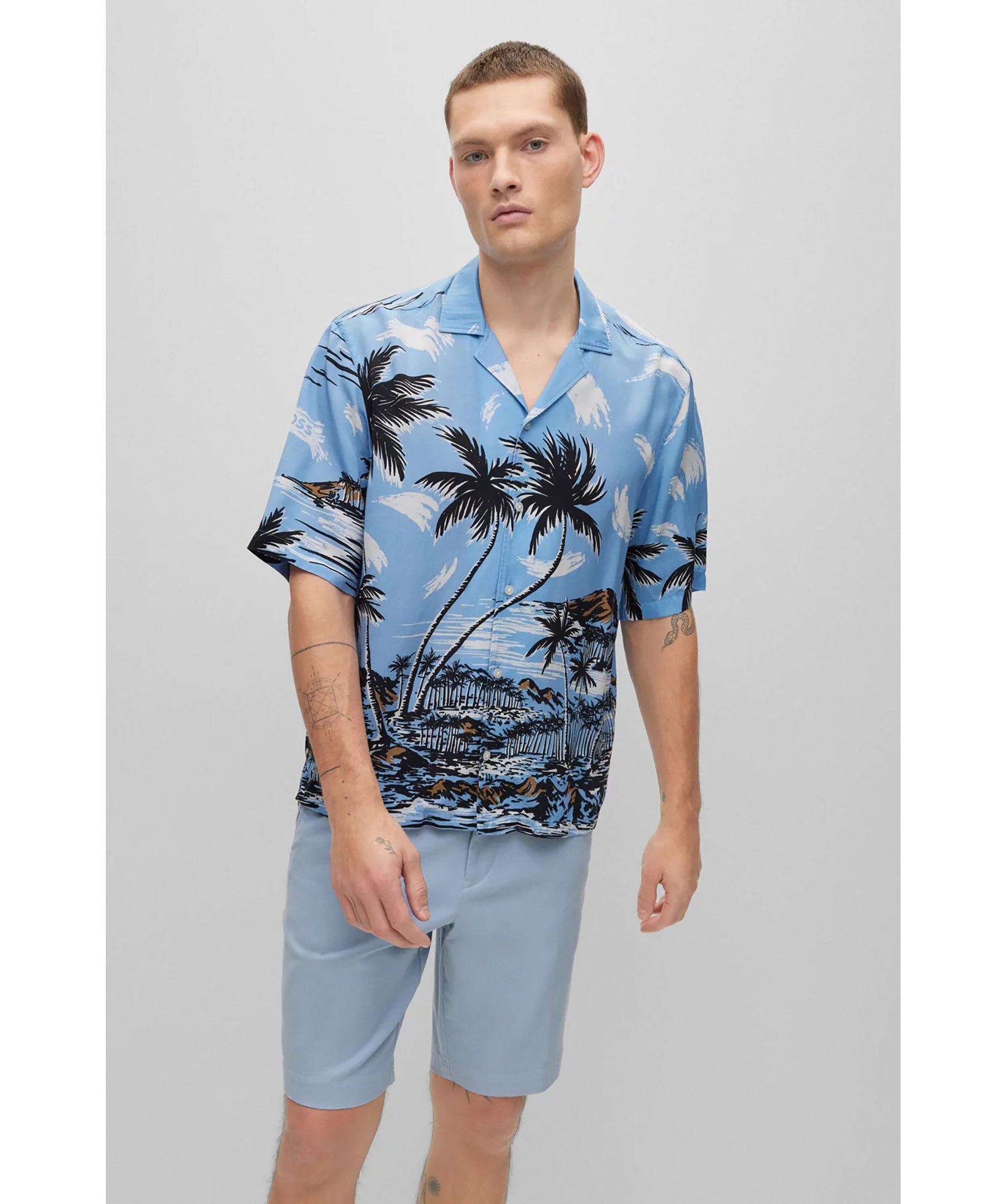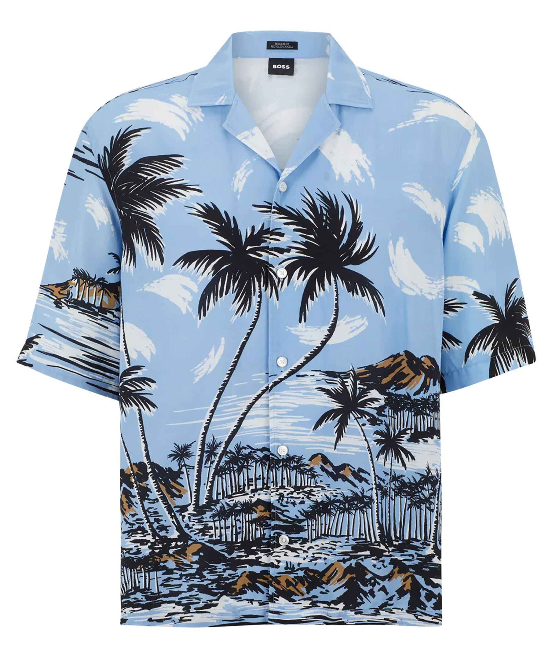Ljusblå kortärmad skjorta från BOSS Black med Hawaii-inspirerat tryck. Tillverkad i 100% lyocell. Korta slitsar i sidorna.