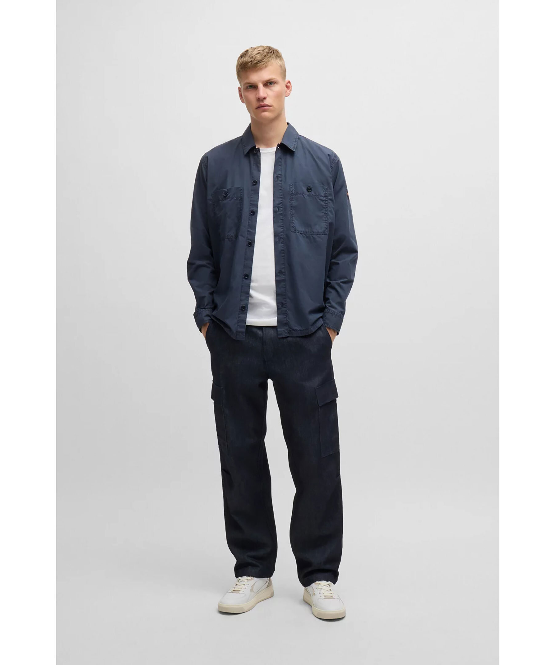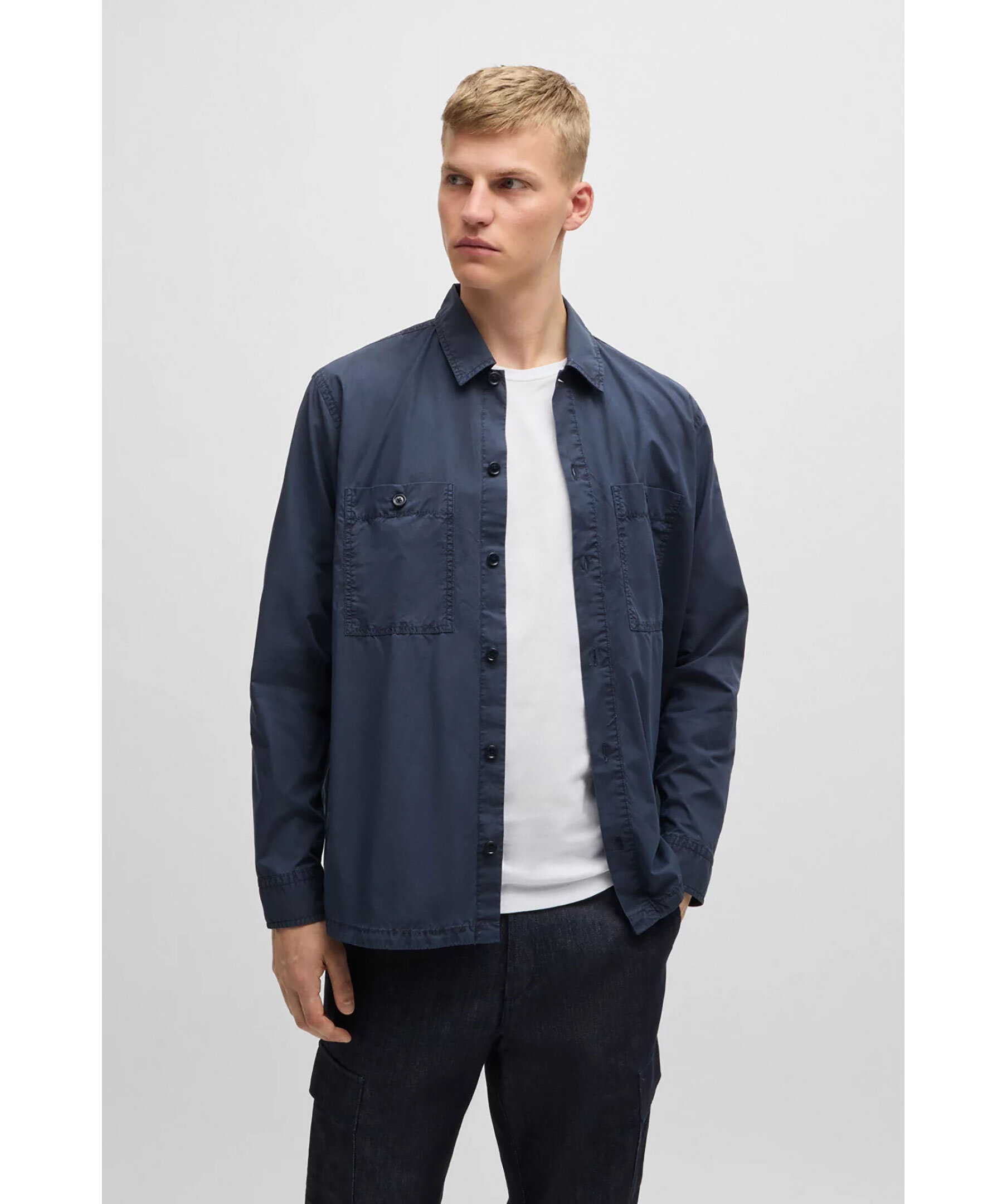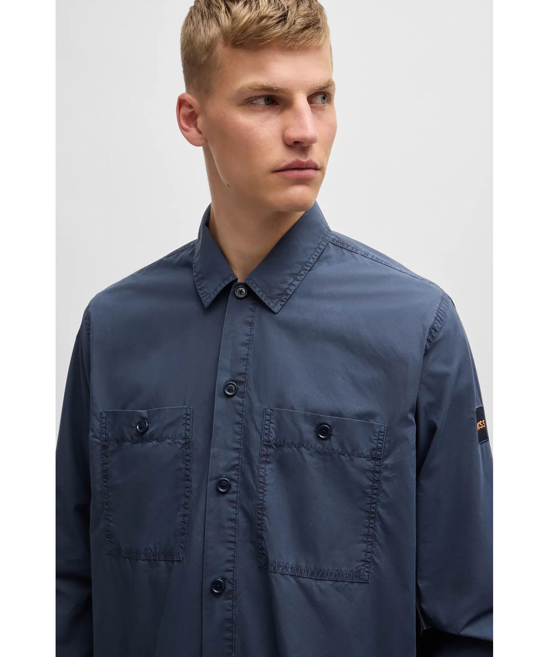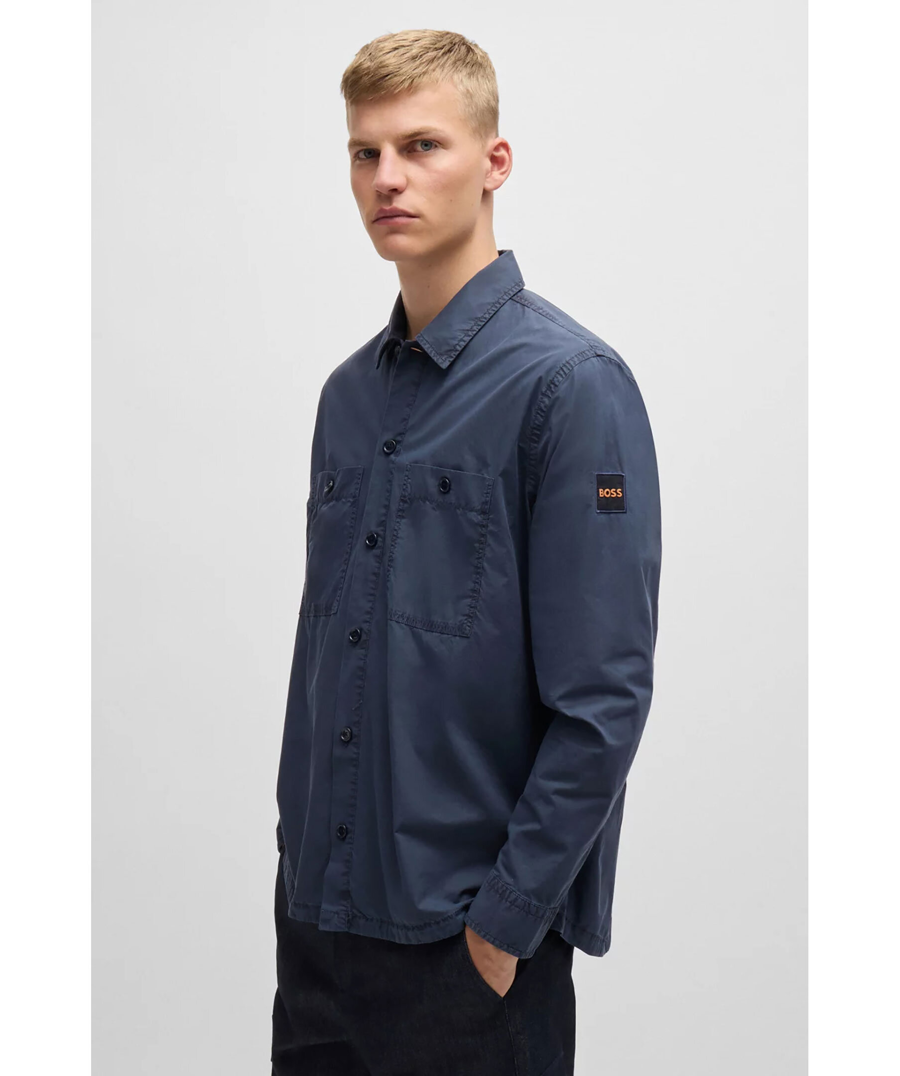 Blå overshirt från BOSS Orange. Overshirten stängs med knappar framtill och har två bröstfickor med knapp samt en logotyp-patch på vänster ärm. Tillverkad i bomull.