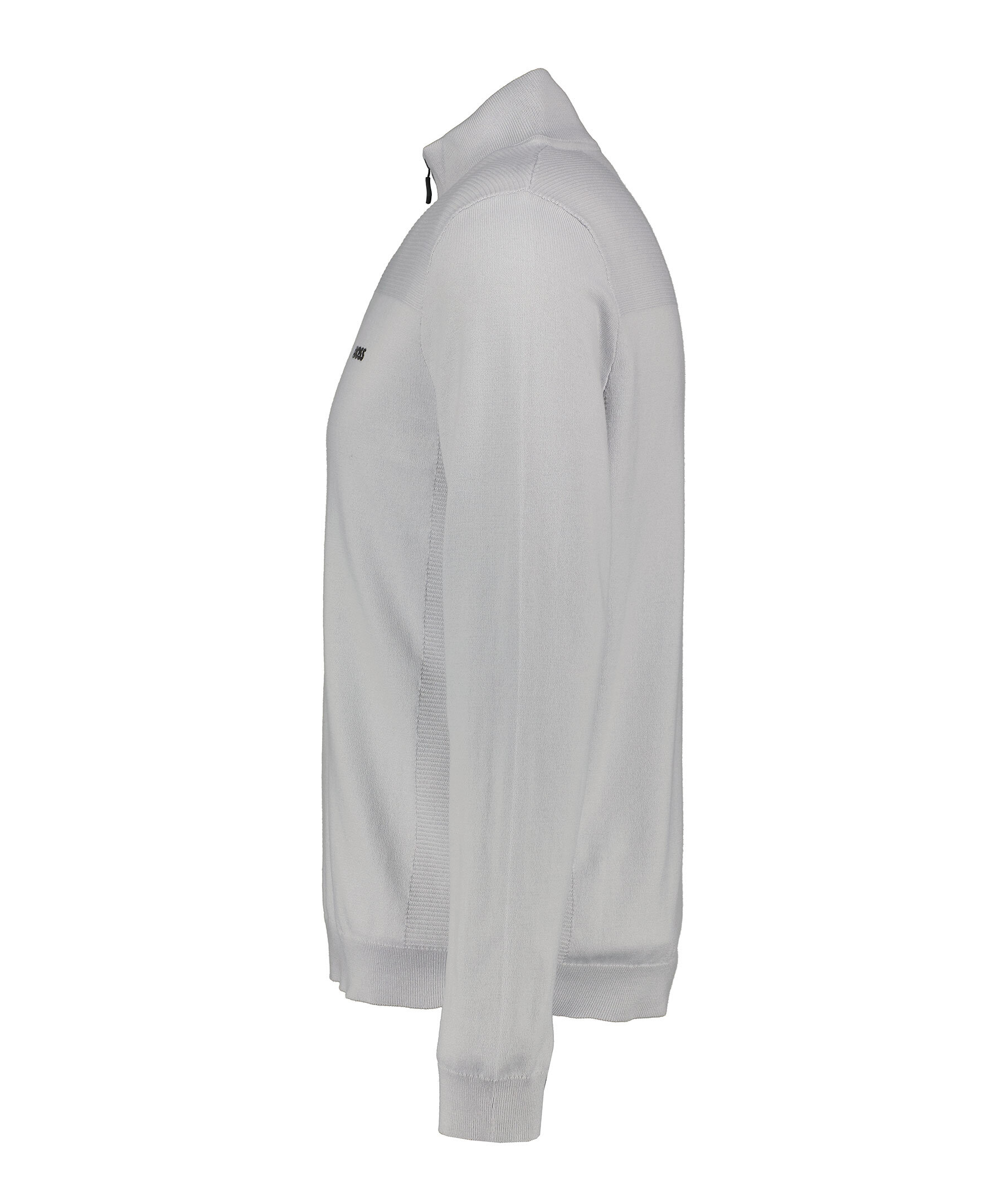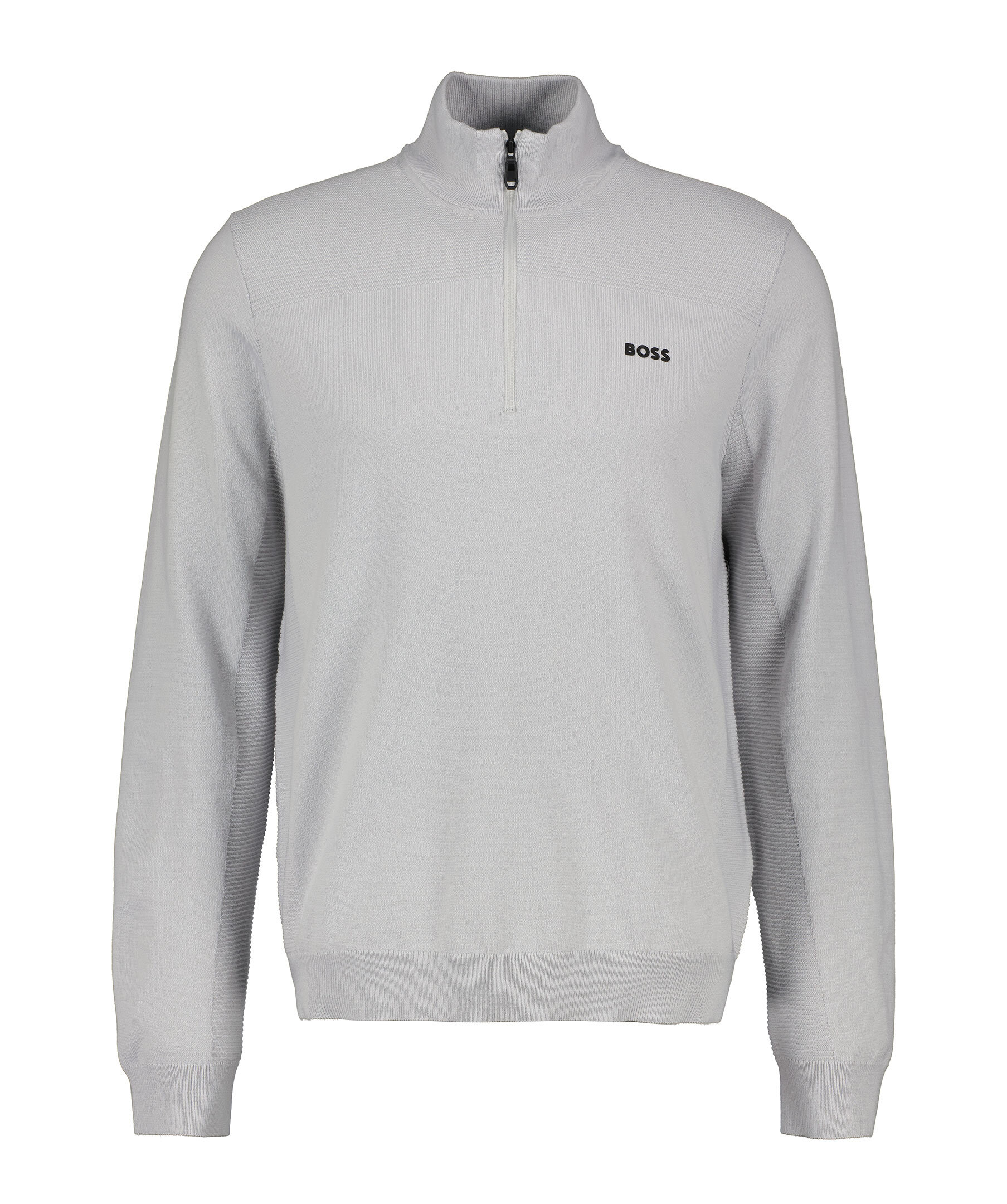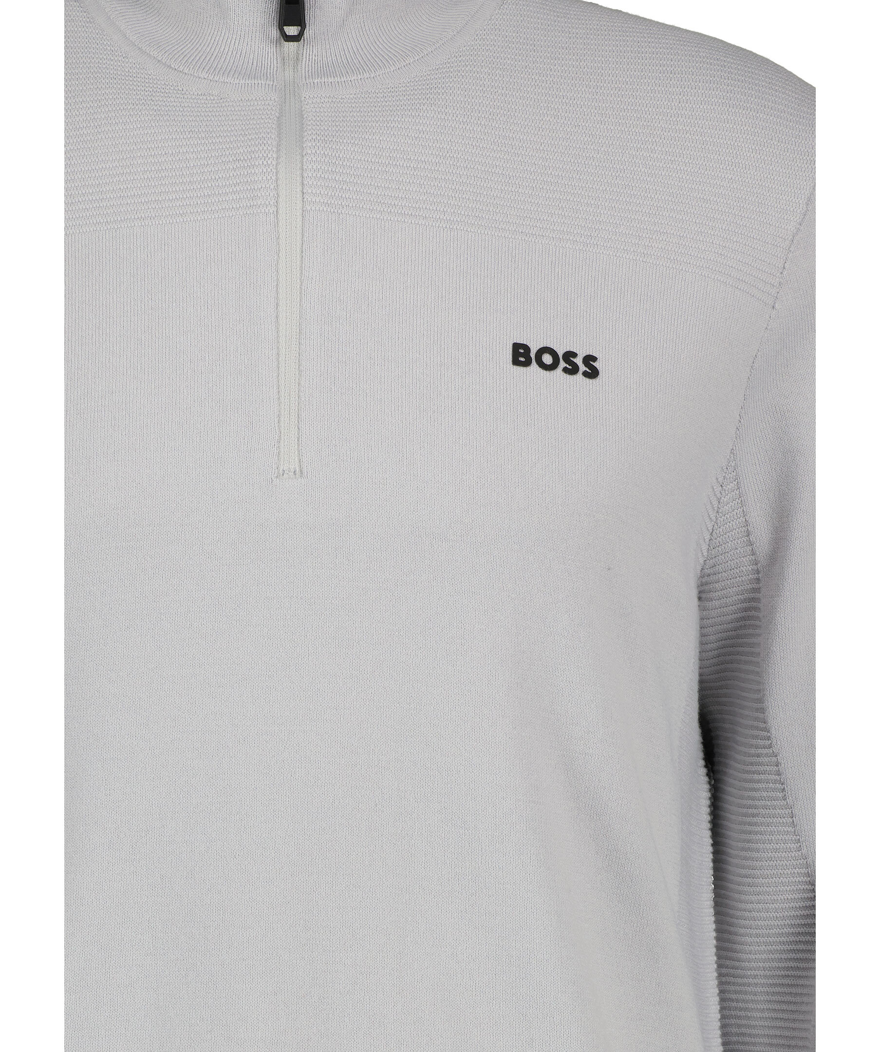 Grå finstickad tröja från BOSS Green. Tröjan är regular fit med half-zip och liten logotyp på bröstet. Tillverkad av termo- och fuktreglerande material som har blandats med ull.