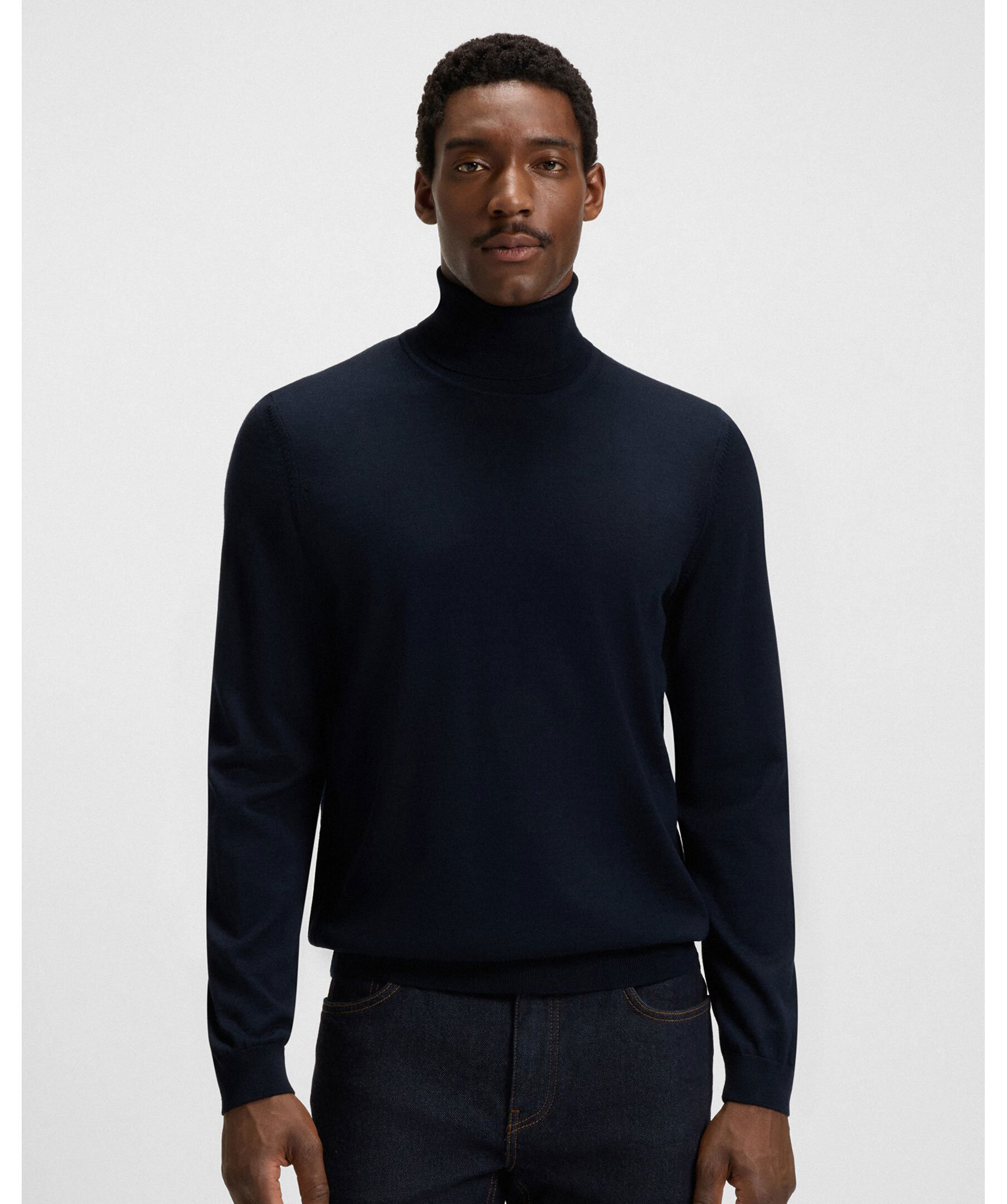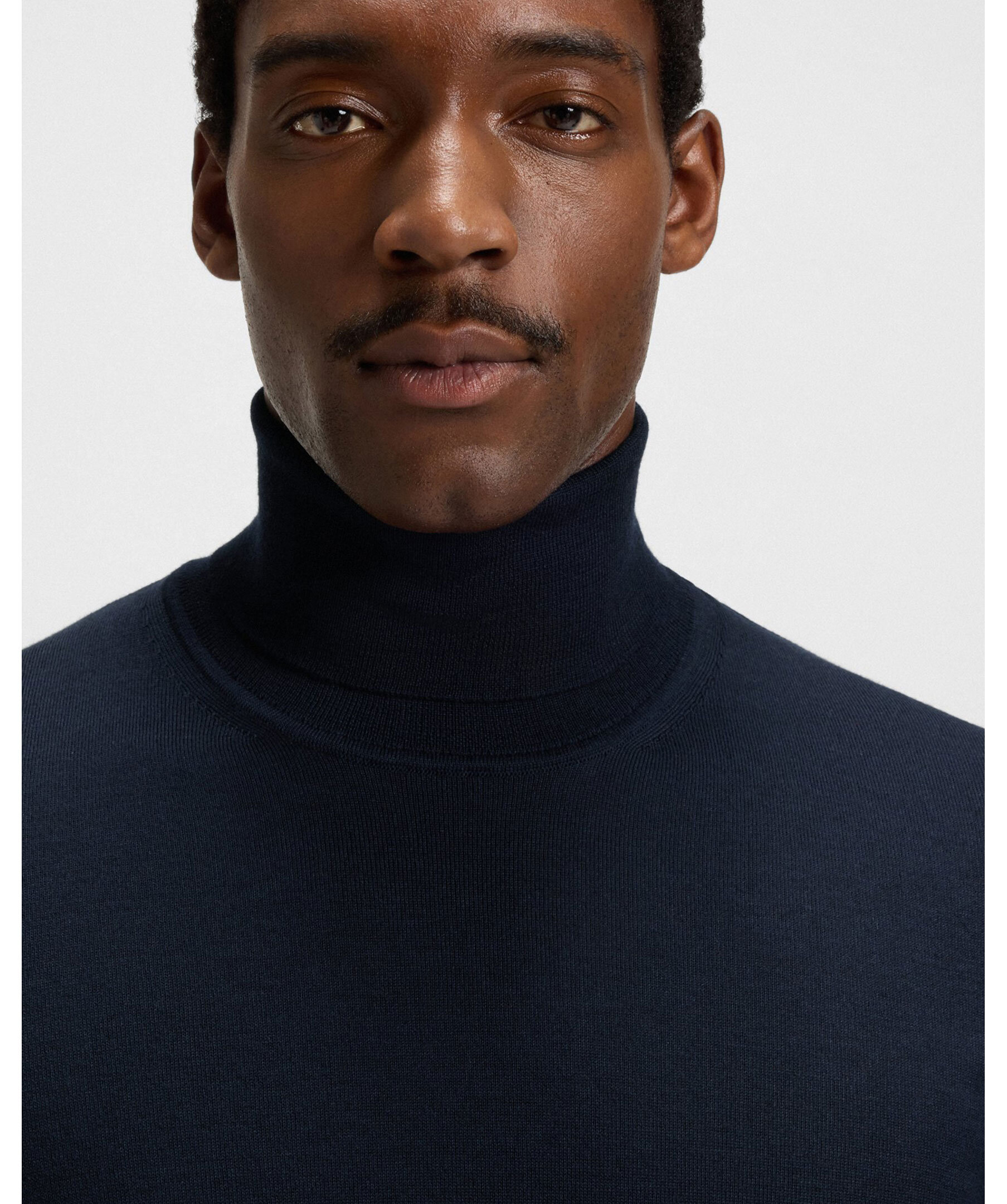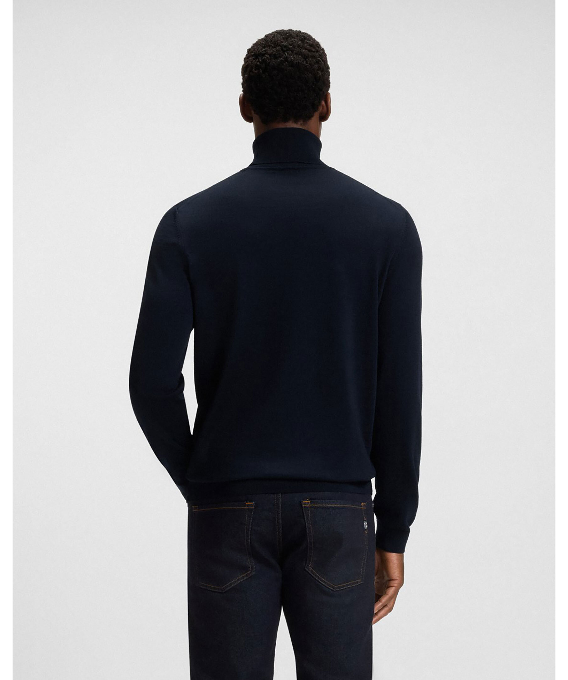 Mörkblå finstickad polotröja i mjuk ull från BOSS Black. Tröjan har extra långa ärmar.