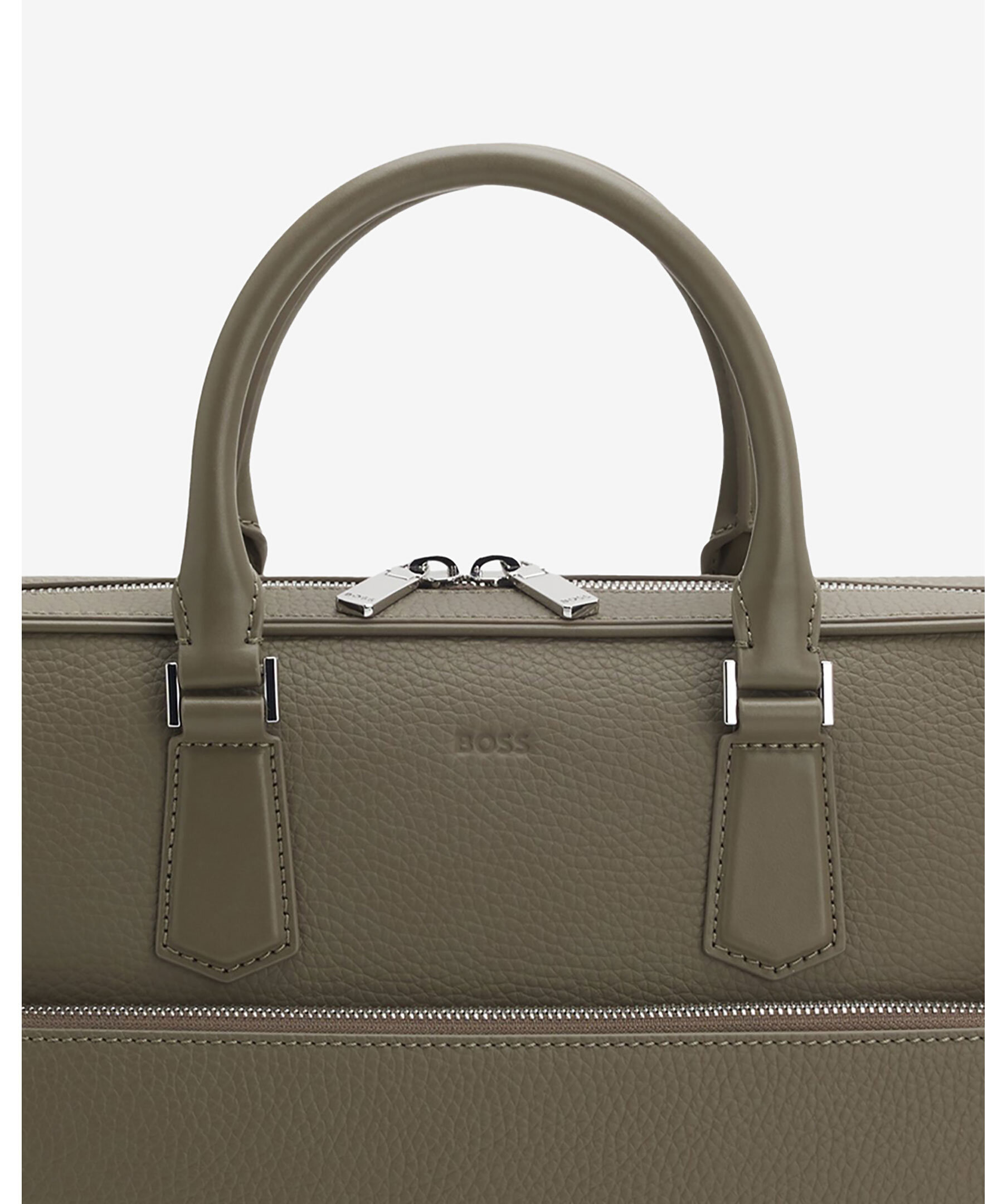 Portfölj eller laptop-väska från BOSS är tillverkad av högkvalitativt, strukturerat italienskt läder, vilket ger en sofistikerad och professionell look. Portföljen har en präglad BOSS-logga på framsidan, vilket tillför en diskret men elegant detalj. Den är designad för att rymma A4-dokument och har en praktisk dragkedjeförslutning för säker förvaring. Perfekt för affärsmöten eller som en stilren accessoar till din arbetsgarderob.