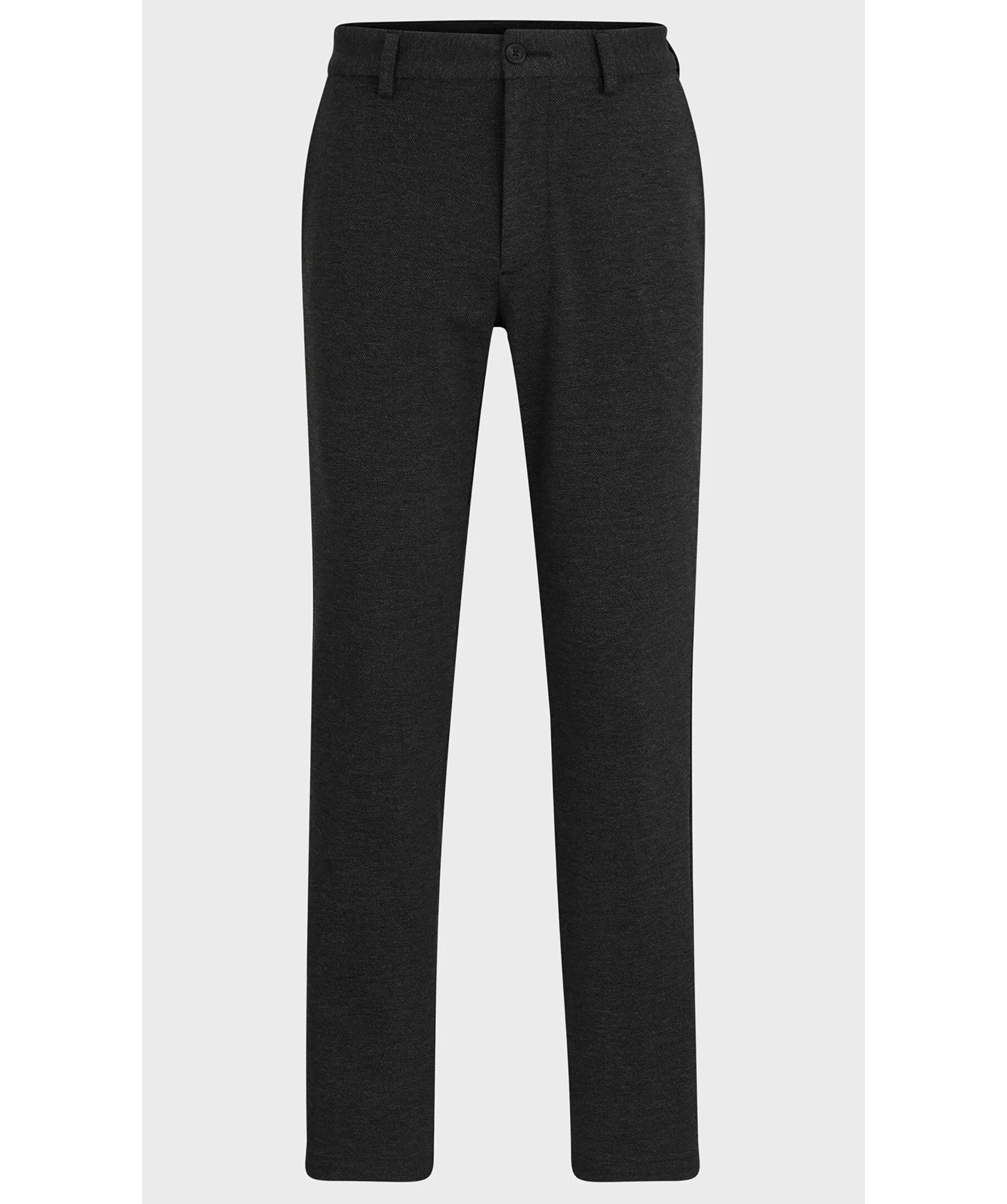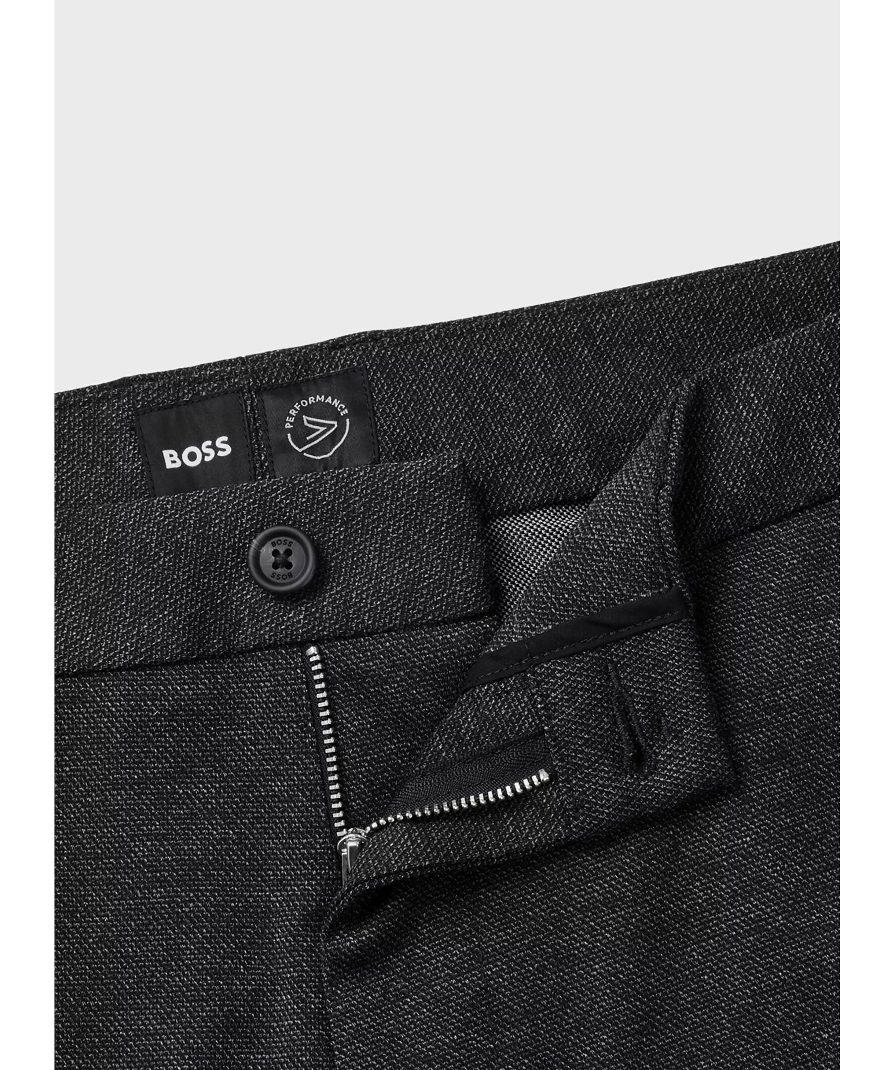 Grå och svar melerade byxor från BOSS Black. Hällor midjan. Gylf med knapp och dragkedja. Två fickor framtill, trebakfickor. Gummerad patch med logotyp vid höger bakficka. Tillverkade i Viskos och polyester blandning.