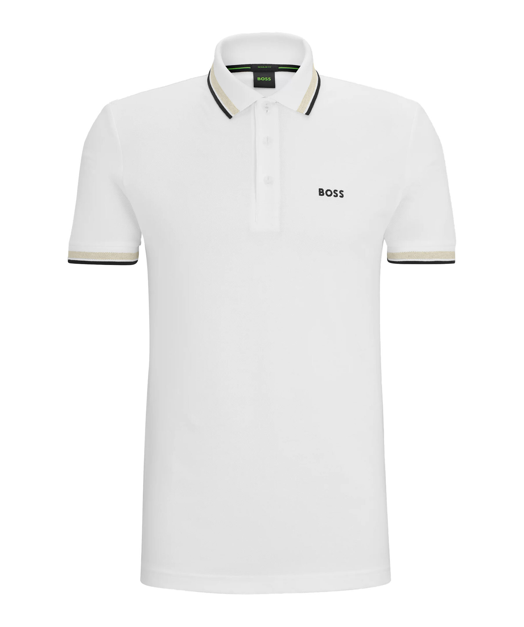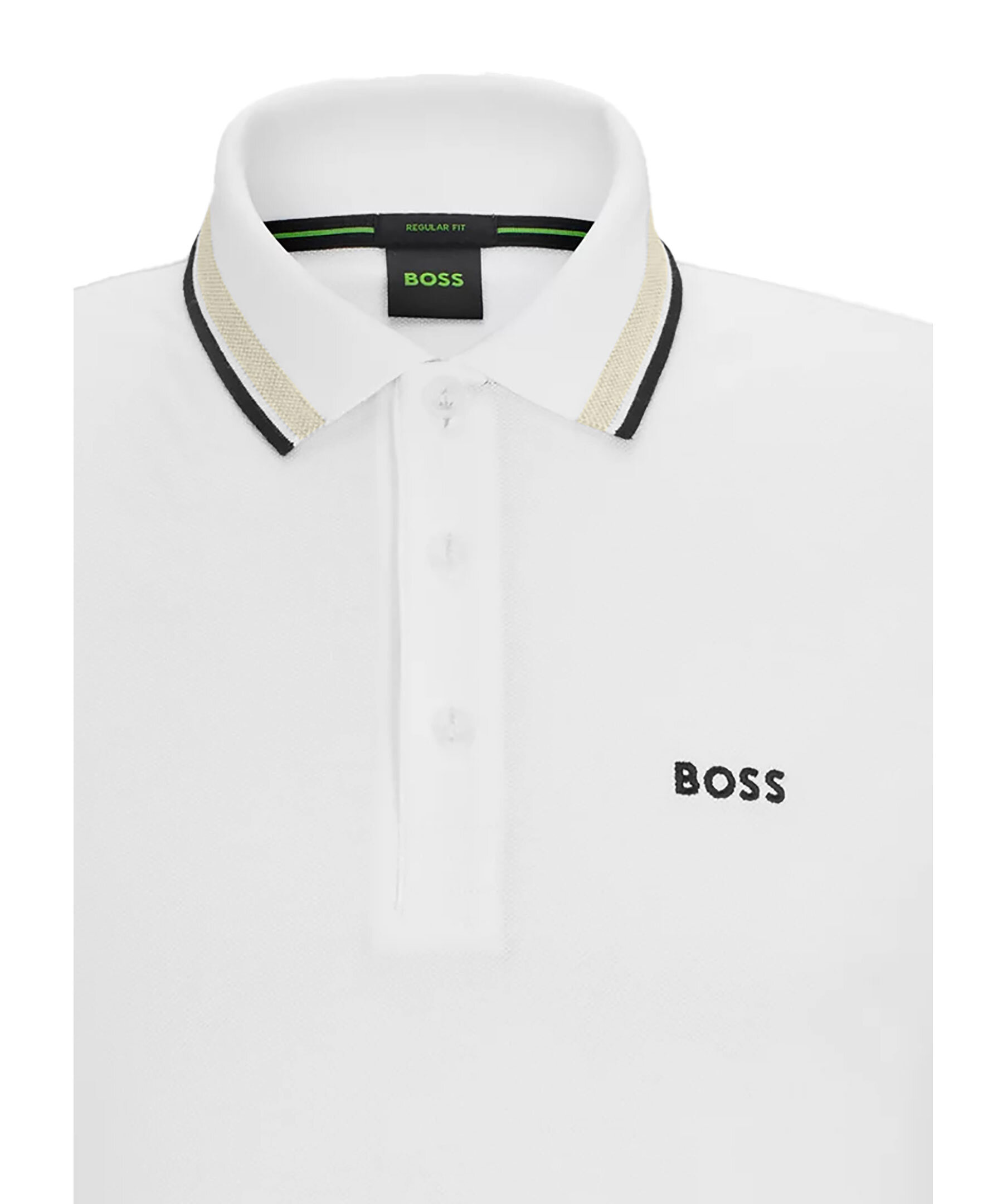 Vit, kortärmad pikétröja från BOSS Green. Pikén har tre knappar framtill, sportiga ränder vid kragen och ärmslut. Logotypdetaljer på undersidan av kragen. Tillverkad i bomull.