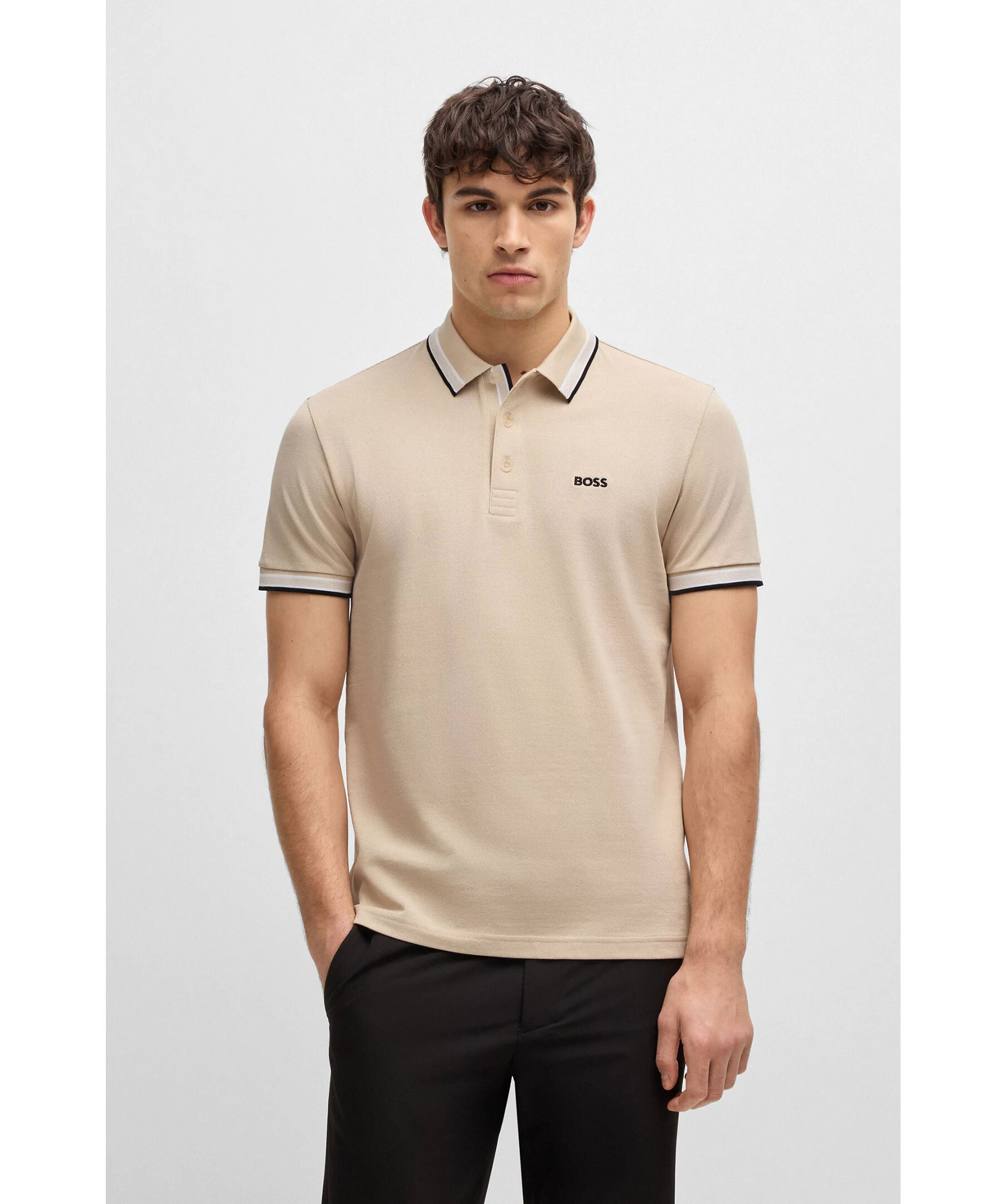 Beige, kortärmad pikétröja från BOSS Green. Pikén har tre knappar framtill, sportiga ränder vid kragen och ärmslut. Logotypdetaljer på undersidan av kragen. Tillverkad i bomull.