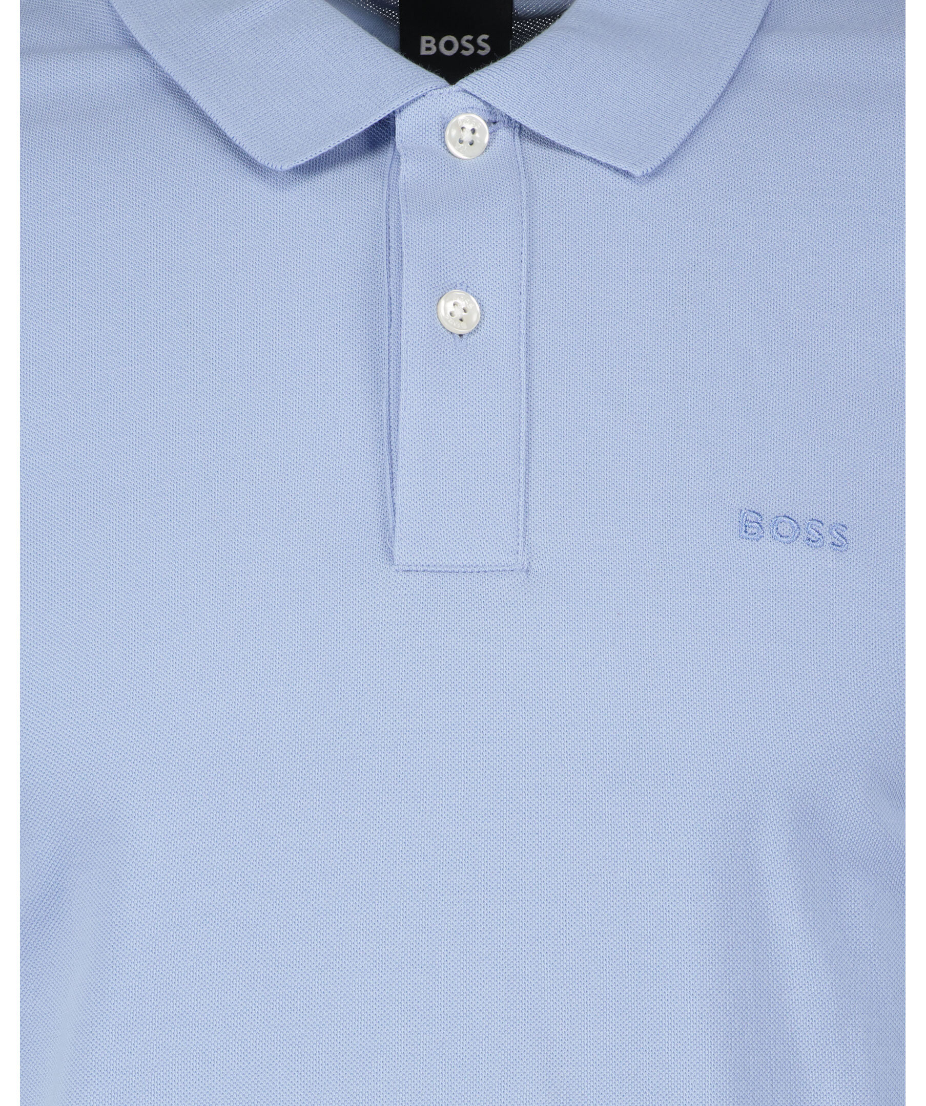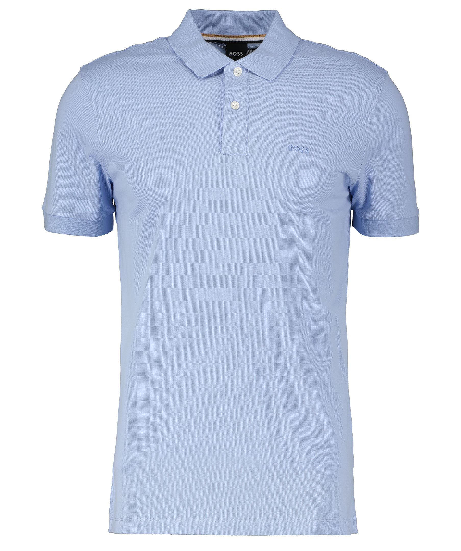 Ljusblå kortärmadpiké från BOSS BLACK gjord i 100% bomull. Knappslå med två knappar, ribbade krage och mudd vid ärmslut. Liten ton-i-ton logotyp broderad på bröstet. Små sidoslitsar.