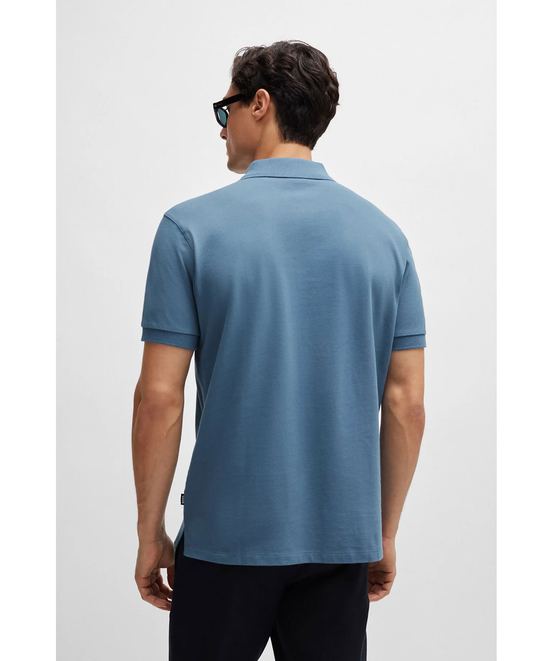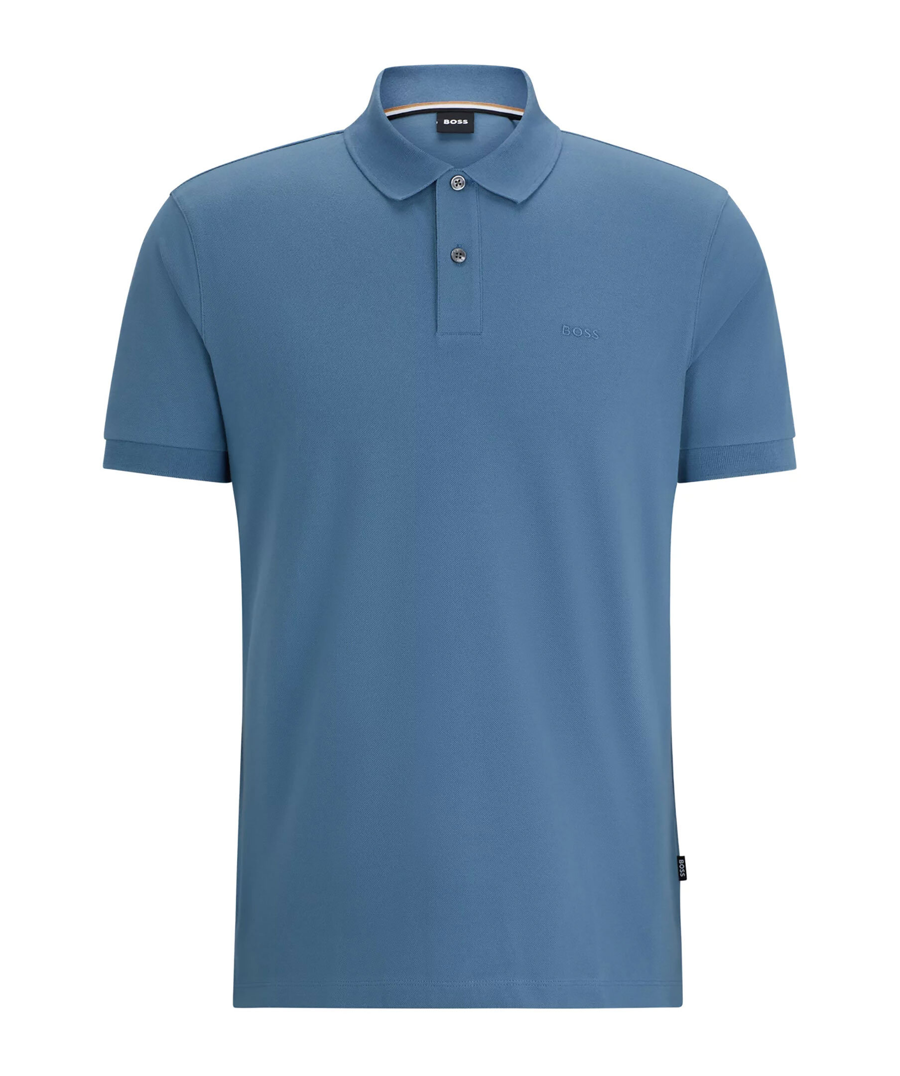 Blå pikétröja från BOSS Black. Pikén har plattstickad krage, två knappar och broderad logotyp på bröstet. Tillverkad i bomull.