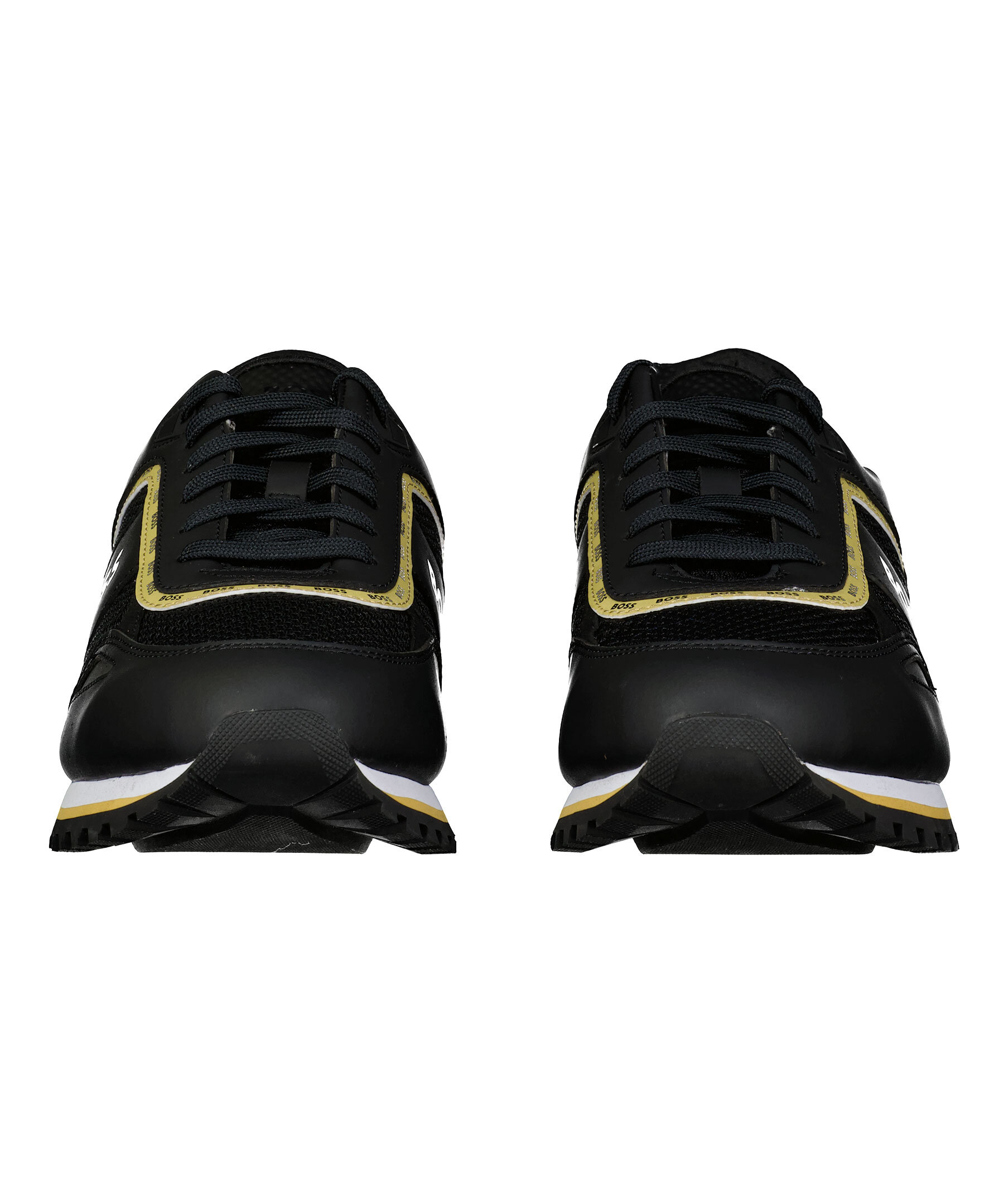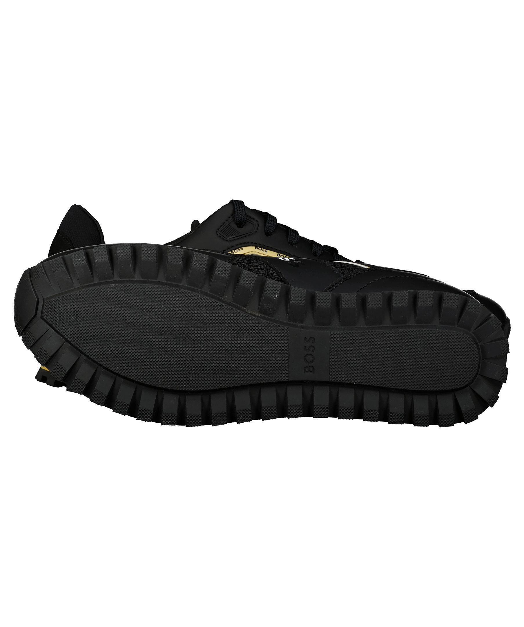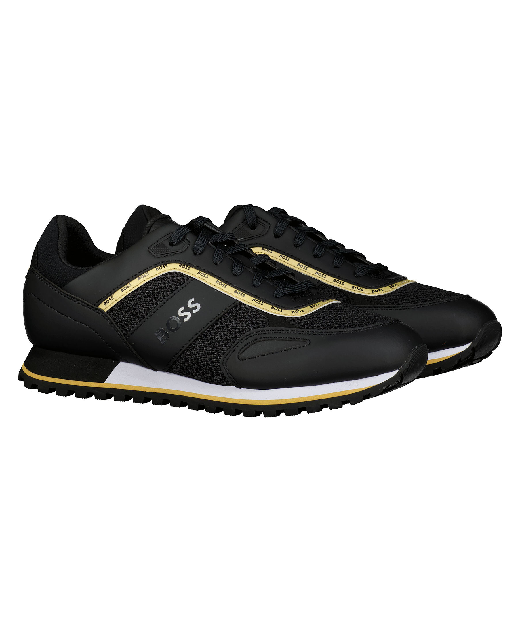 Svarta sneakers med guldfärgade detaljer från BOSS Black. Lätt sula i svart och vitt med gul detalj. Svart snörning, guldfärgade detaljer på hälen och på sidorna. Logotyp på häl, på flärpen och på utsidan av skon.