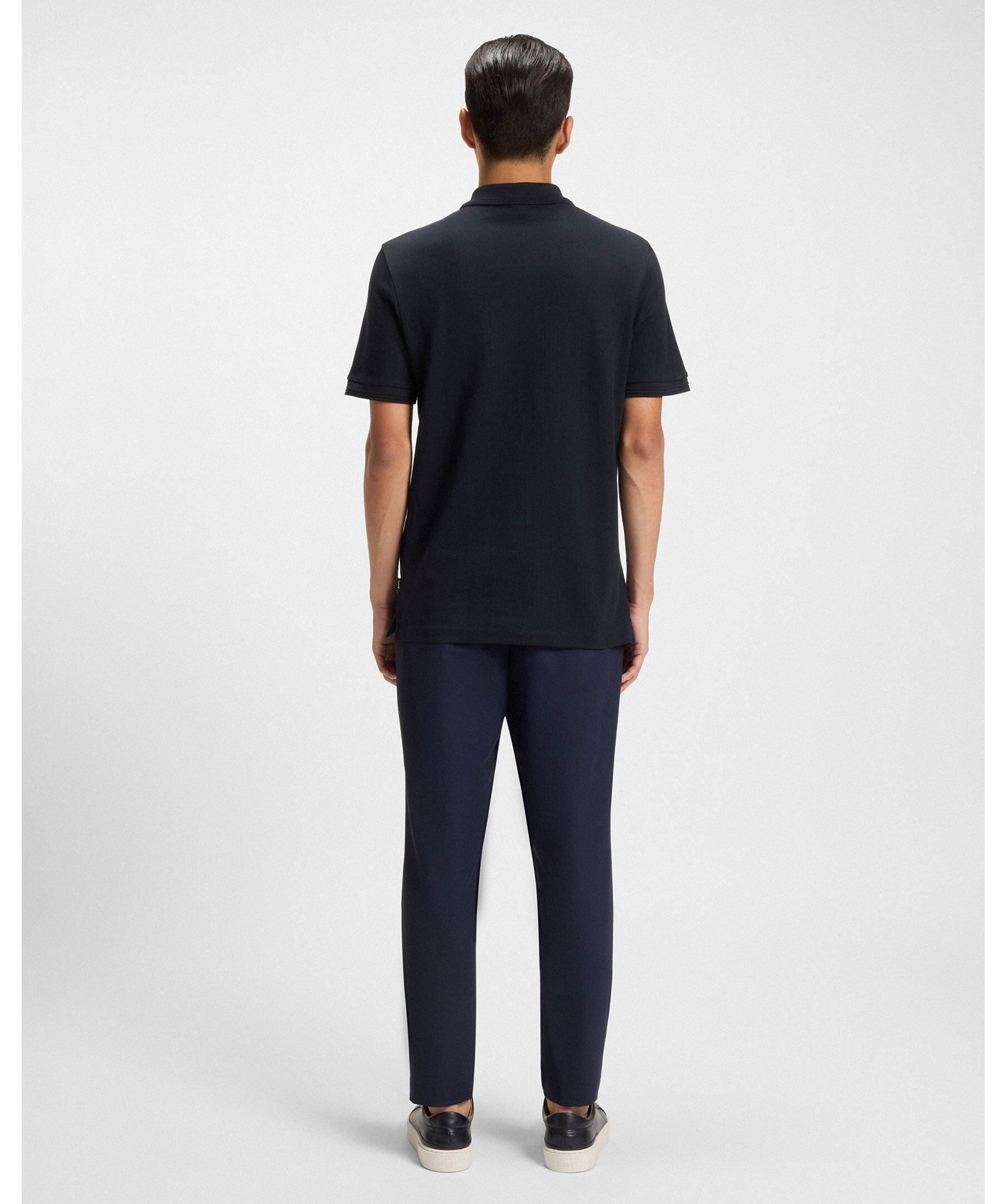 Mörkblå piké från Boss Black. Två knappar vid kragen och är tillverkad av 100% bomull.