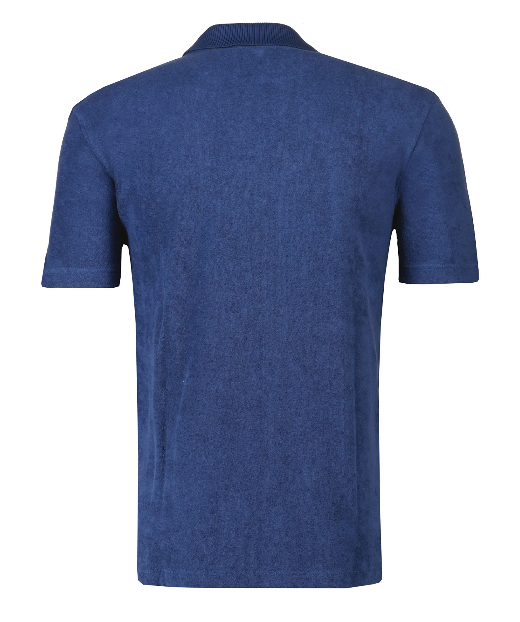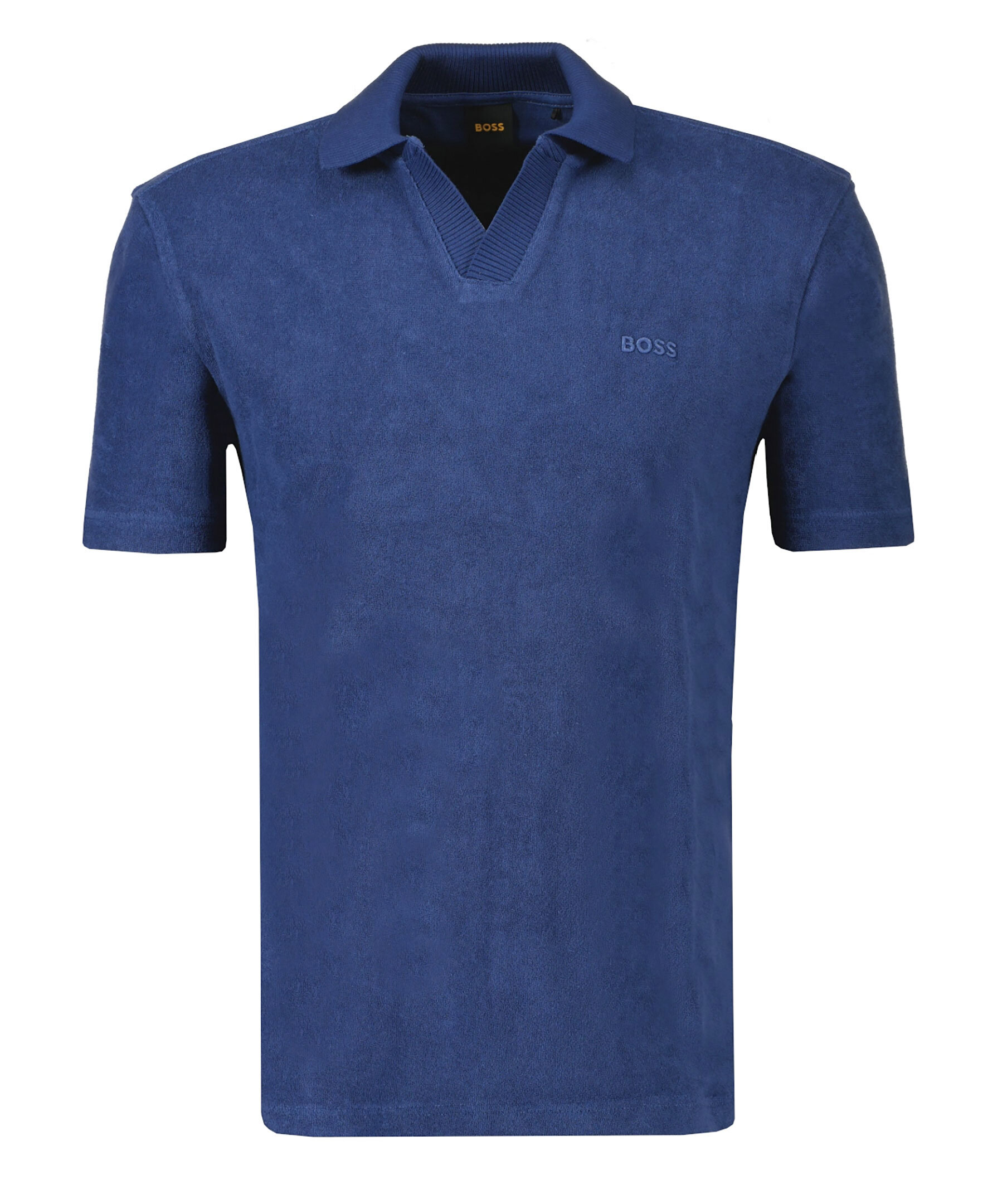 Mörkblå, kortärmad pikétröja i ett frottétyg från BOSS Orange. Pikén har ribbstickad krage och broderad logotyp på bröstet. Tillverkad i bomull.