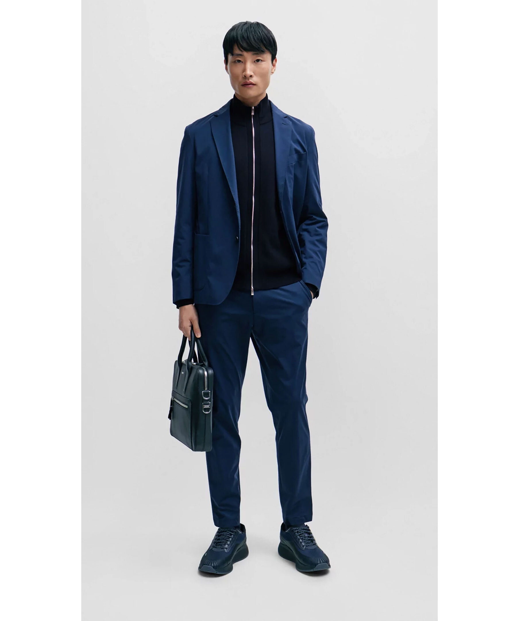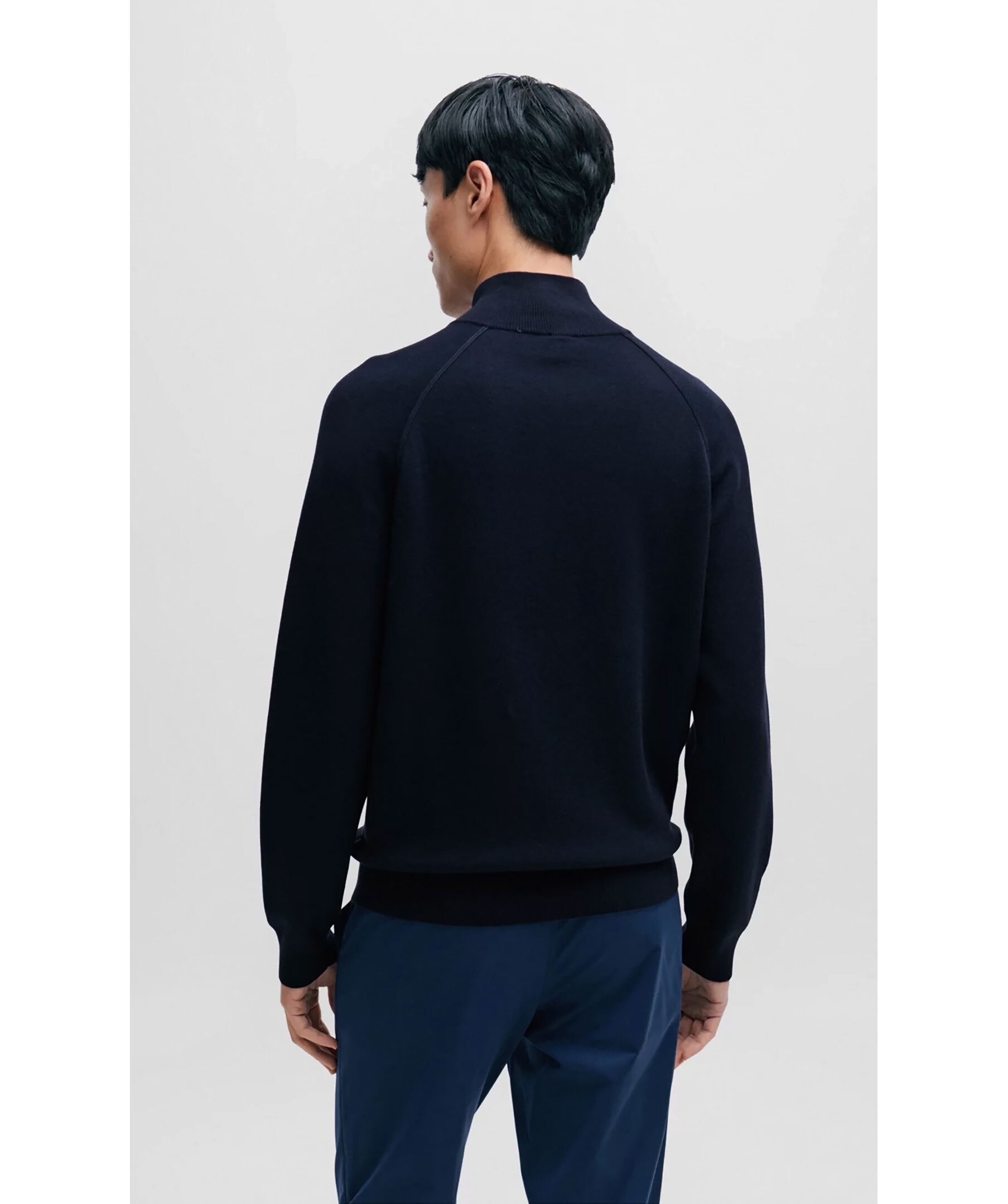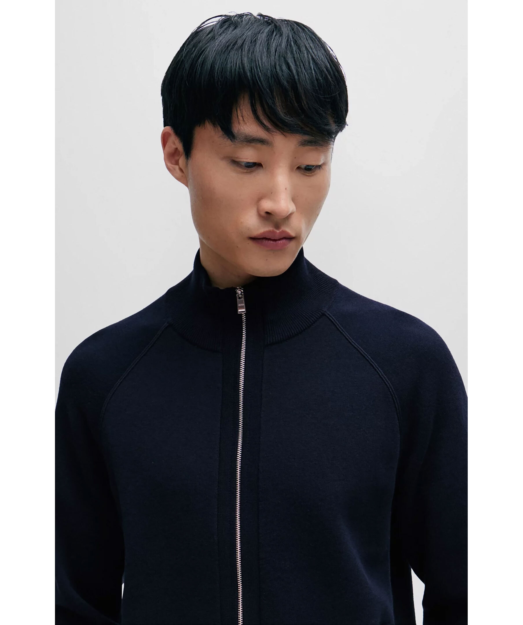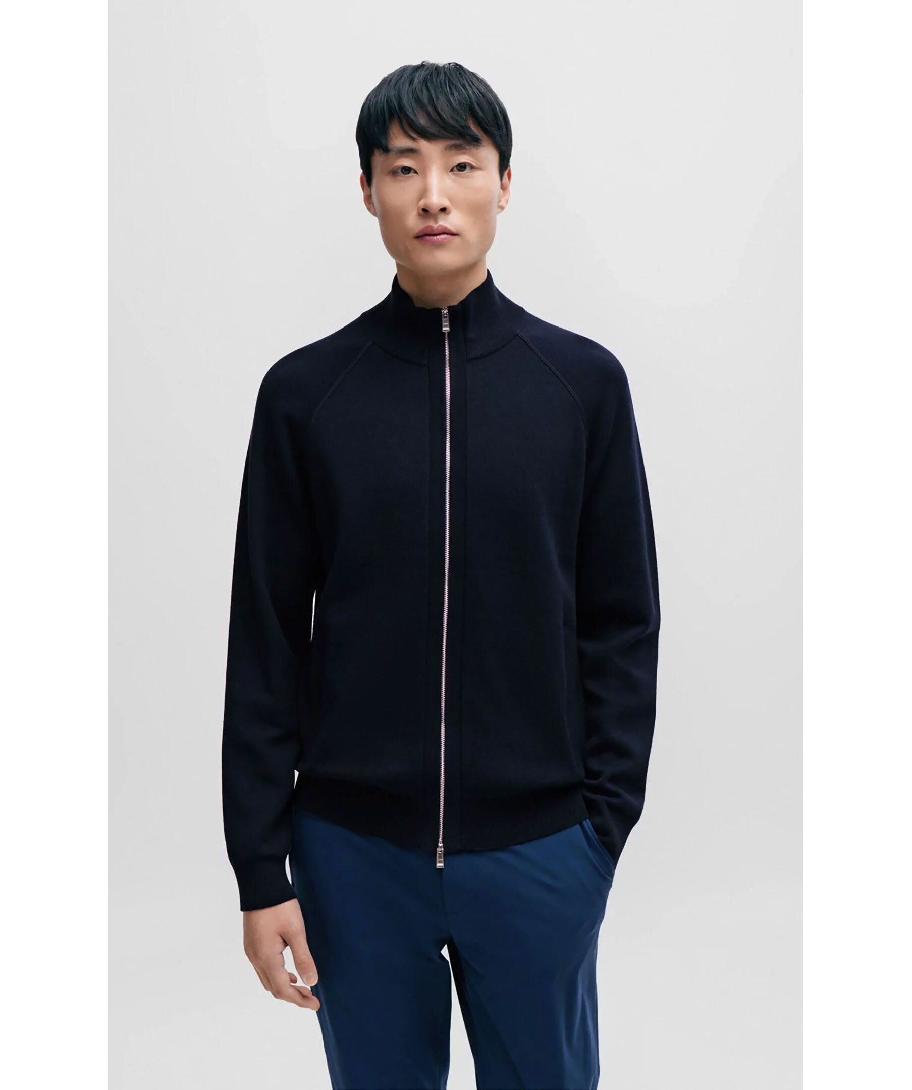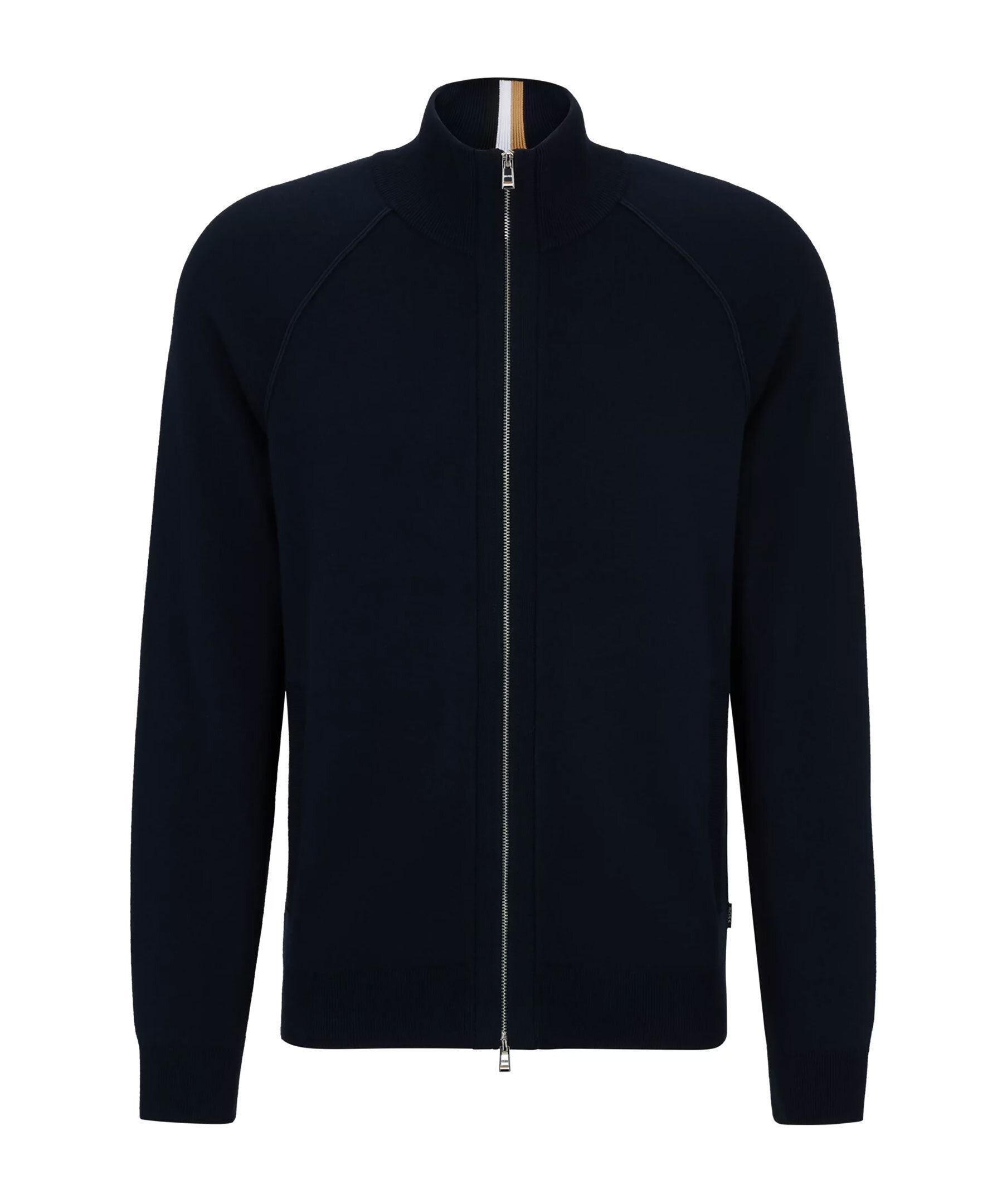 Mörkblå finstickad cardigan från BOSS Black. Stängs framtill med tvåvägsdragkedja. Ribbstickad krage, muddar vid ärm- och plaggslut.