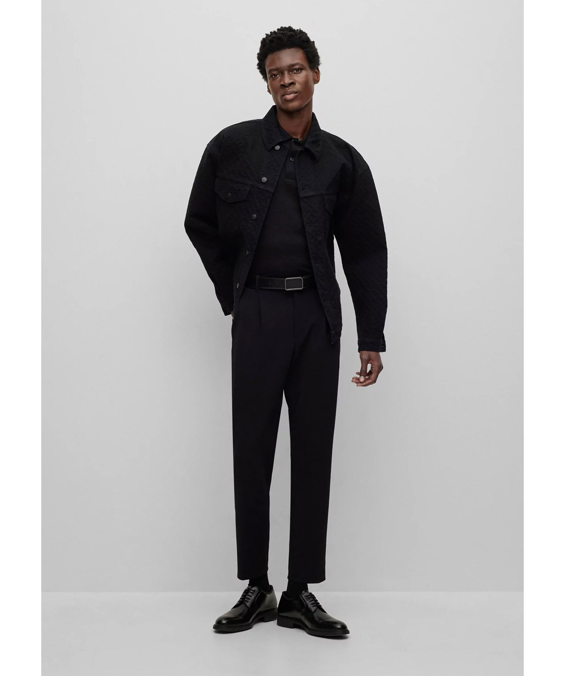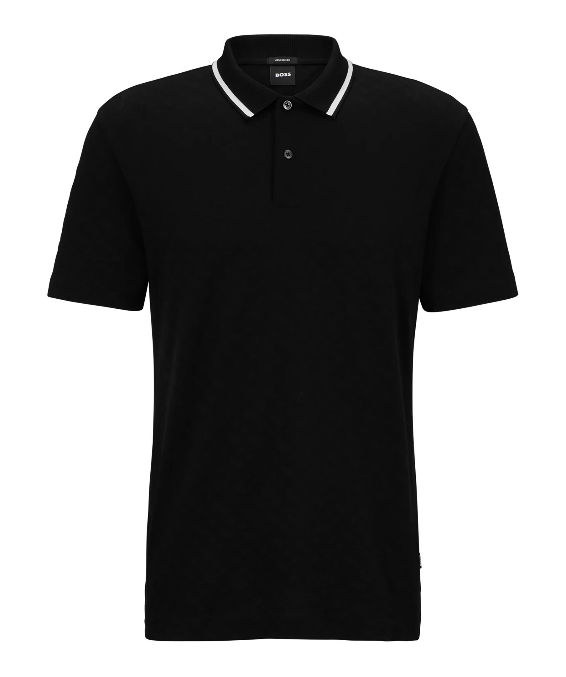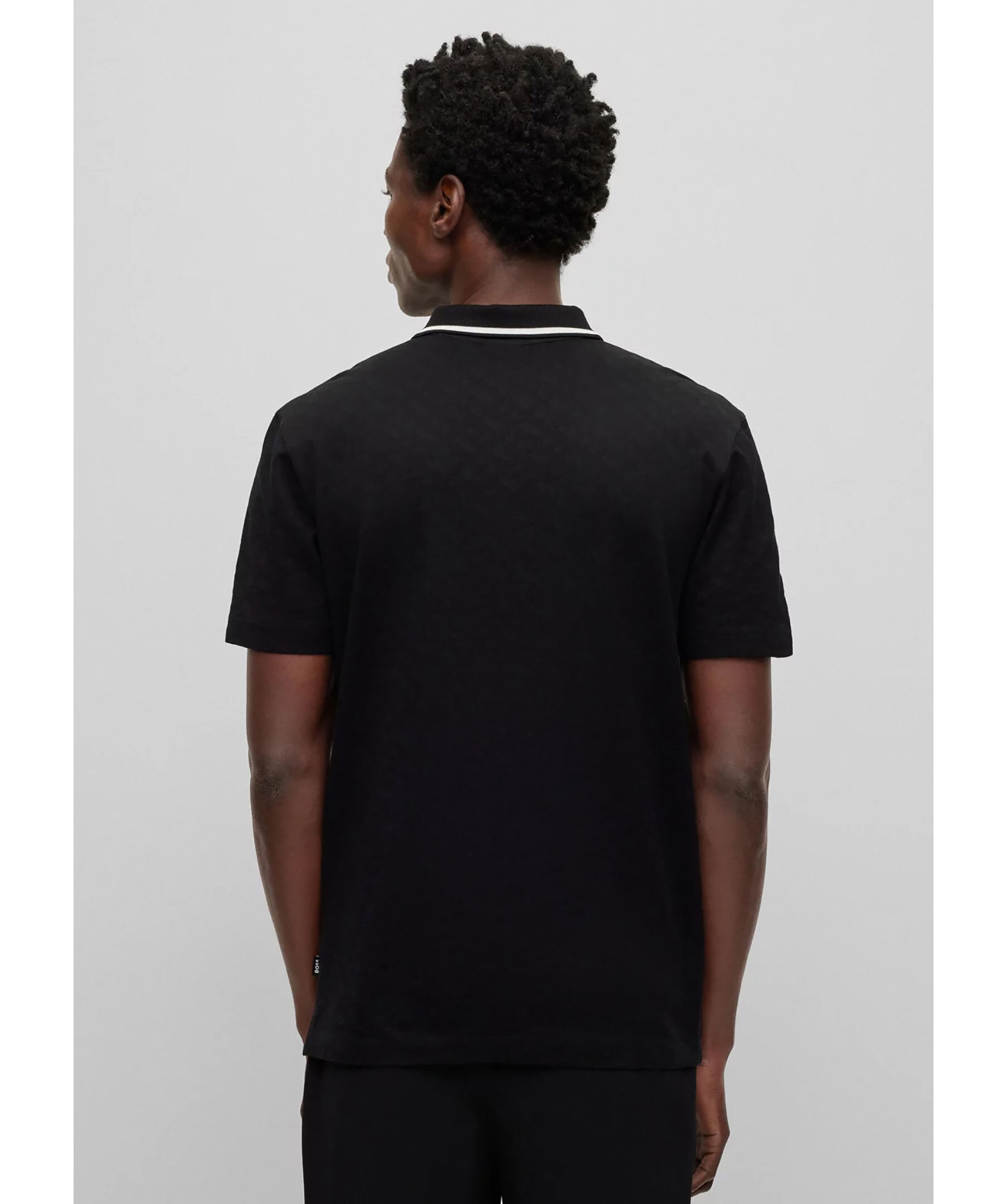 Svart modern pikétröja från BOSS Black. Den här kortärmade pikétröjan i regular fit har en casual-silhuett. Den är tillverkad av bomull med monogrammönstrad jacquard. Kragens kant har en kontrastrand. Normal passform.