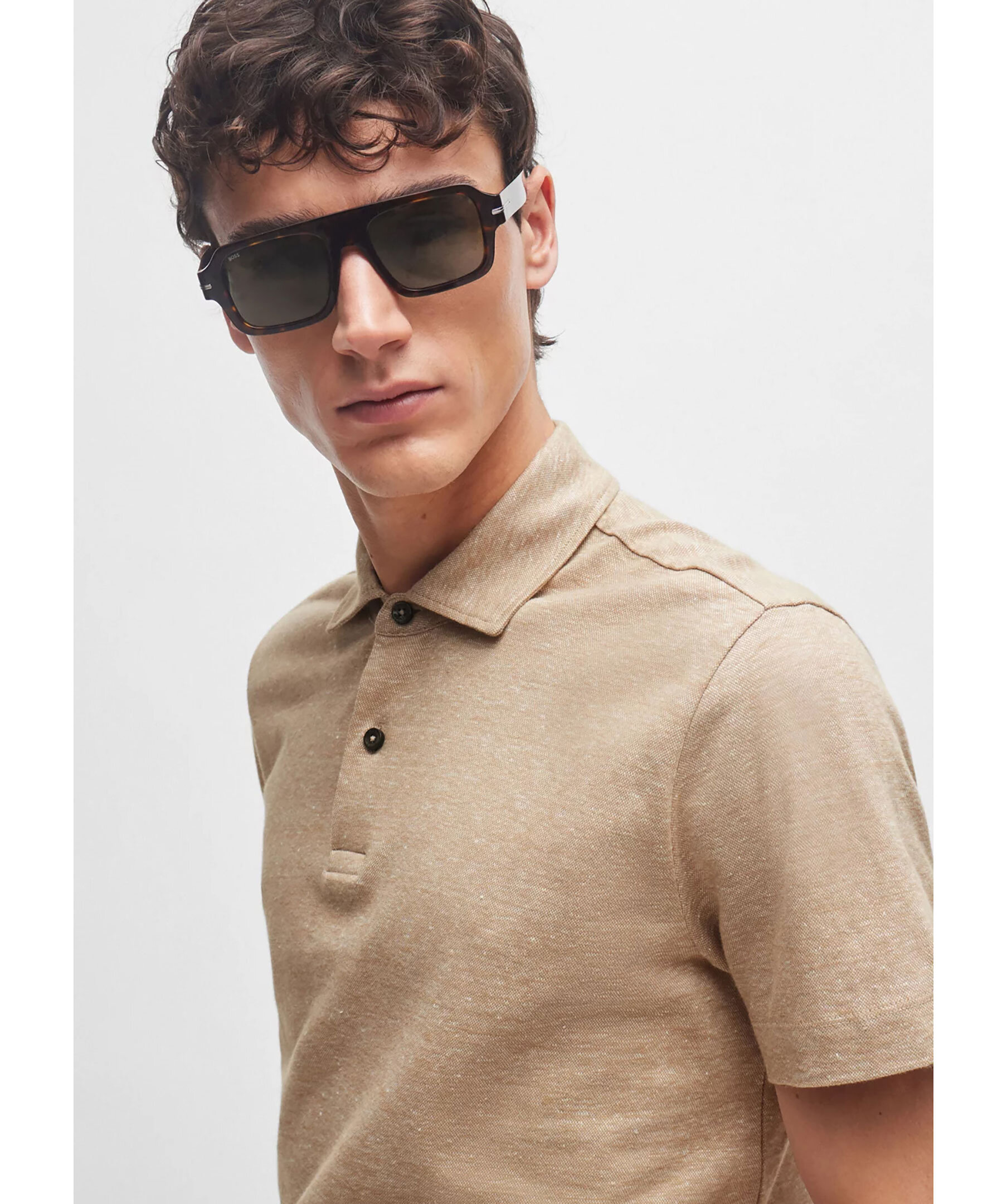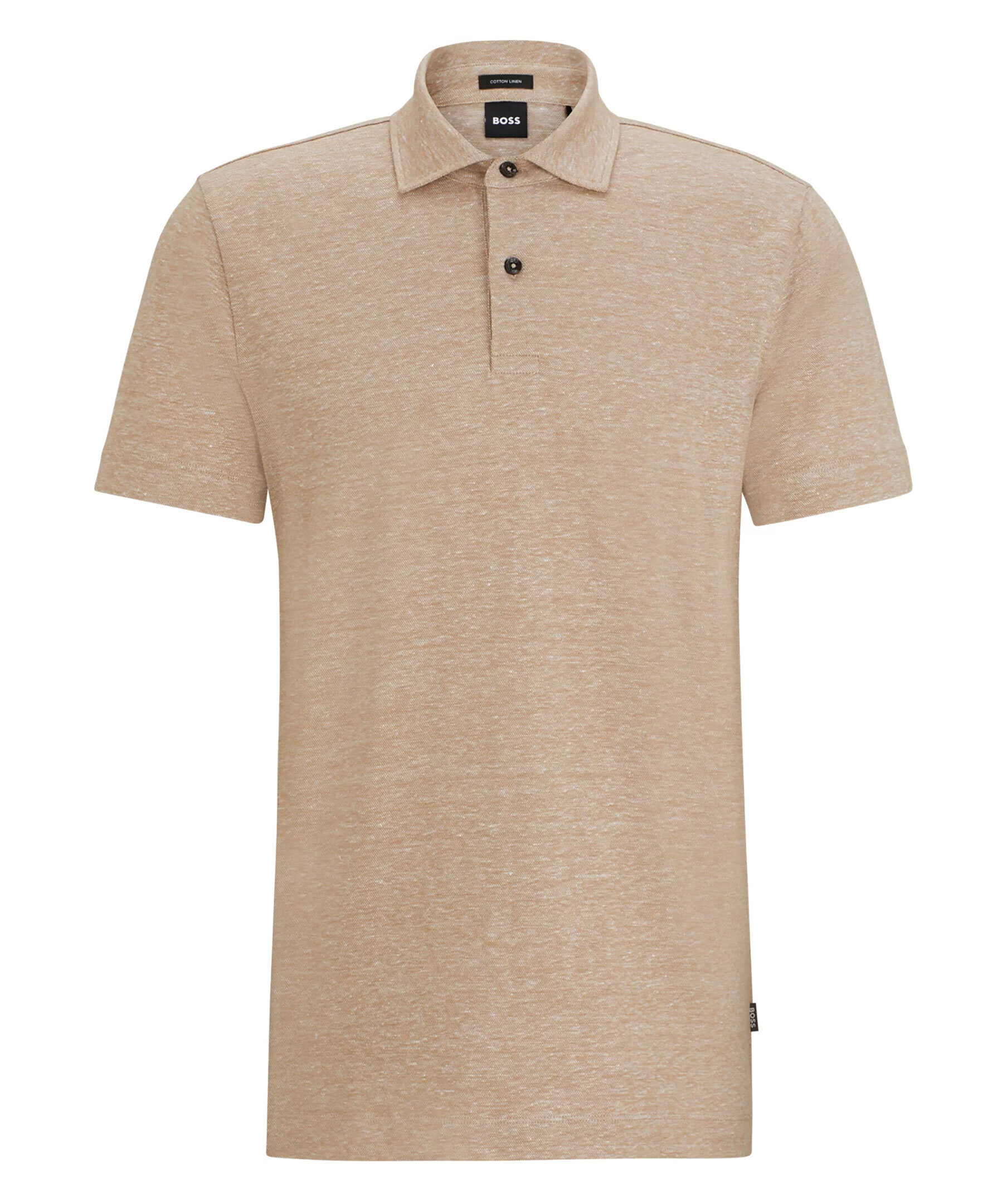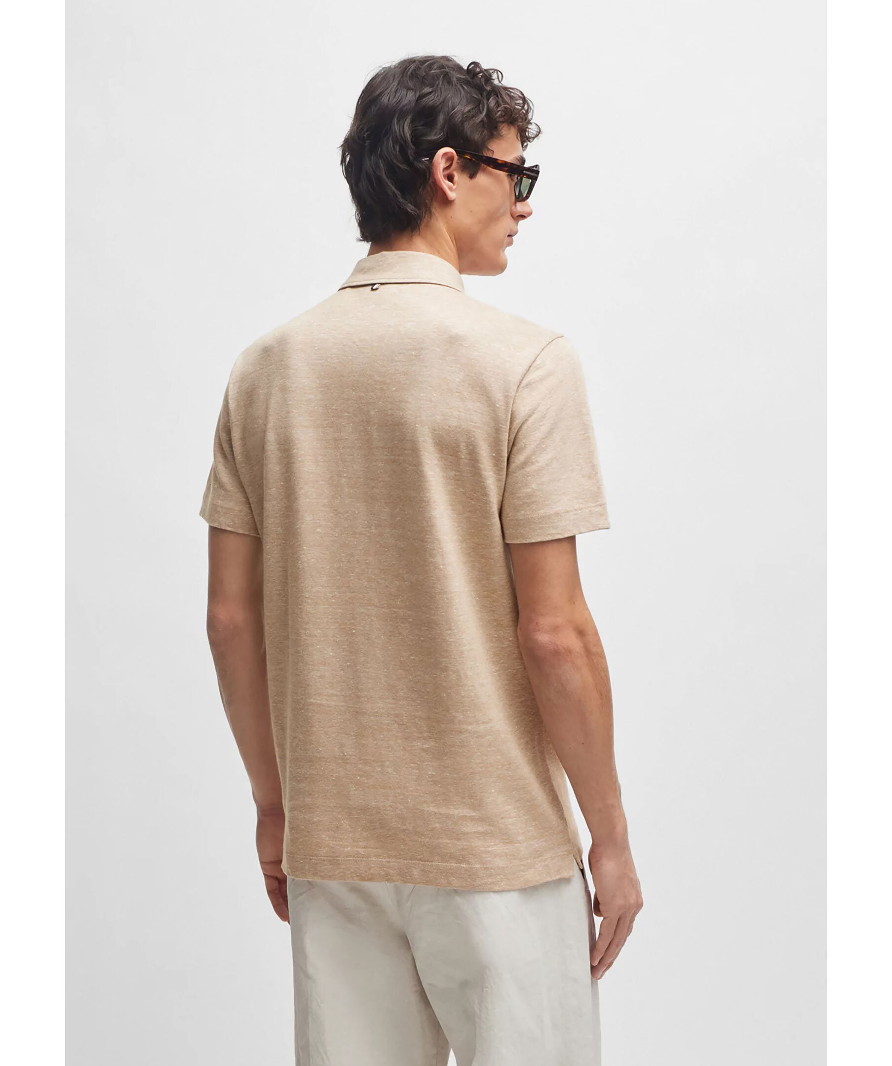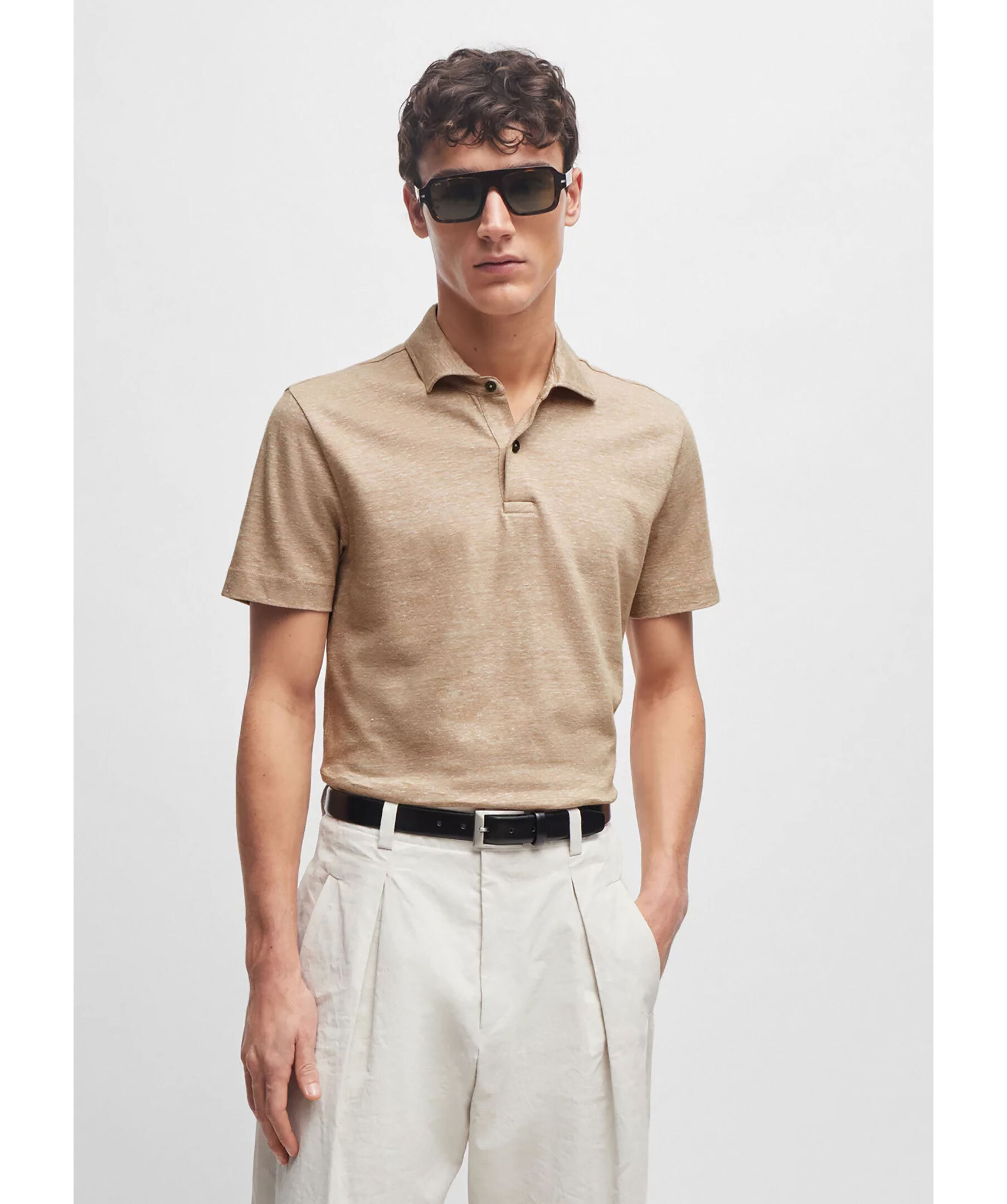 Beige-melerad pikétröja från BOSS Black. Normal passform för en casual silhuett. Två knappar framtill. Sidosömmen är försedd med en liten flagga med logga. Tillverkat av en somrig blandning av linne och bomull för ventilerande komfort.