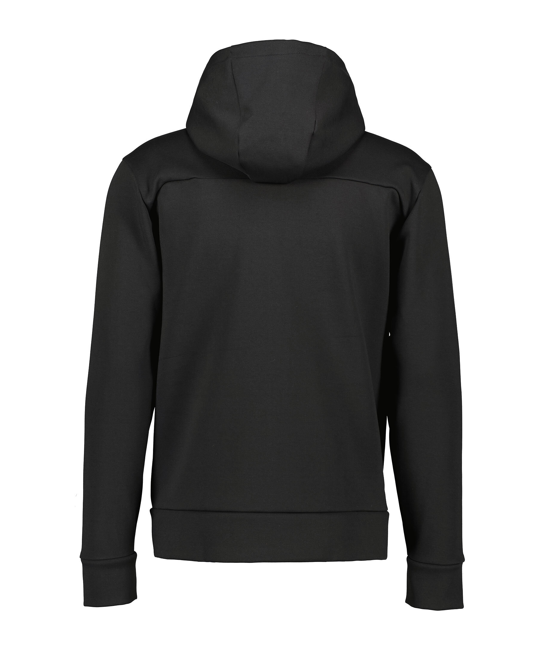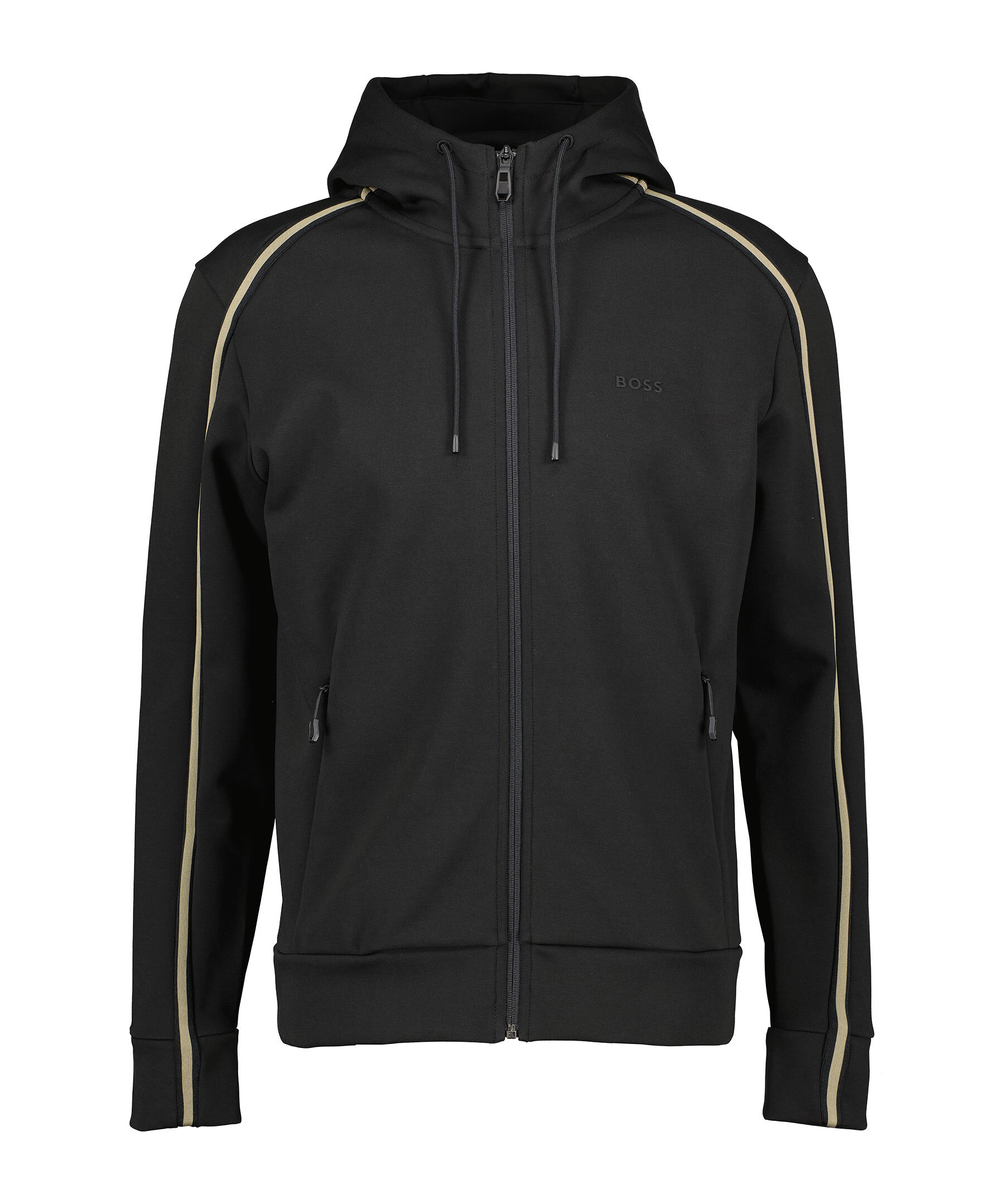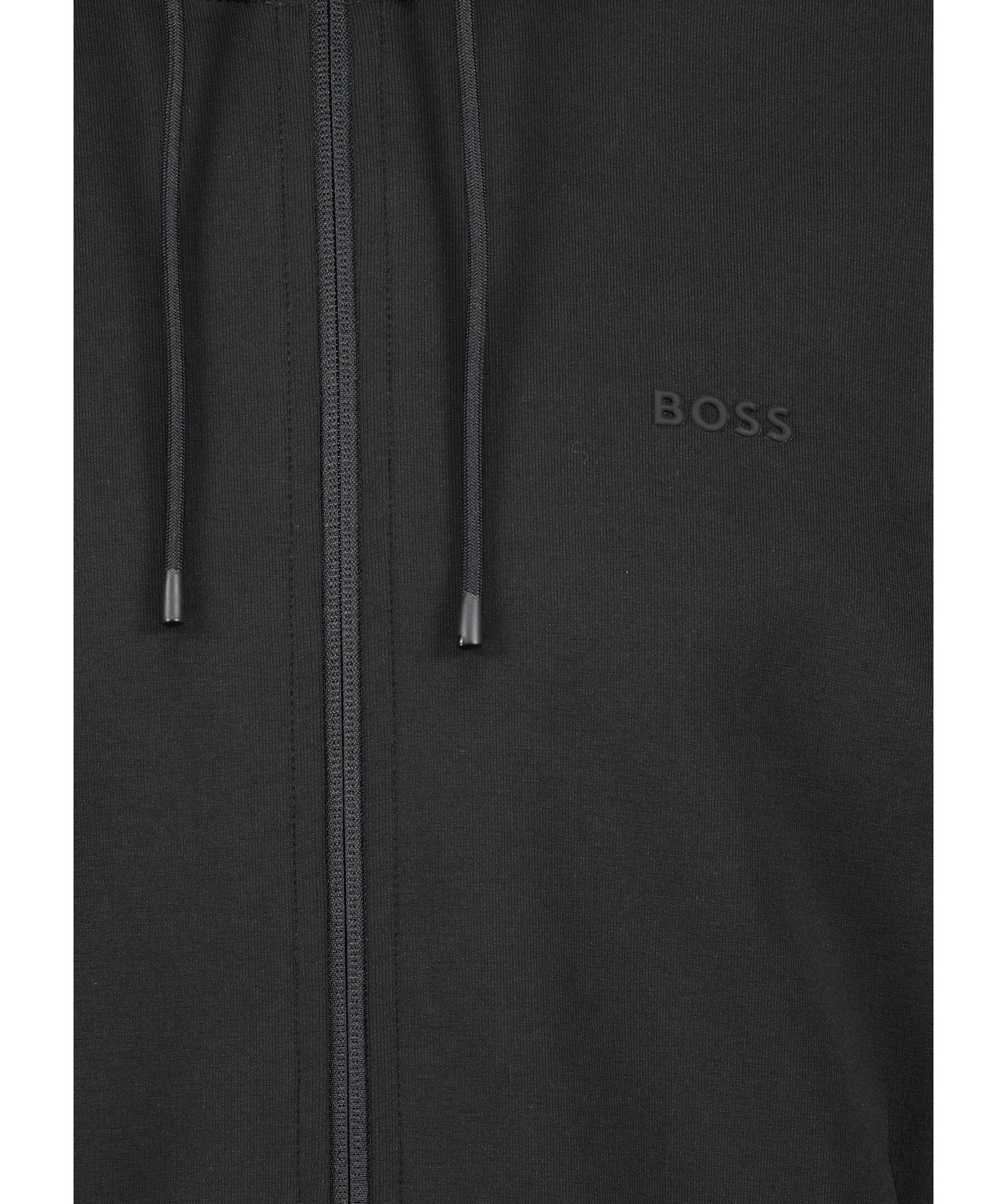 Svart zip-up hoodie från BOSS Green. Hoodien stängs med dragkedja framtill och har huva med dragsko, två sidfickor, ribbstickade muddar och kontrastsömmar längs ärmarna. Tillverkad i en bomullsblandning.