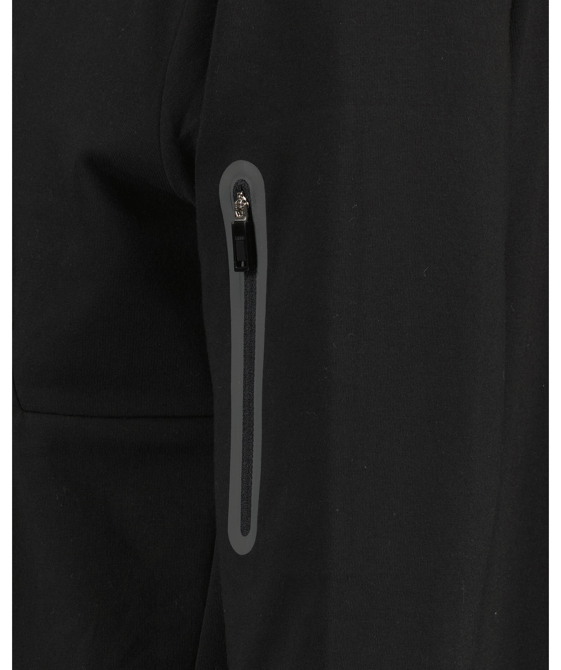 Svart sweatshirt från BOSS Green. Tillverkad i en bomullsblandning. Liten gummerad ton-i-ton logotyp på bröstet, intill en snedställd ficka med dragkedja. Vänster ärm har också ficka med dragkedja.