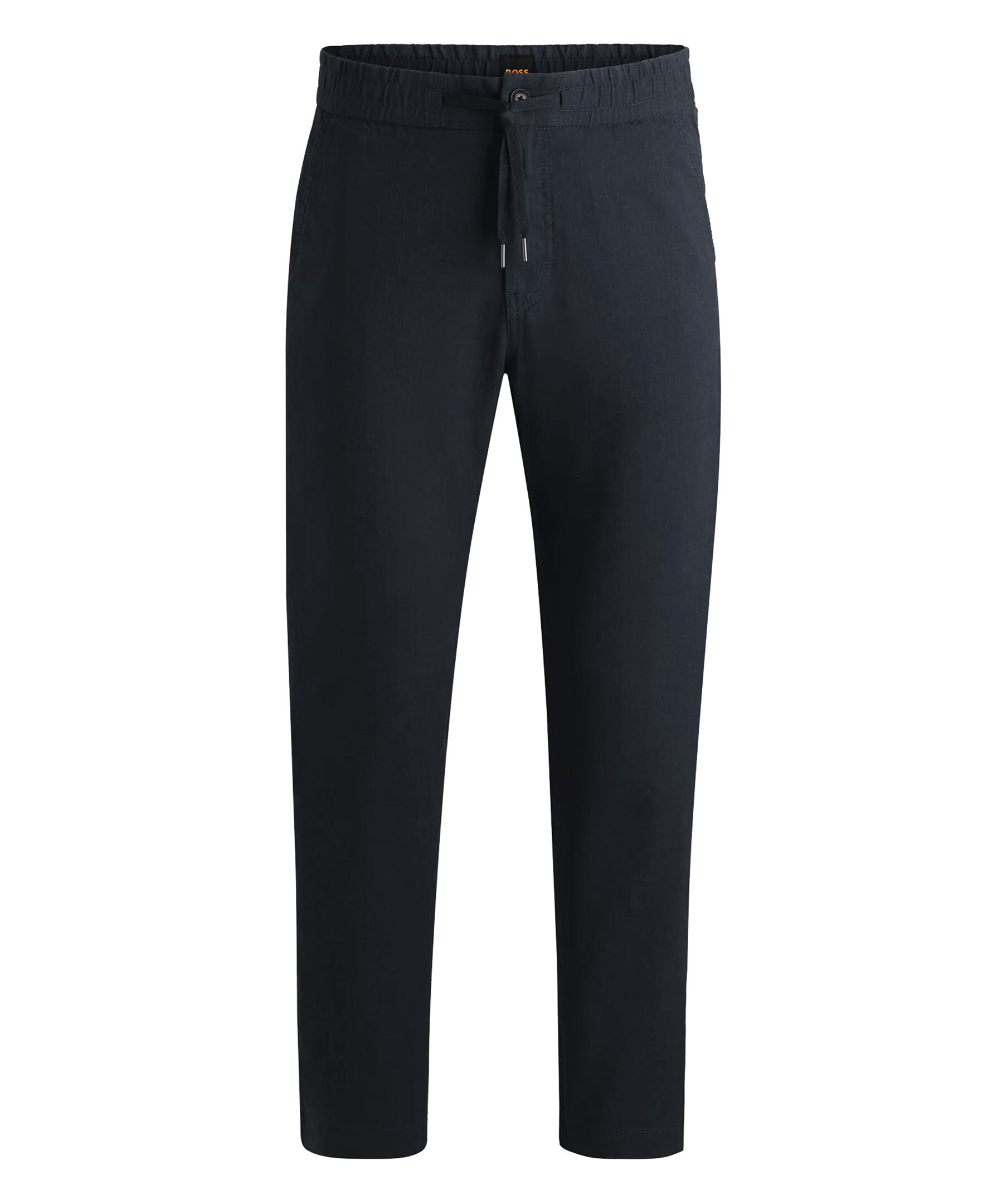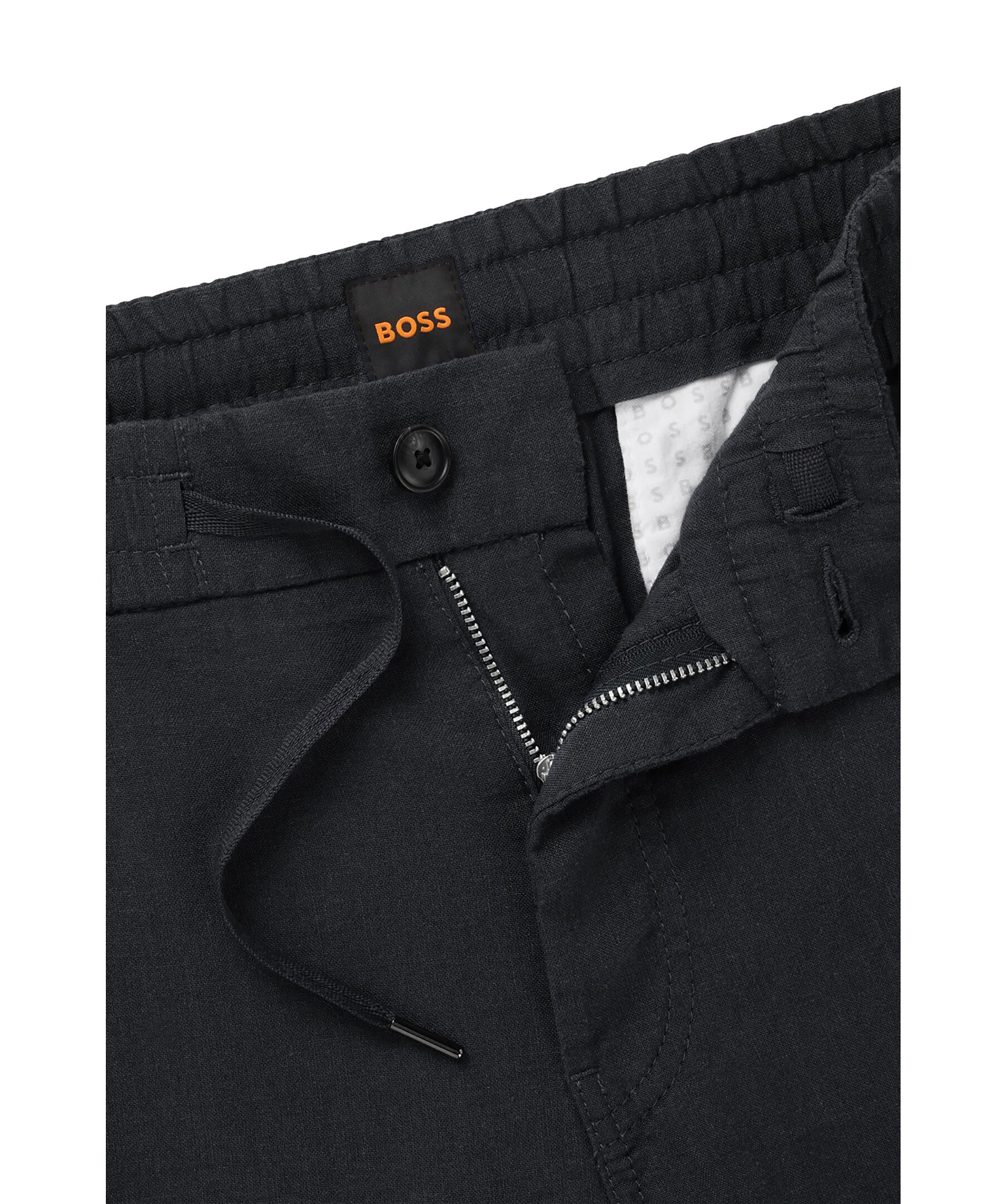 Svarta byxor från BOSS Orange. Byxorna har elastisk midja med snörning, två sidfickor, två passpoalfickor baktill och gummerad logotyp baktill. Tillverkade i en linneblandning.