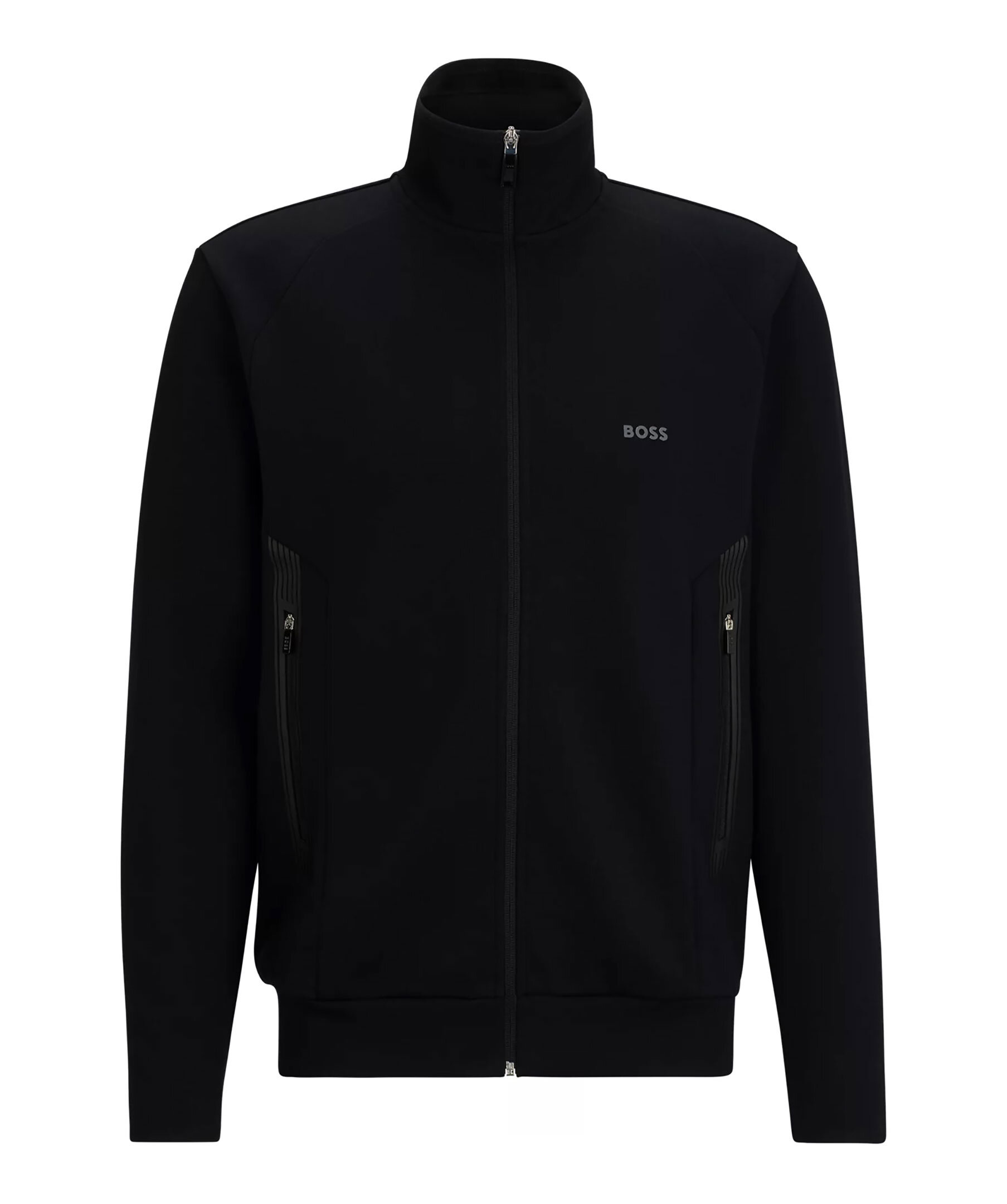 Svart zip-up tracksuitjacka från BOSS Green. Stängs med dragkedja framtill och har liten logotyp på bröstet. Tillverkad i en bomulls- och polyesterblandning. Två sidfickor med dragkedja och kontrastränder.