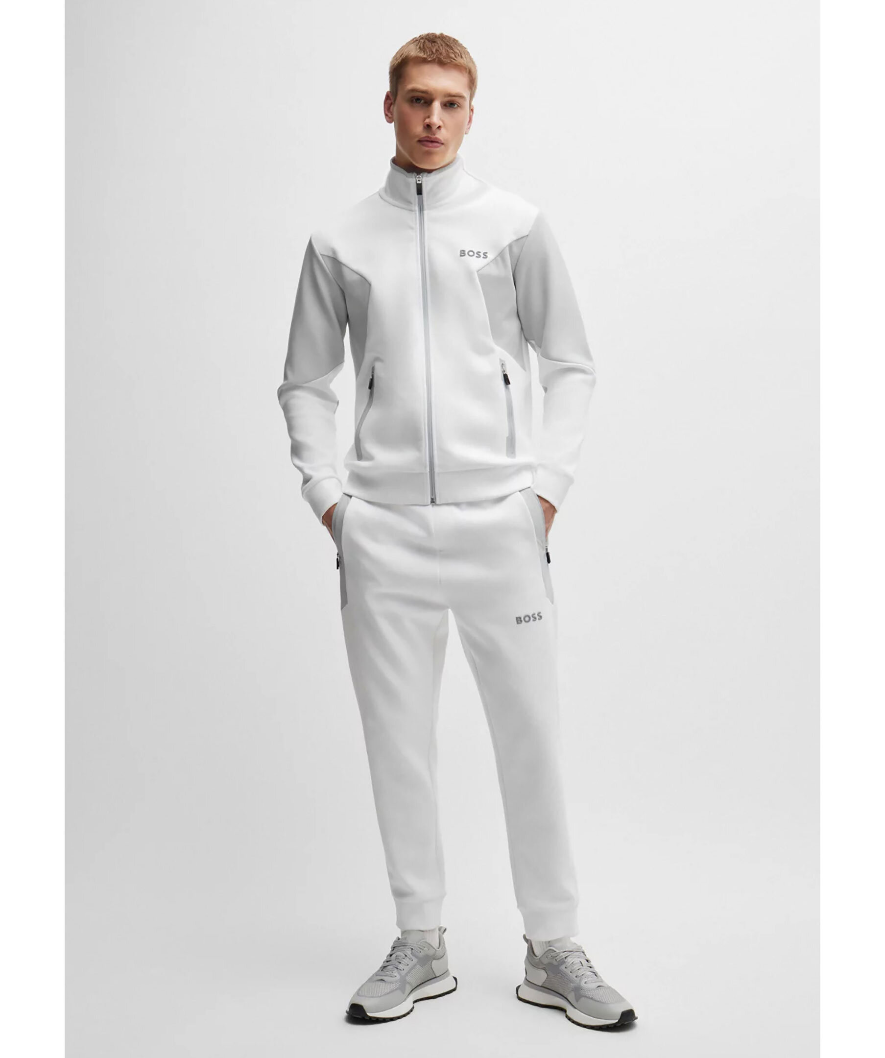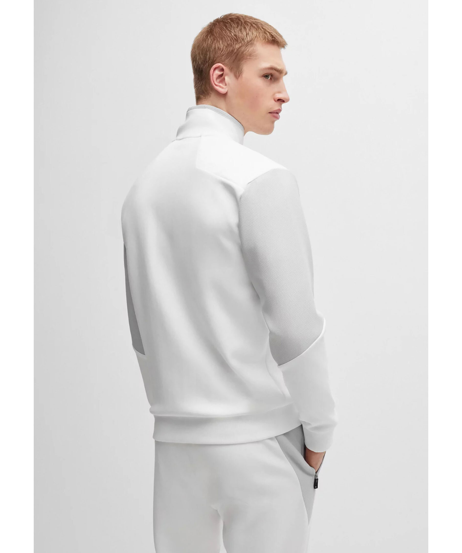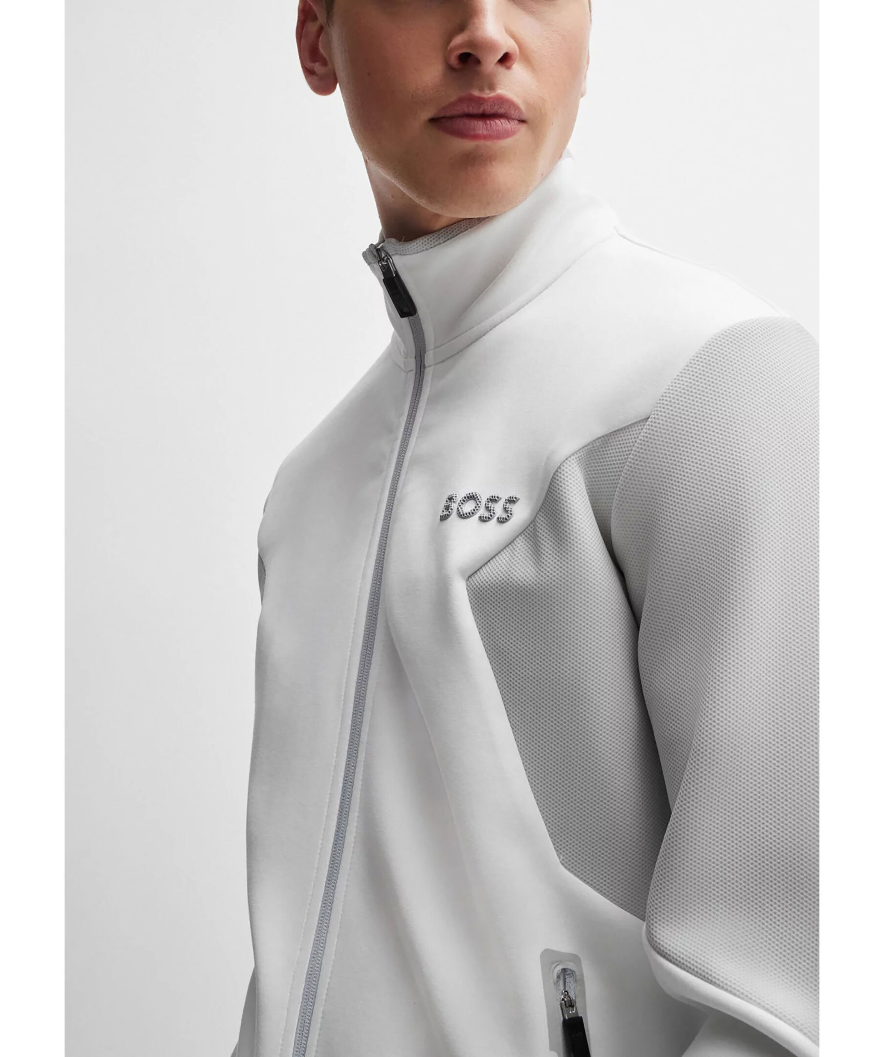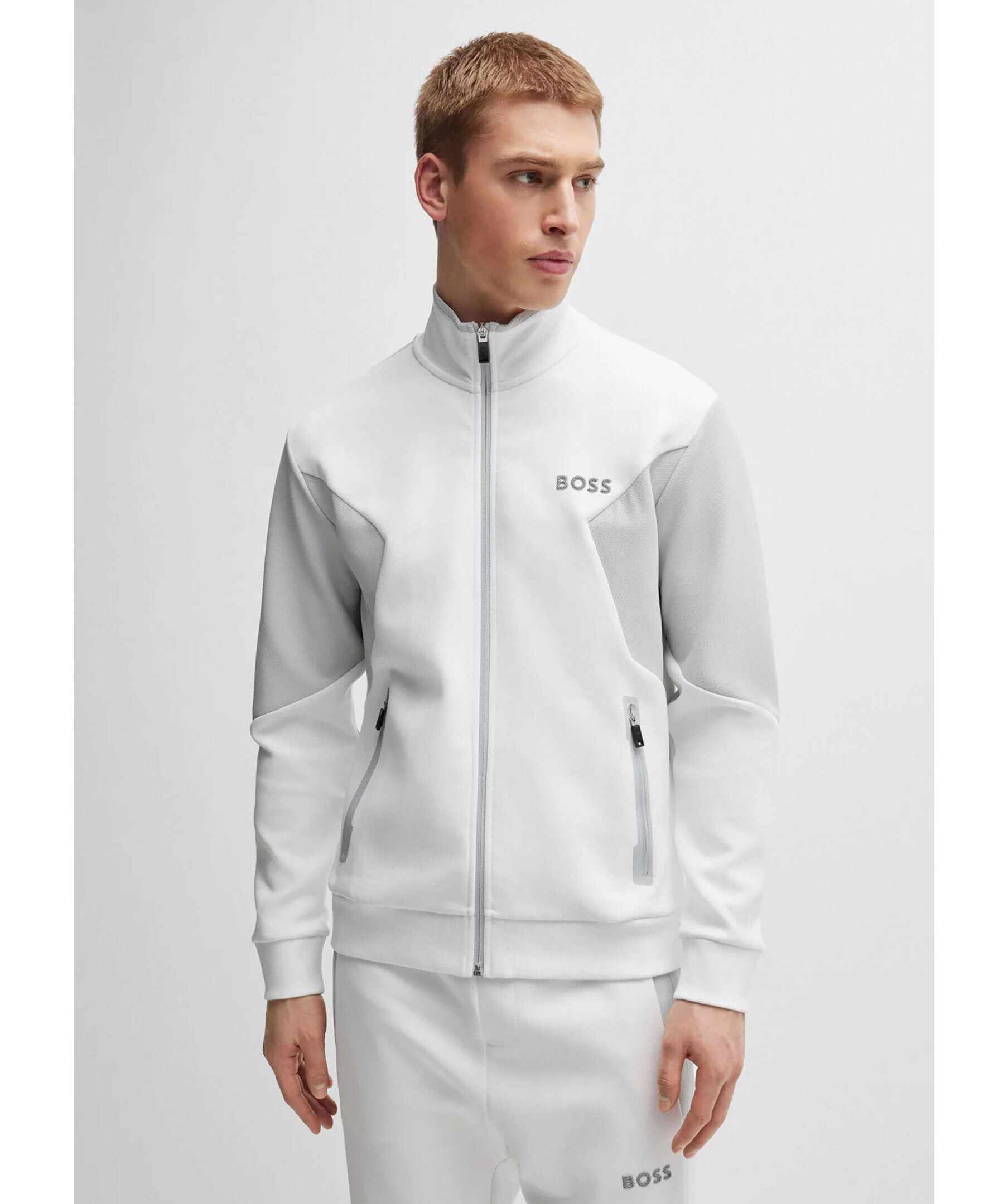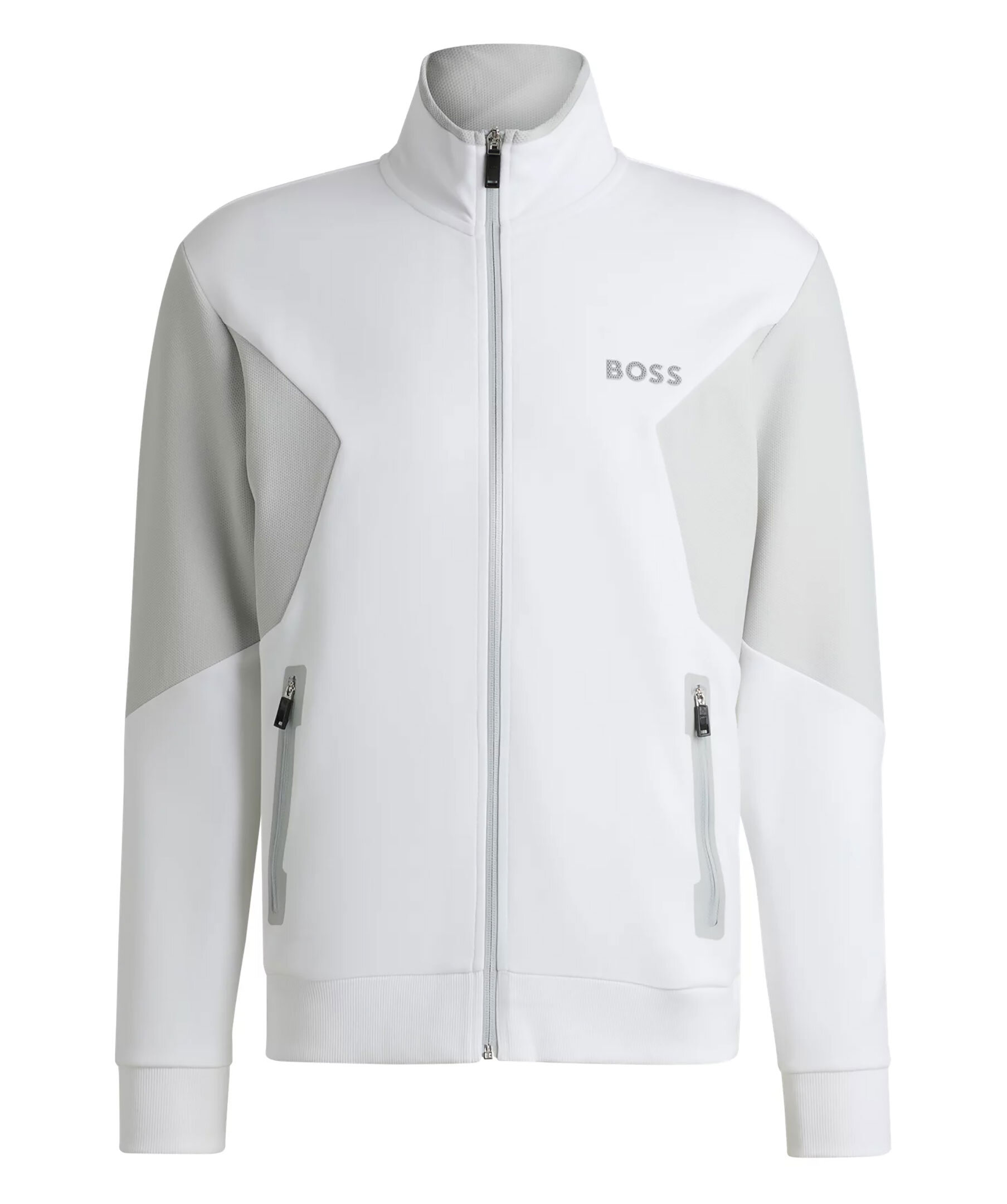Vit tracksuit jacka med gråa detaljer från BOSS Green. Stängs framtill med dragkedja. Två fickor framtill som stängs med dragkedja. Detaljer i mesh på tröjans ärmar och i sidan. Ribbstickade muddar vid ärm- och plaggslut. Gummerad logotyp vid bröstet. Tillverkad i bommullsblandning.