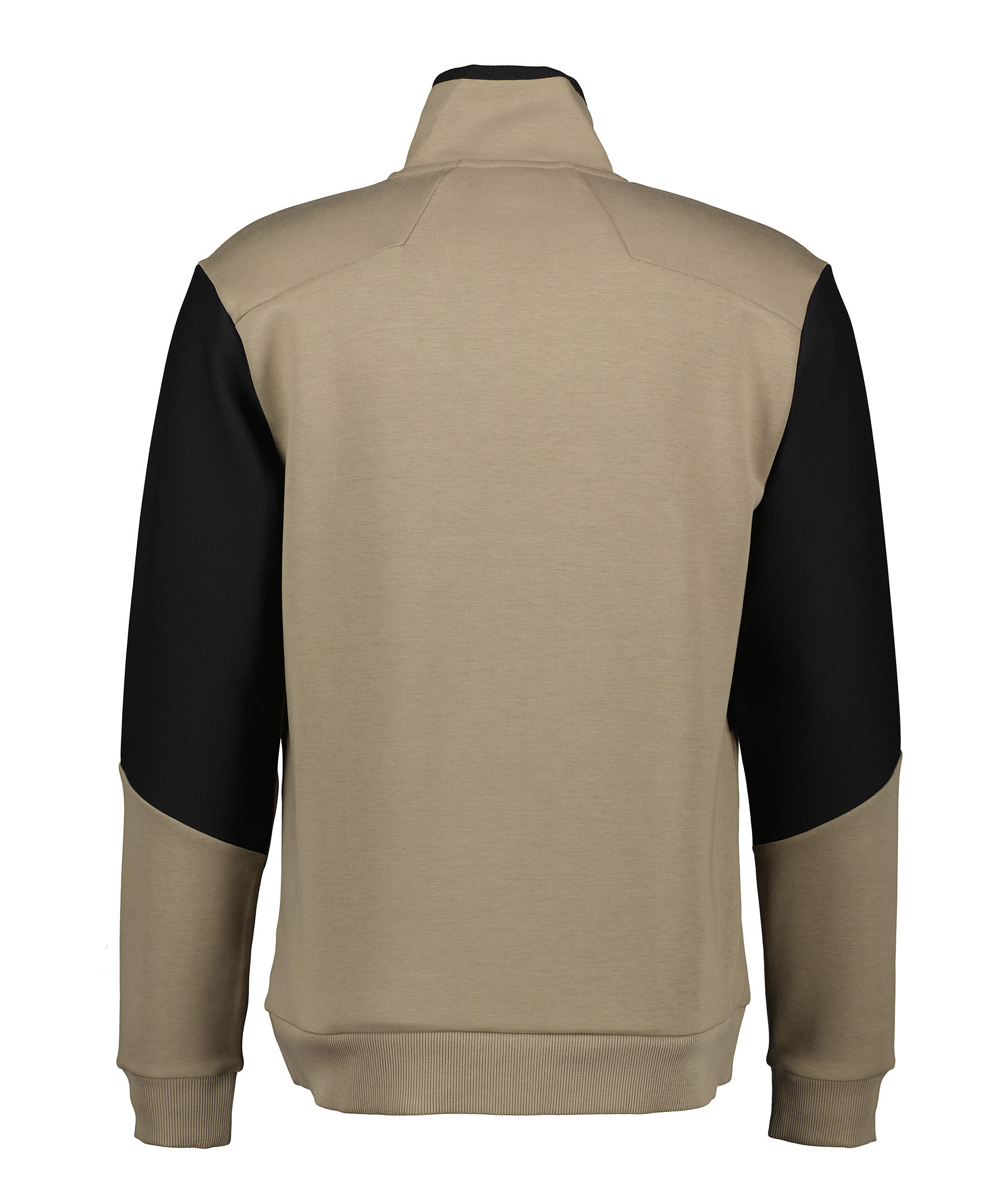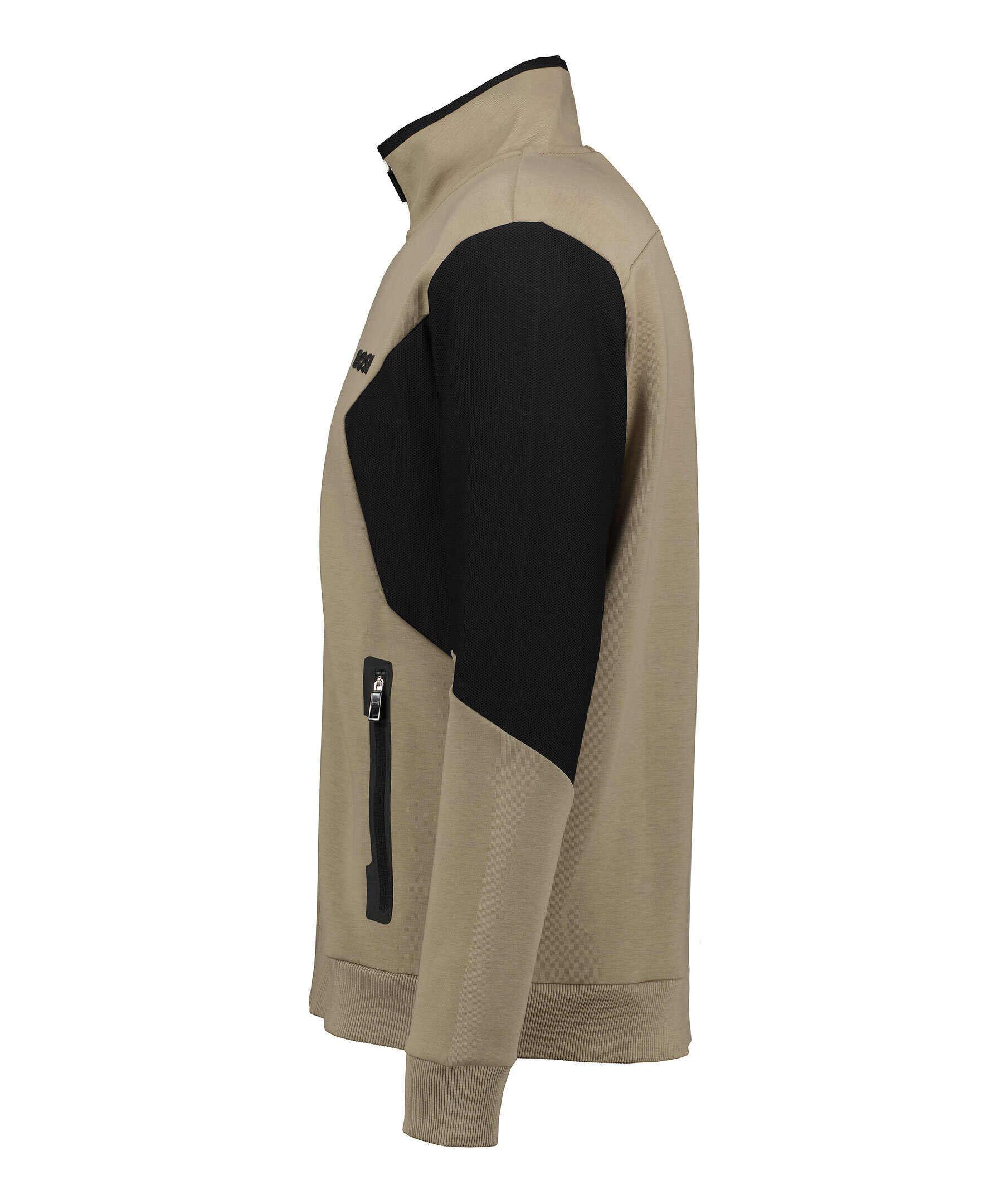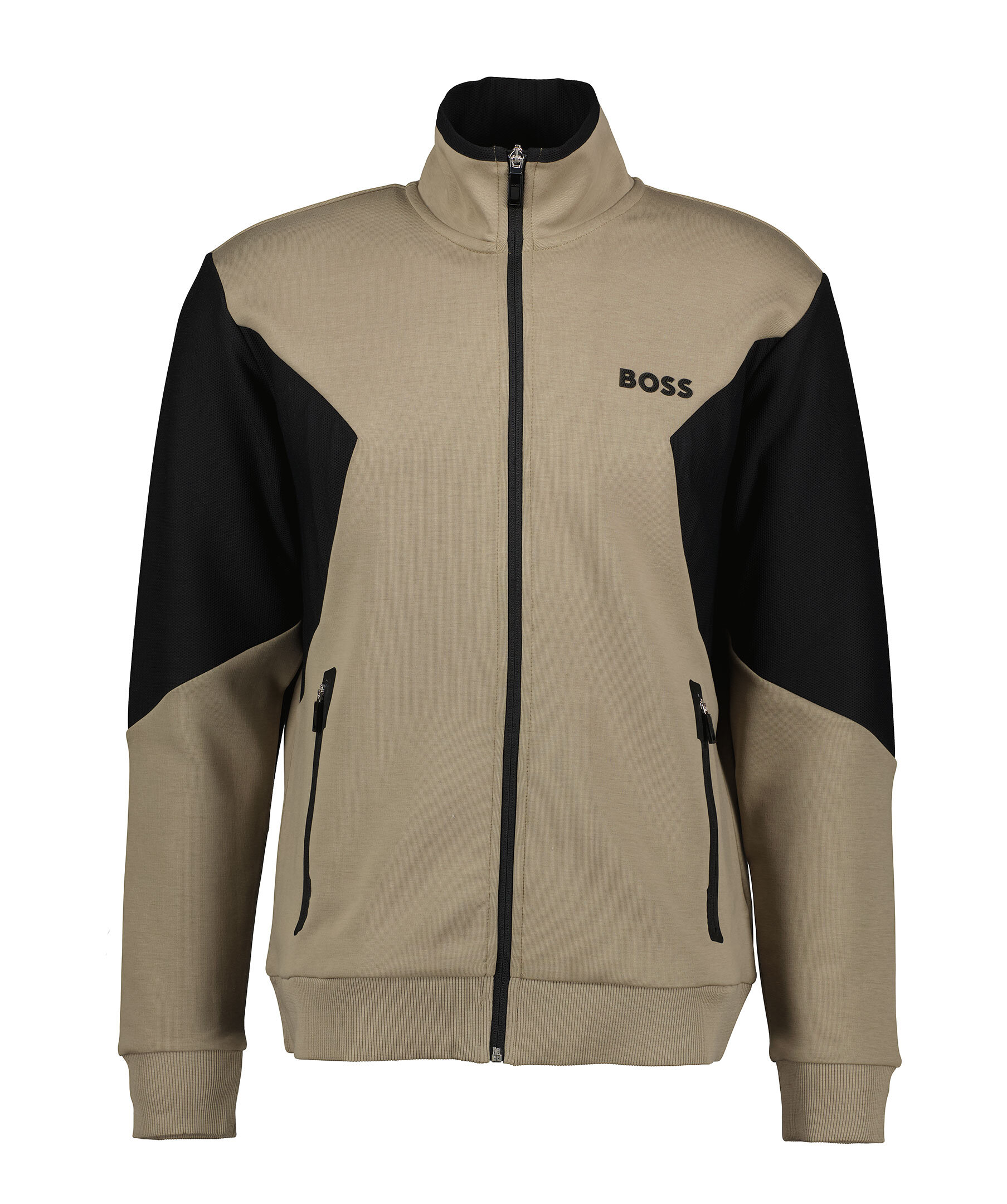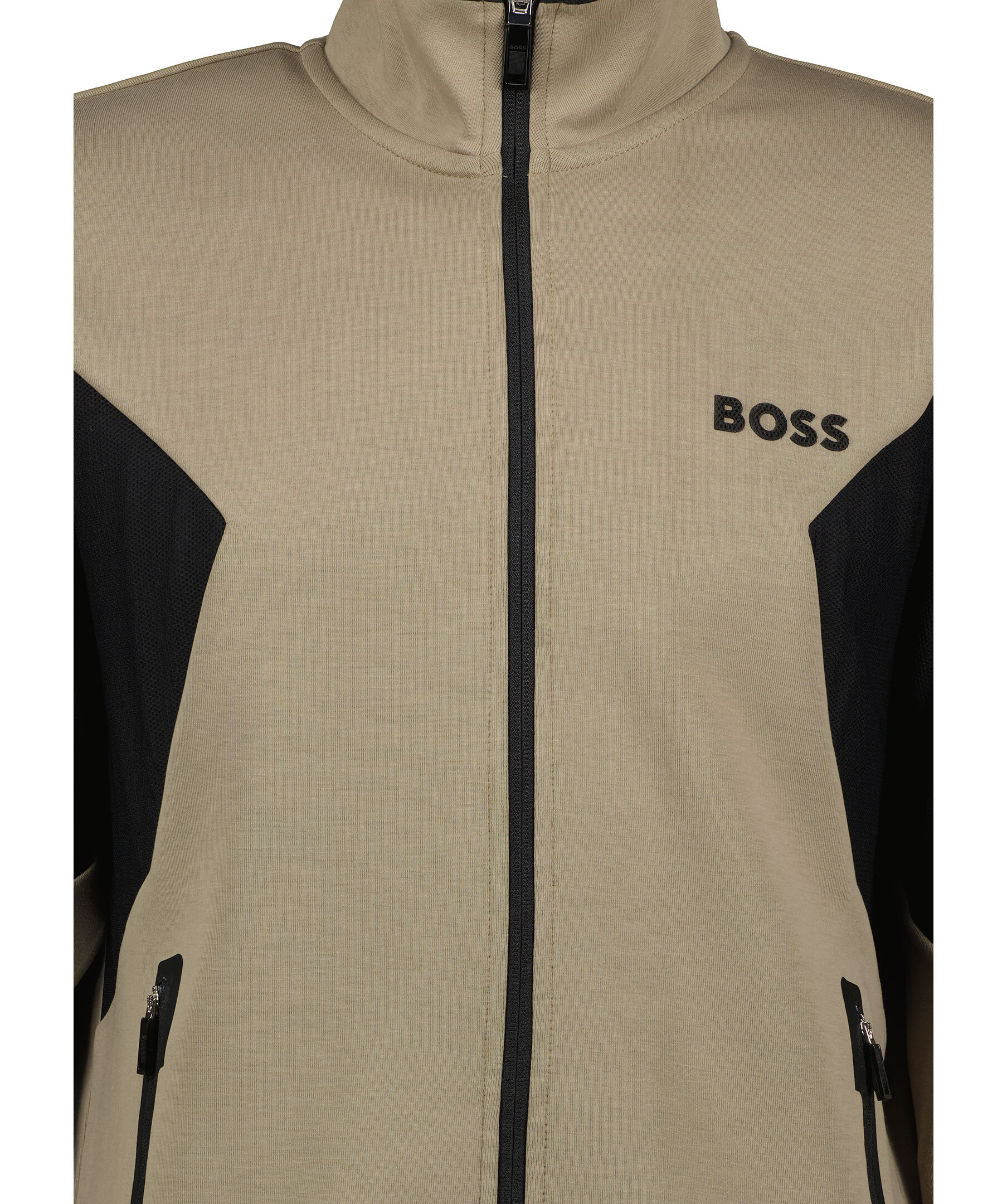 Greige tracksuit jacka med svarta detaljer från BOSS Green. Stängs framtill med dragkedja. Två fickor framtill som stängs med dragkedja. Detaljer i mesh på tröjans ärmar och i sidan. Ribbstickade muddar vid ärm- och plaggslut. Gummerad logotyp vid bröstet. Tillverkad i bommullsblandning.
