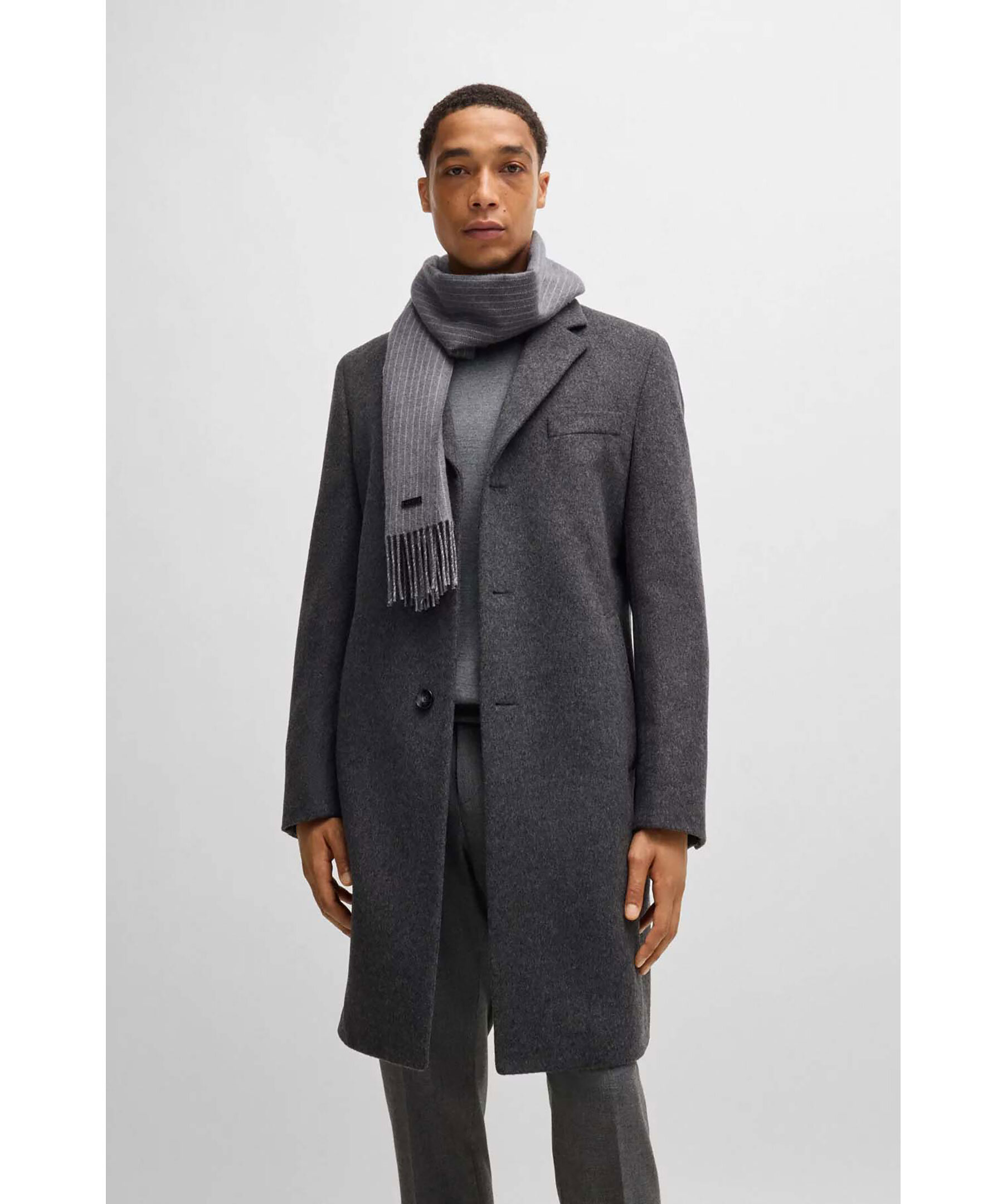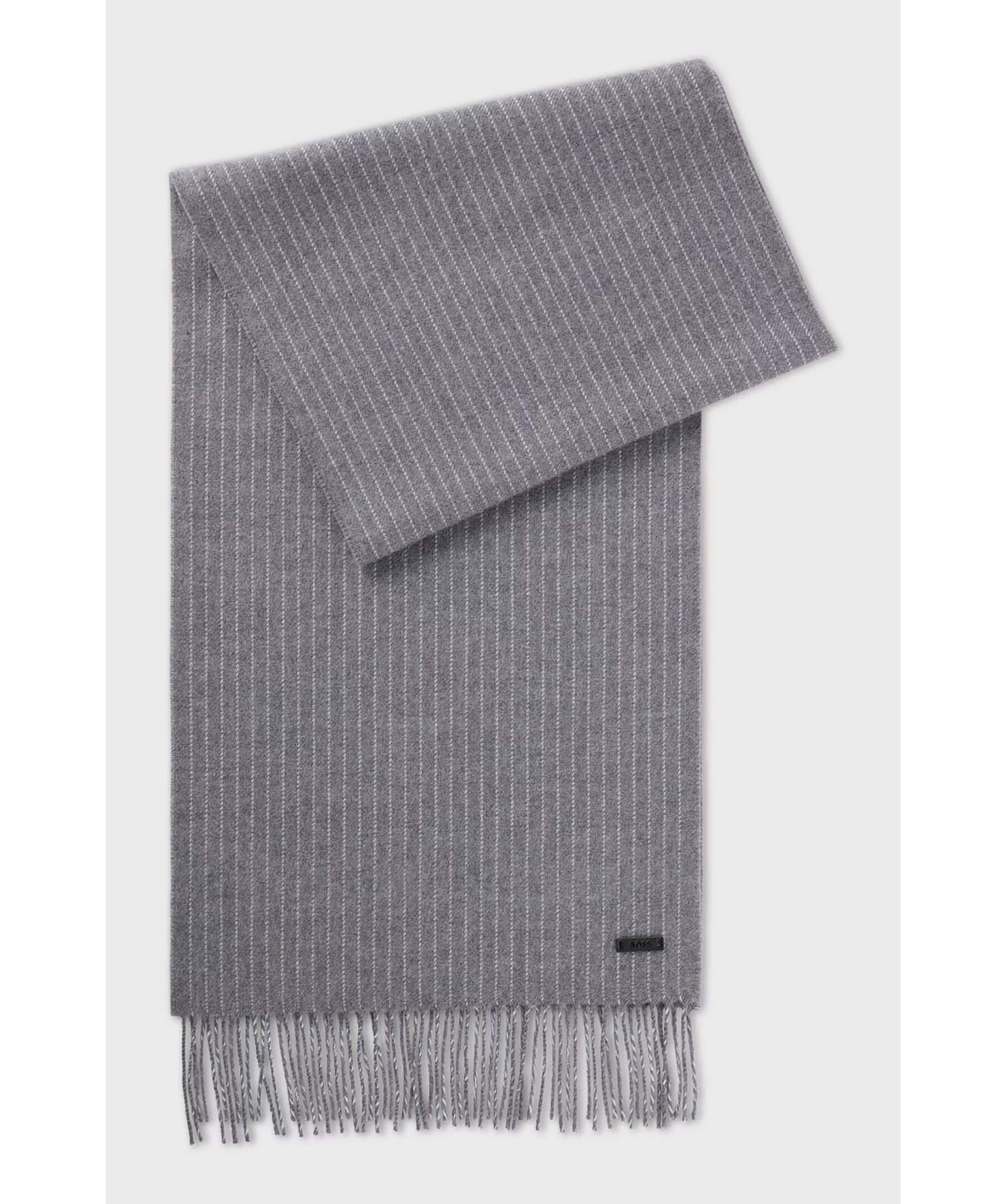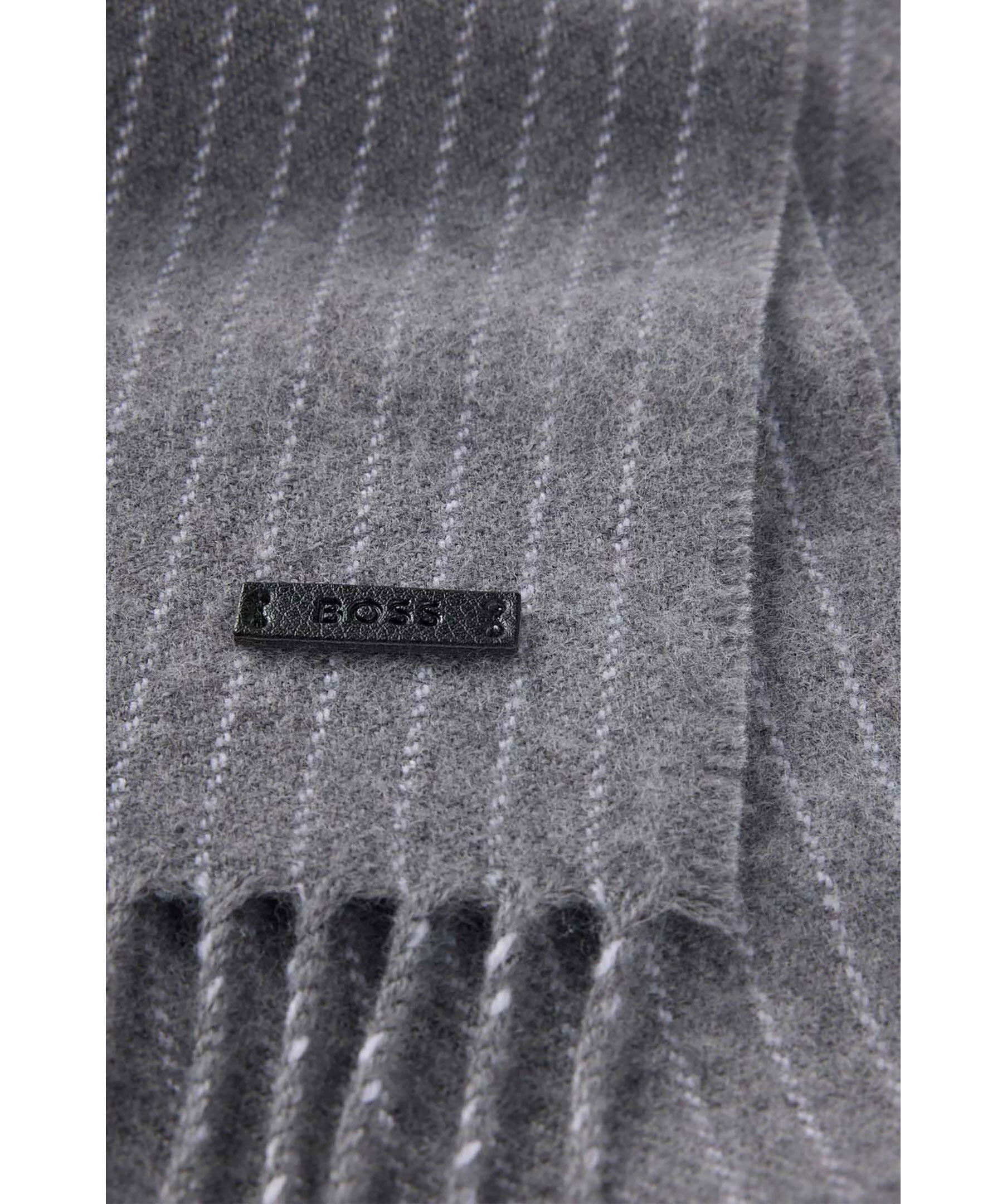 Grå halsduk från Boss Black. Halsduken har vridna fransar och ett randigt mönster. Längst ned finns en läderliknande patch med logotyp. Tillverkad av 100% ull.