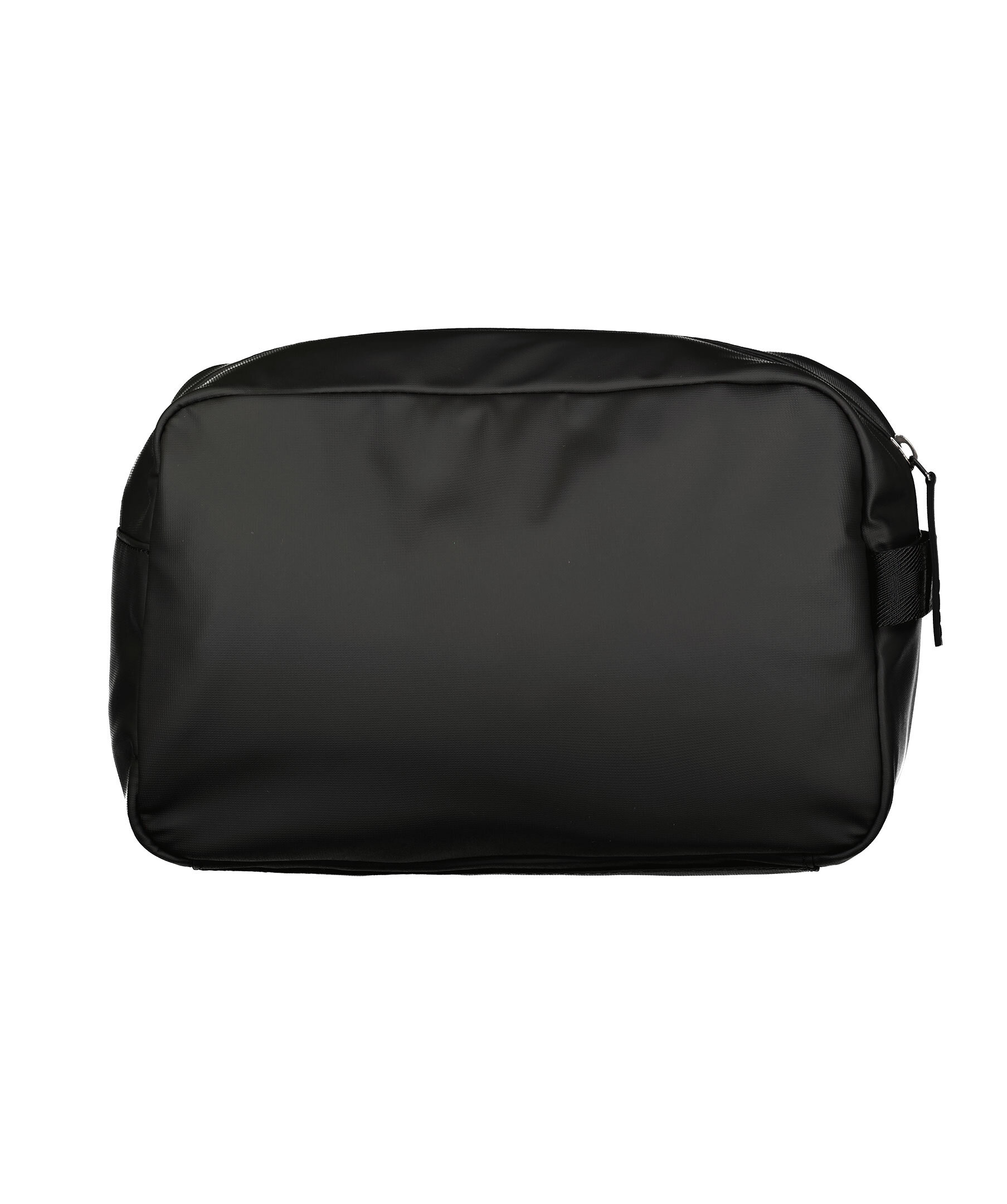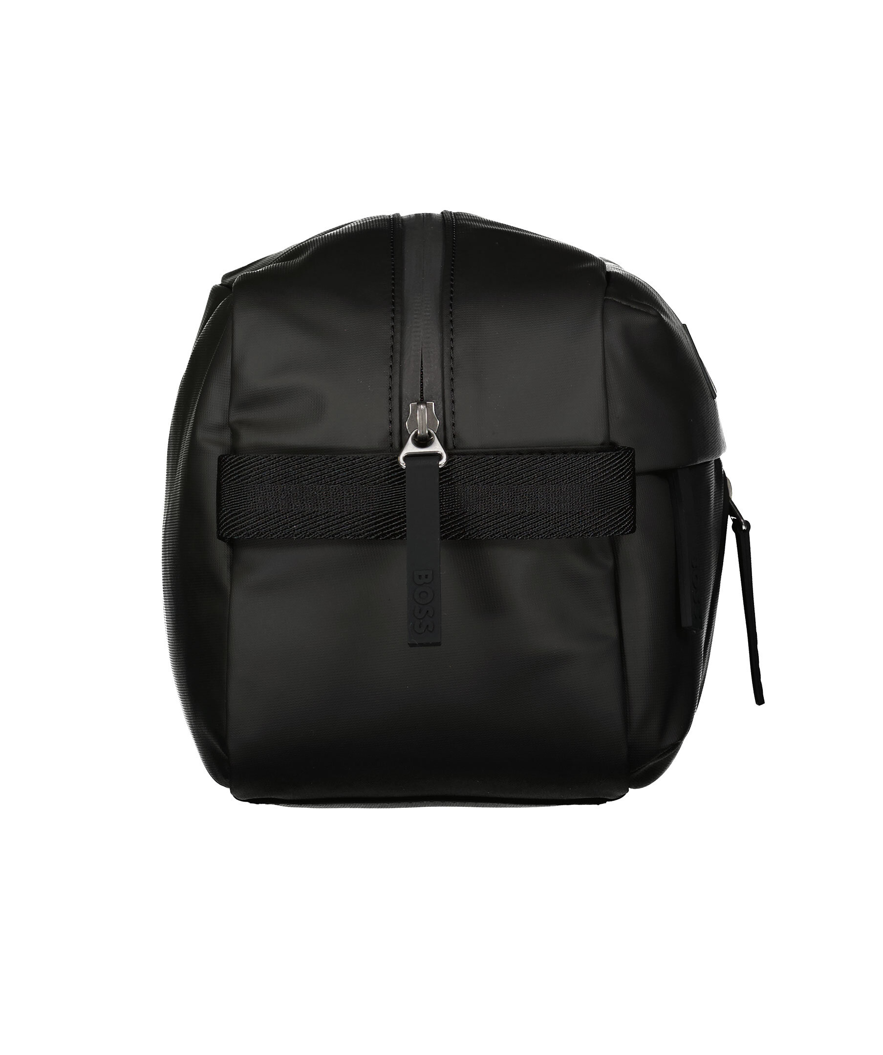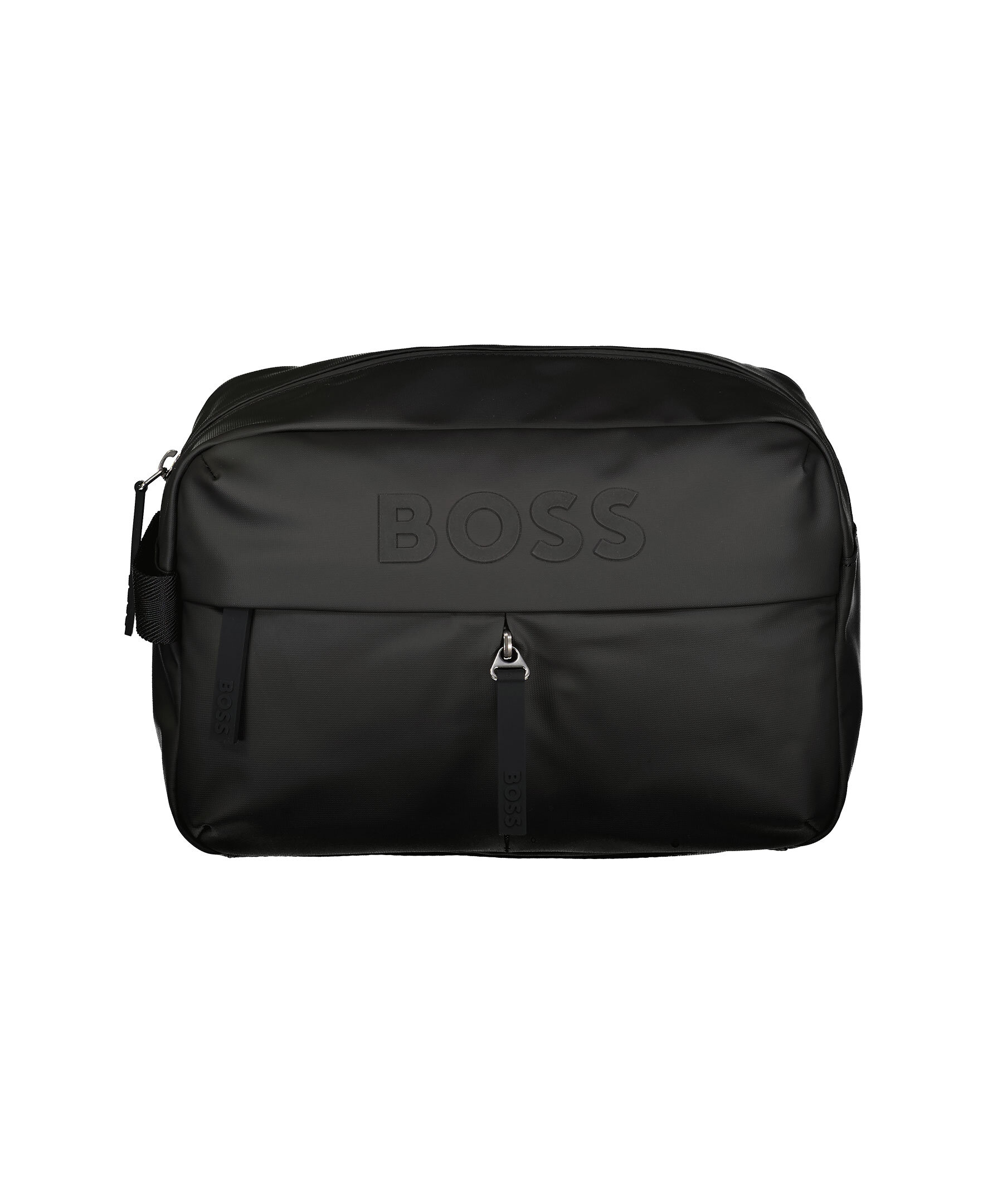 Svart necessär från Hugo Boss. Necessären har förutom blixtlås på ovansidan även två blixtlås med fack på framsidan, ena löper vågrätt längst med väskan och den mindre lodrätt ned från de större facket. Svart logotyp finns på samma sida som facken medans baksidan är slät. Sidohantag i tyg, på insidan finns ett fack. Necessären är tillverkad av polyamider och rymmer 4l.