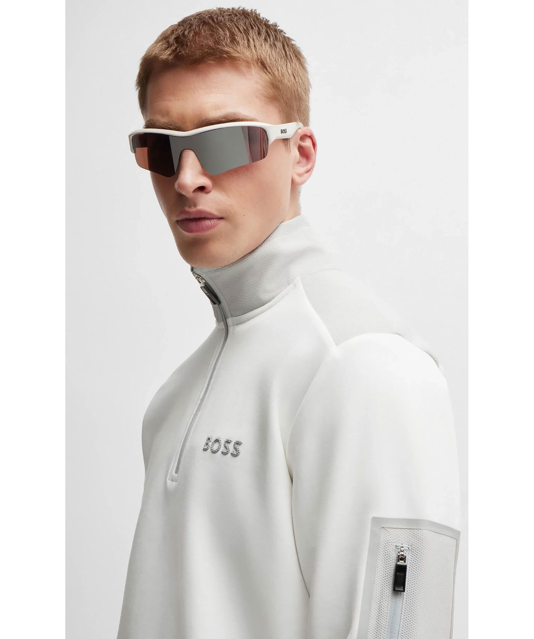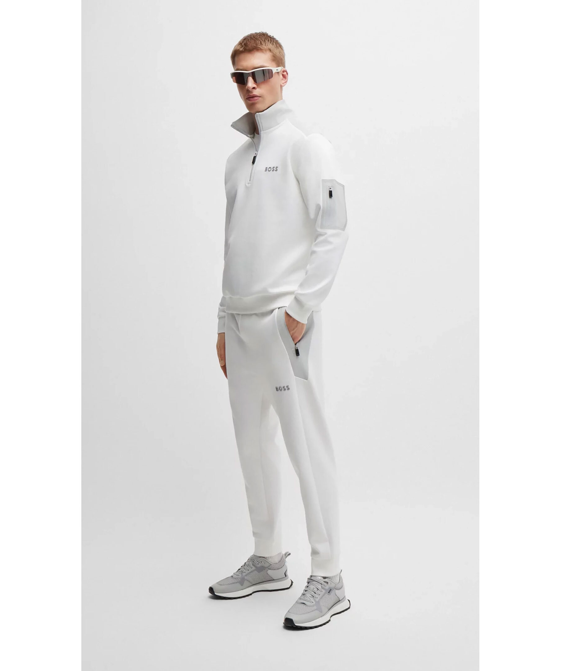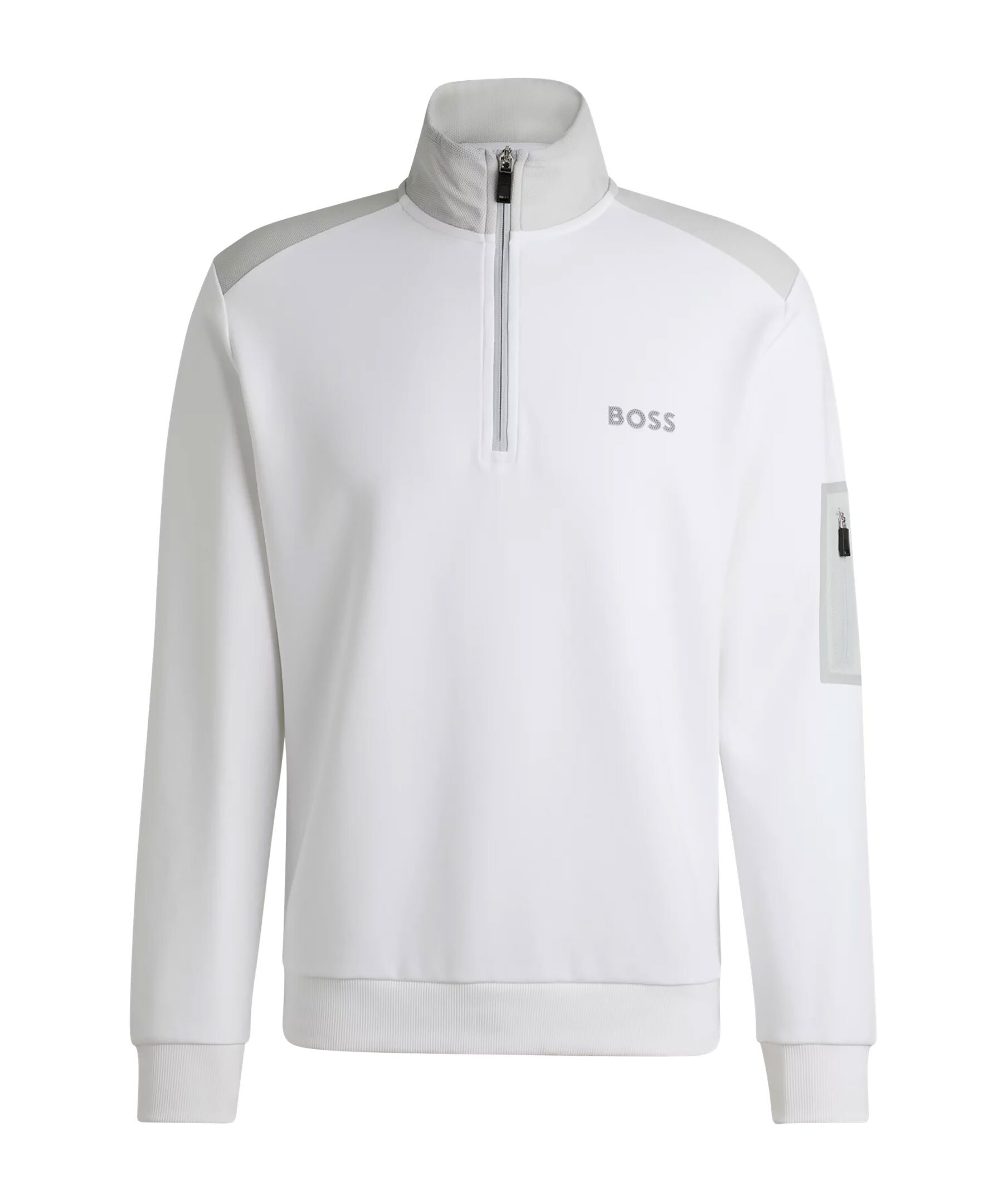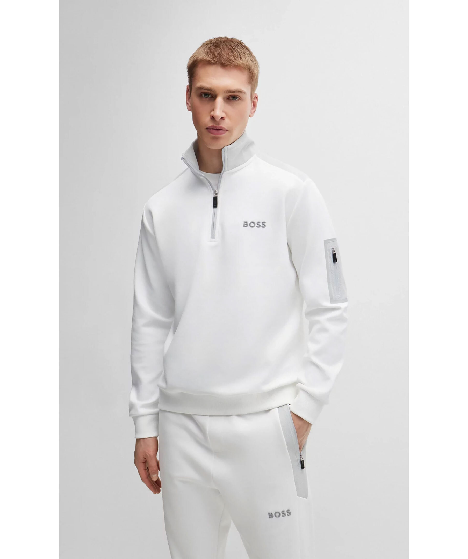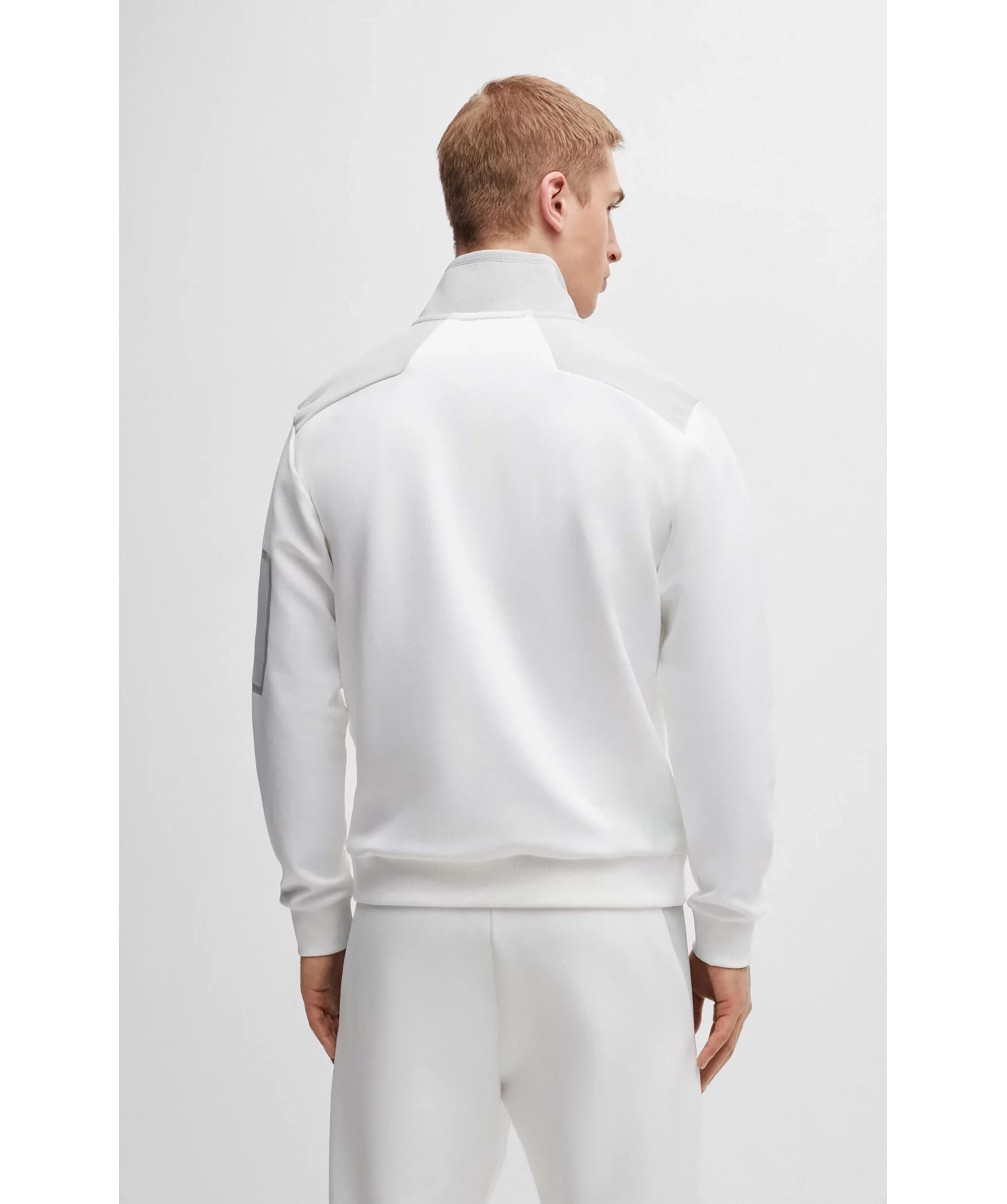 Vit tracksuit tröja med gråa detaljer från BOSS Green. Half-zip. Gummerad logotyp på vänster bröst. Detaljer i mesh-material. Ficka på vänster ärm som stängs med dragkedja. Ribbstickade muddar vid ärm- och plaggslut. Tillverkad i bomullsblandning.