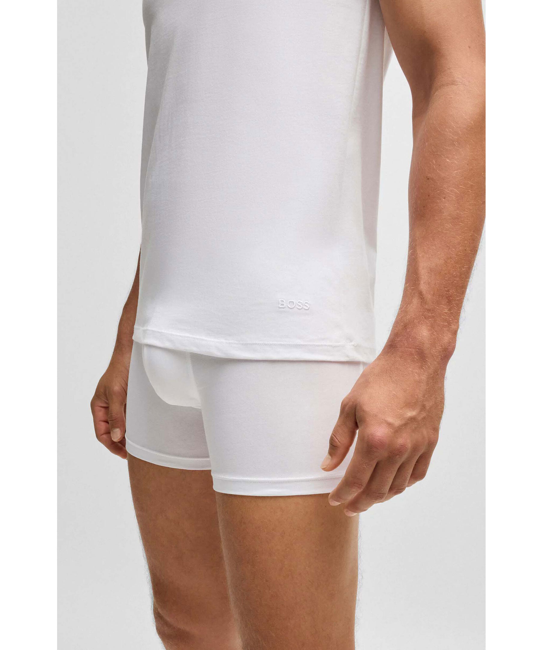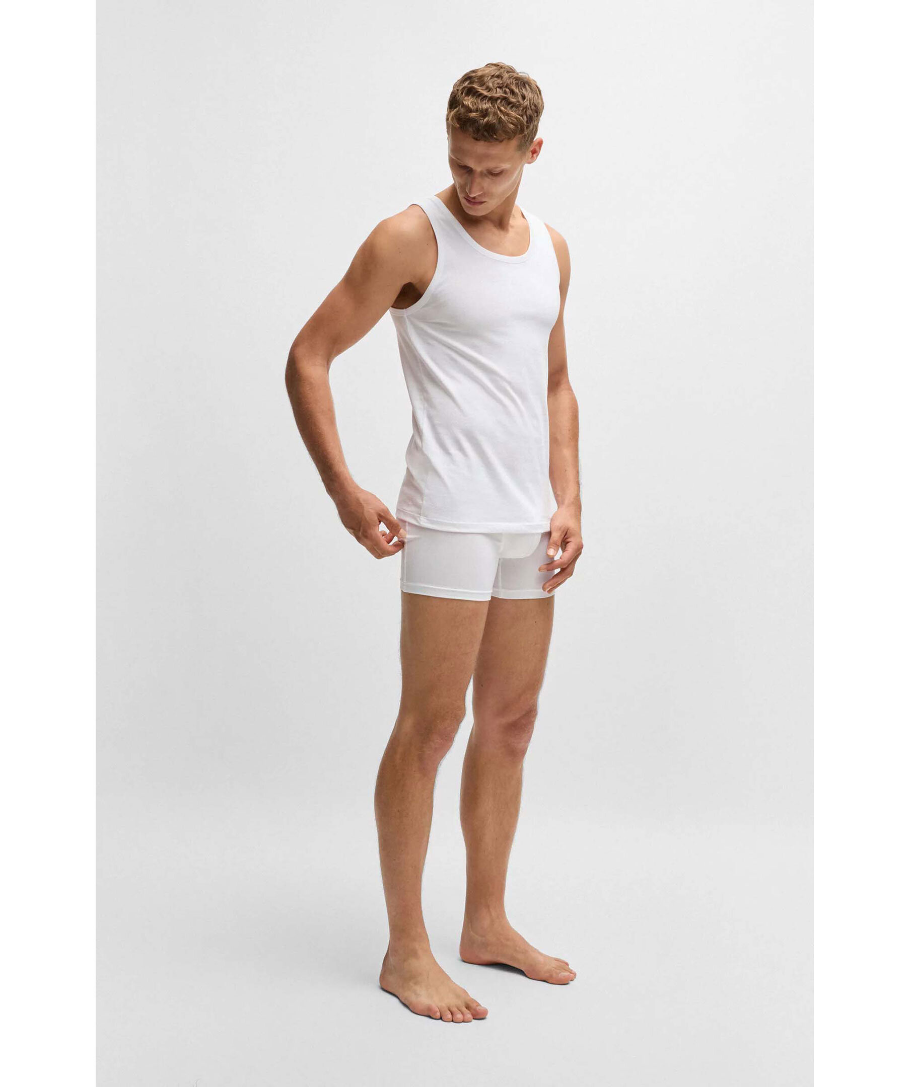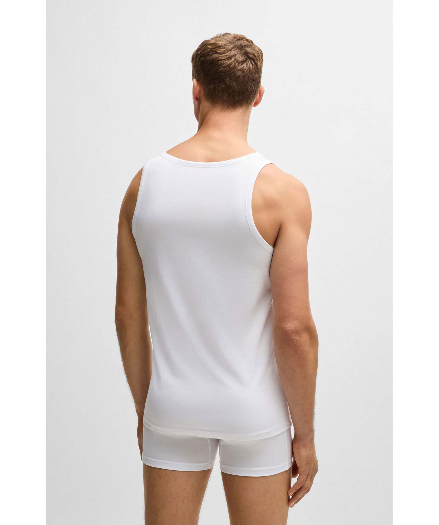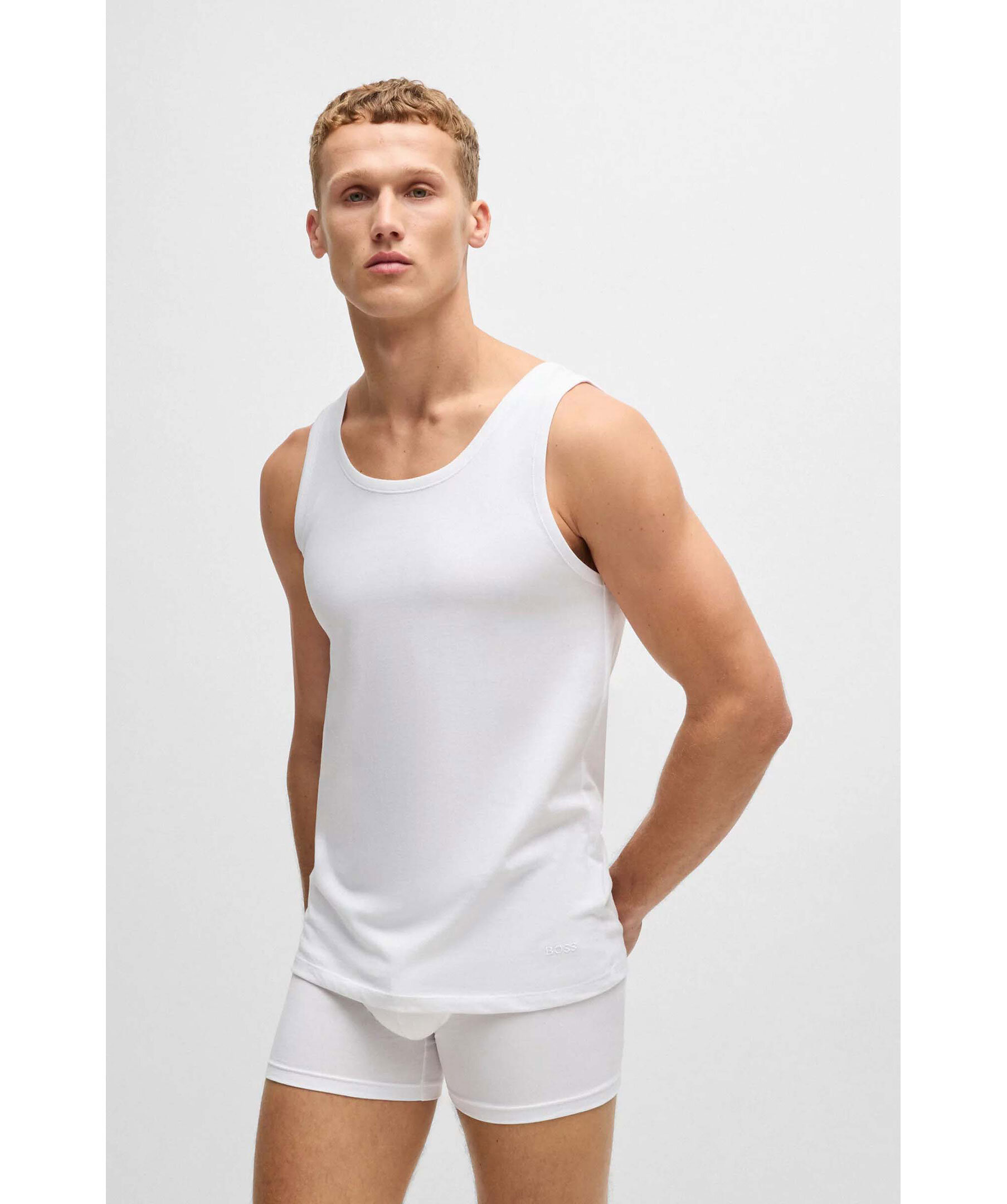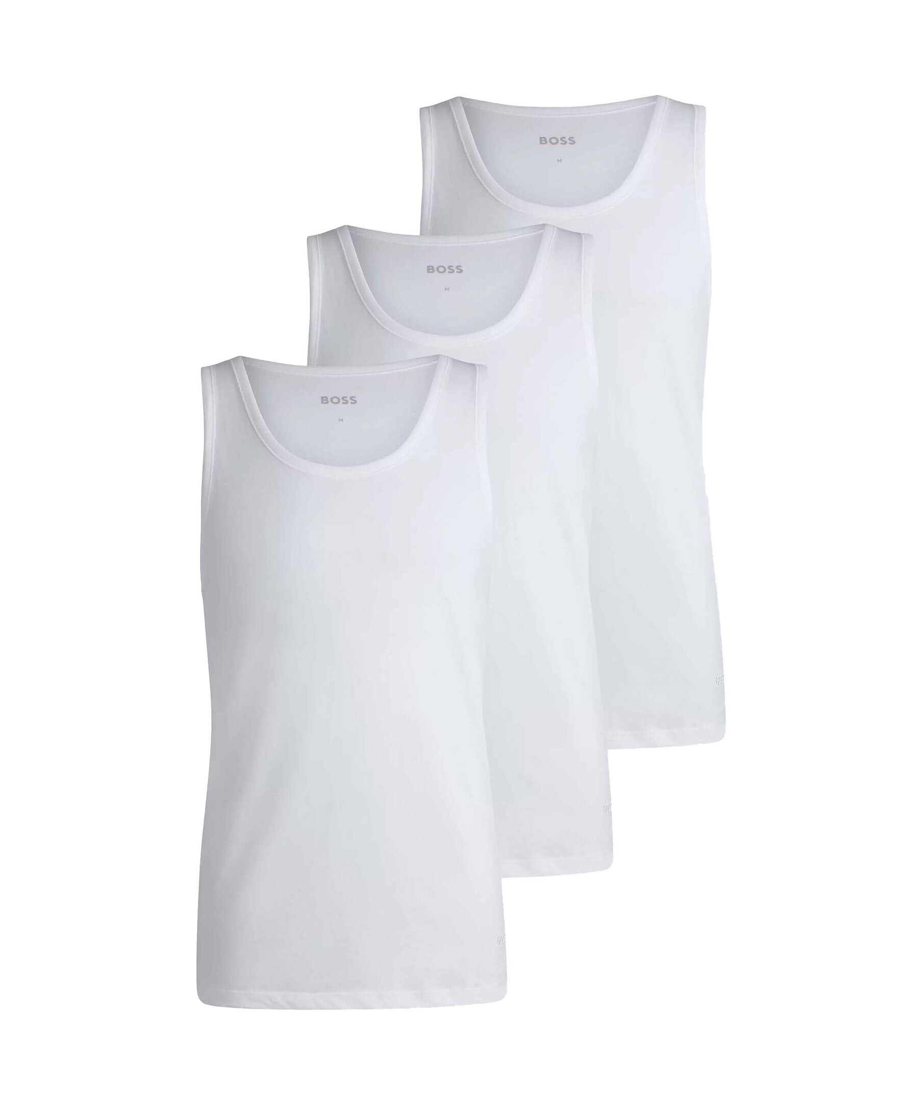 3 pack vita tank tops från BOSS Black. Linnena har rund halsringning och en ton i ton broderad logotyp vid linningen. Tillverkad av 100% bomull.